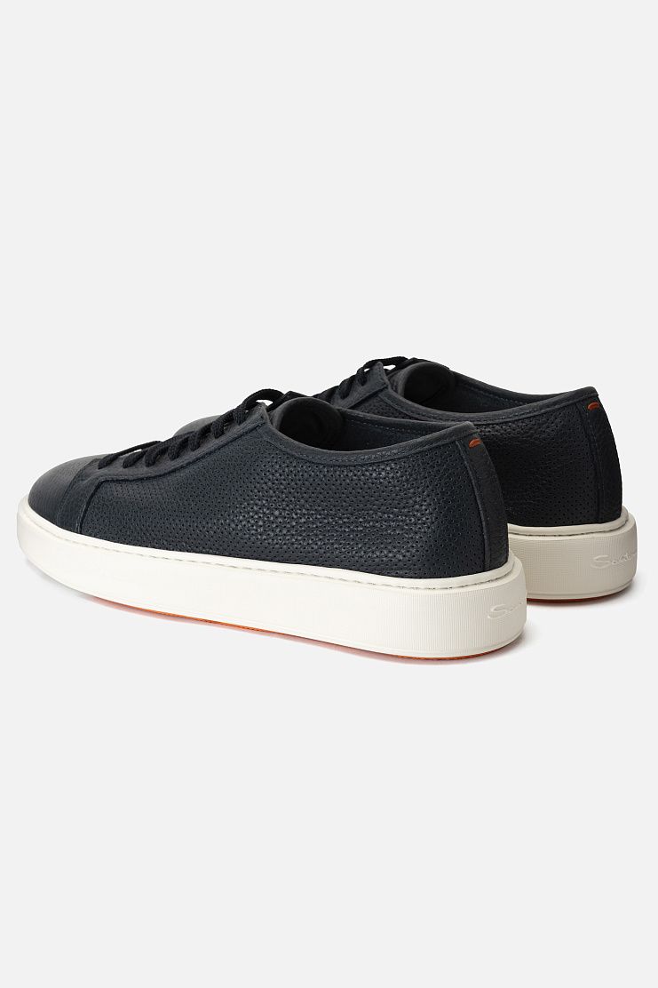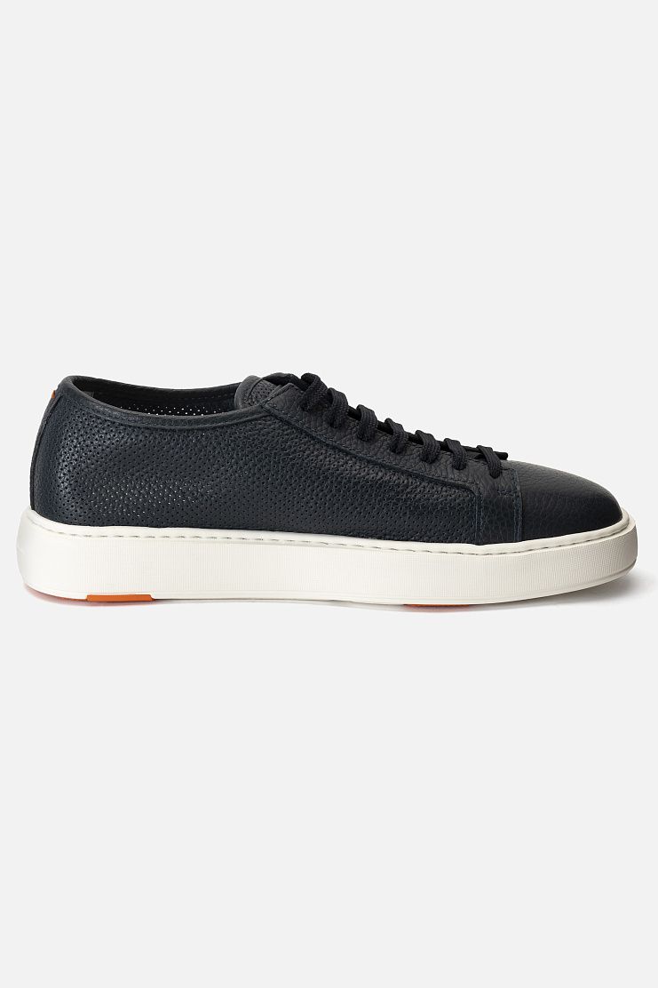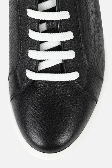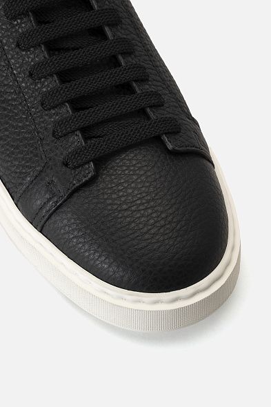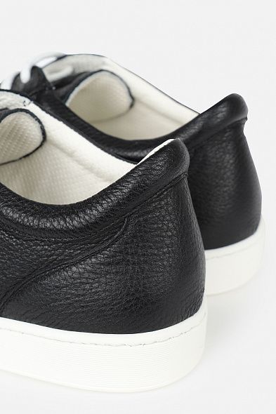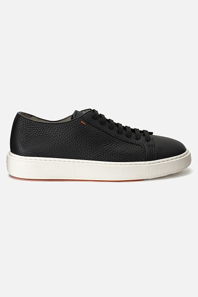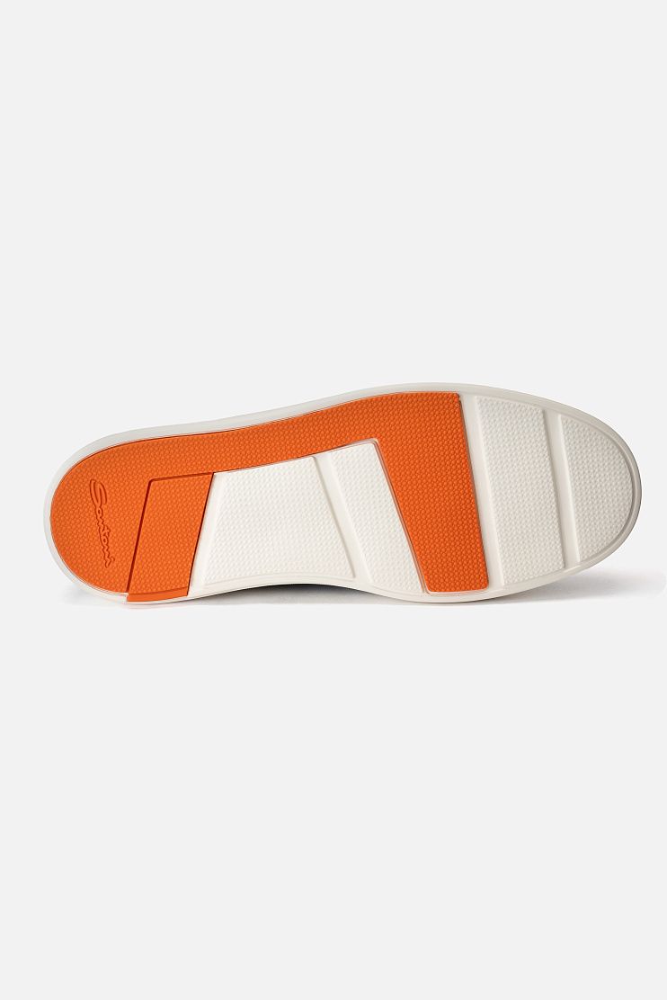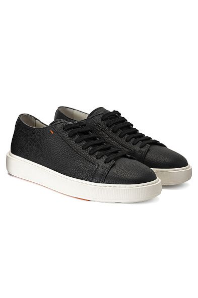 Лаконичные кеды выполнены из зернистой телячьей кожи, которая отличается прочной и устойчивой к повреждениям текстурой. Модель с широкой резиновой подошвой и шнуровкой дополнена вставками фирменного оранжевого оттенка на подошве. Перфорация на боковых частях обеспечивает циркуляцию воздуха, поэтому в кедах будет комфортно даже в жаркие дни.