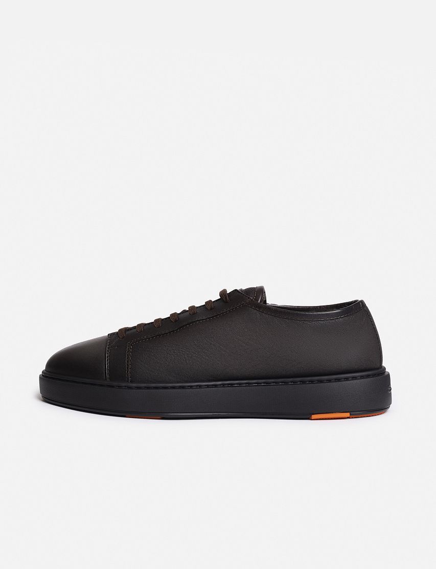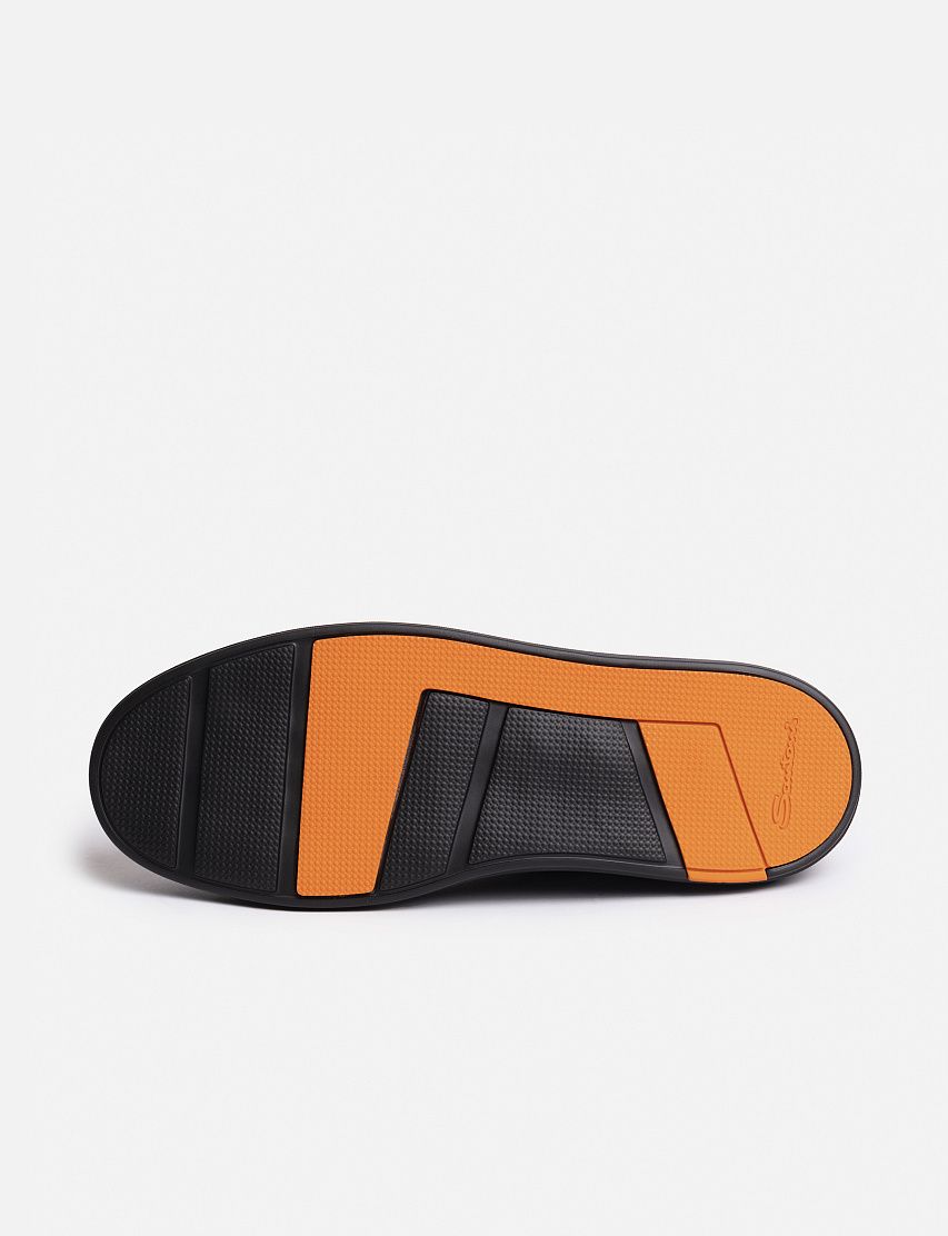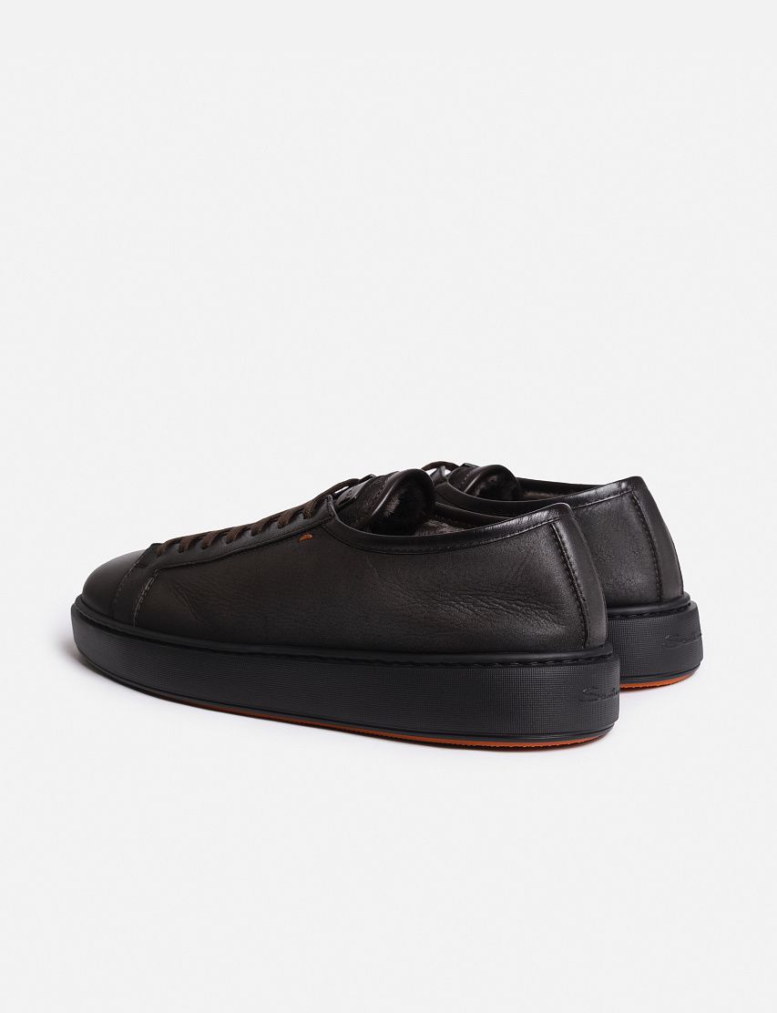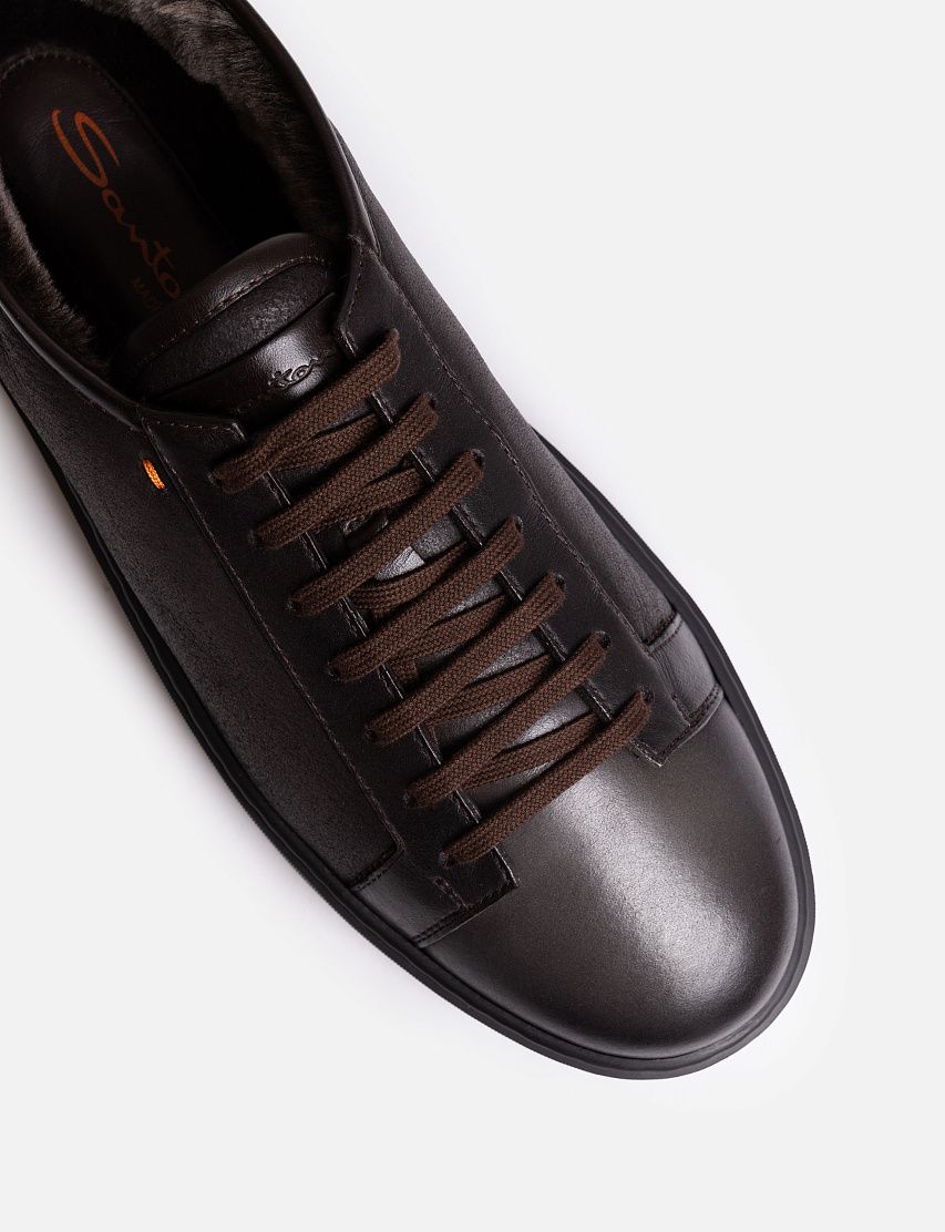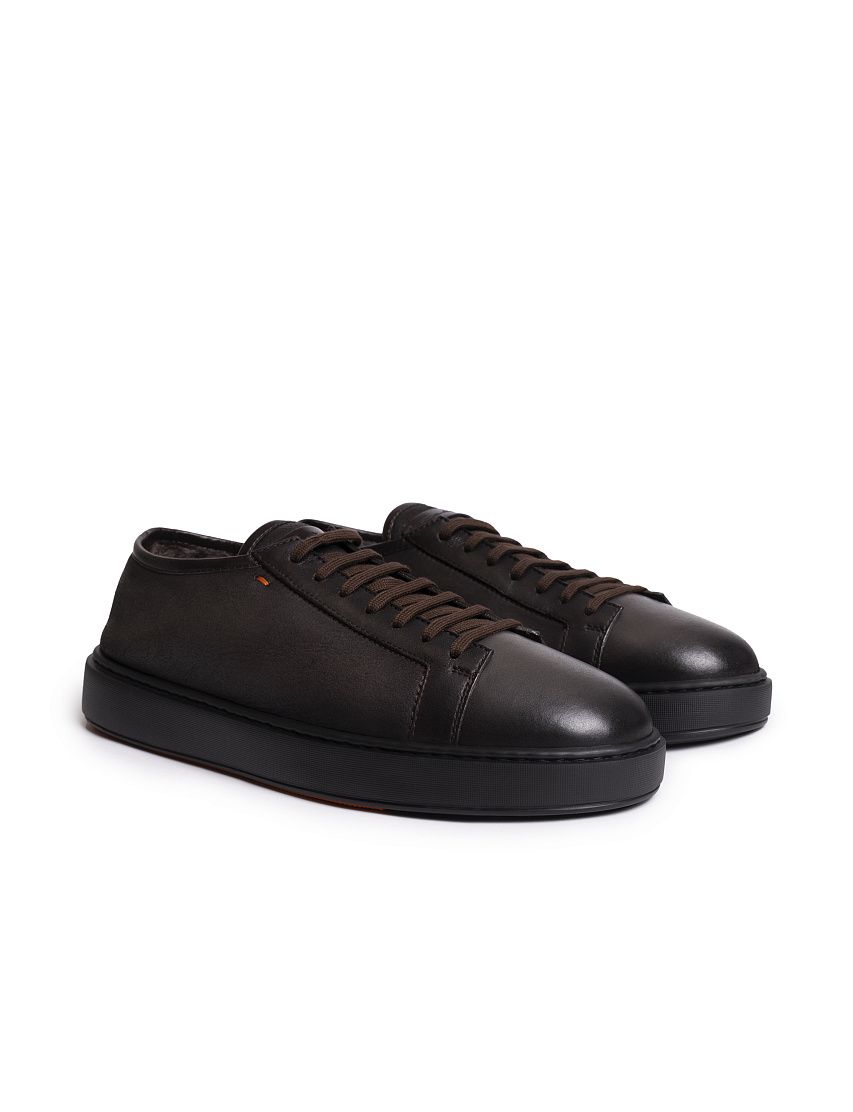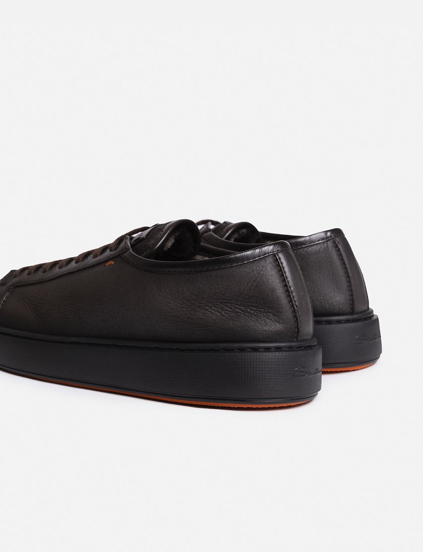 Внешнюю часть кед Cleanic изготовили из гладкой матовой кожи, а внутри отделали мягкой овчиной с густым ворсом. Закругленный мыс модели отполировали до глянцевого блеска. Пара на шнуровке отличается сплошной резиновой подошвой в тон с вставками фирменного оттенка Arancio Santoni.