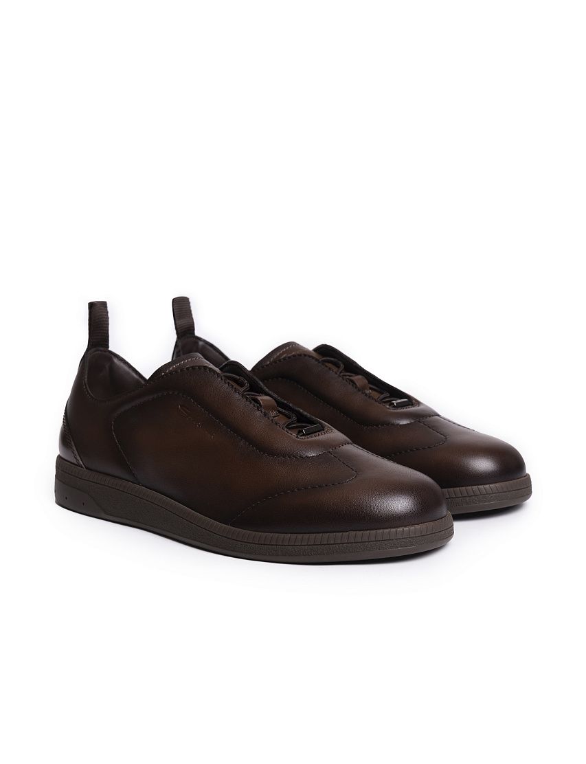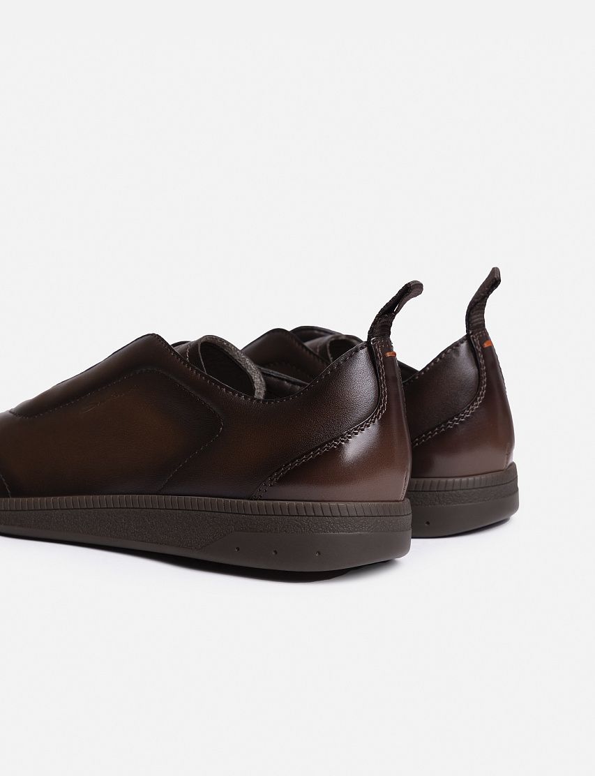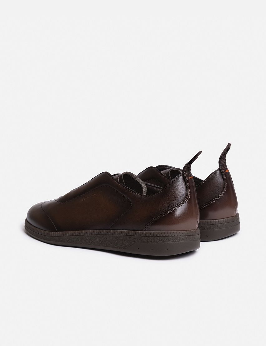 Для изготовления этой пары мастера Santoni использовали гладкую телячью кожу. Модель на резиновой подошве в тон дополнена эластичной шнуровкой и петлей на отполированном до блеска заднике. Тисненый логотип и стежок оттенка Arancio Santoni показывают принадлежность к бренду.
