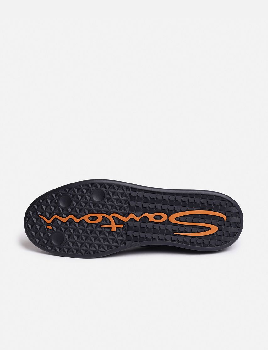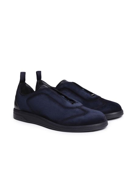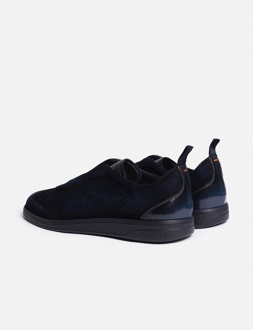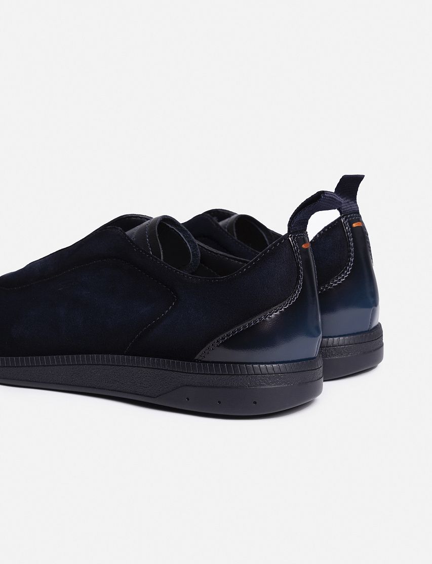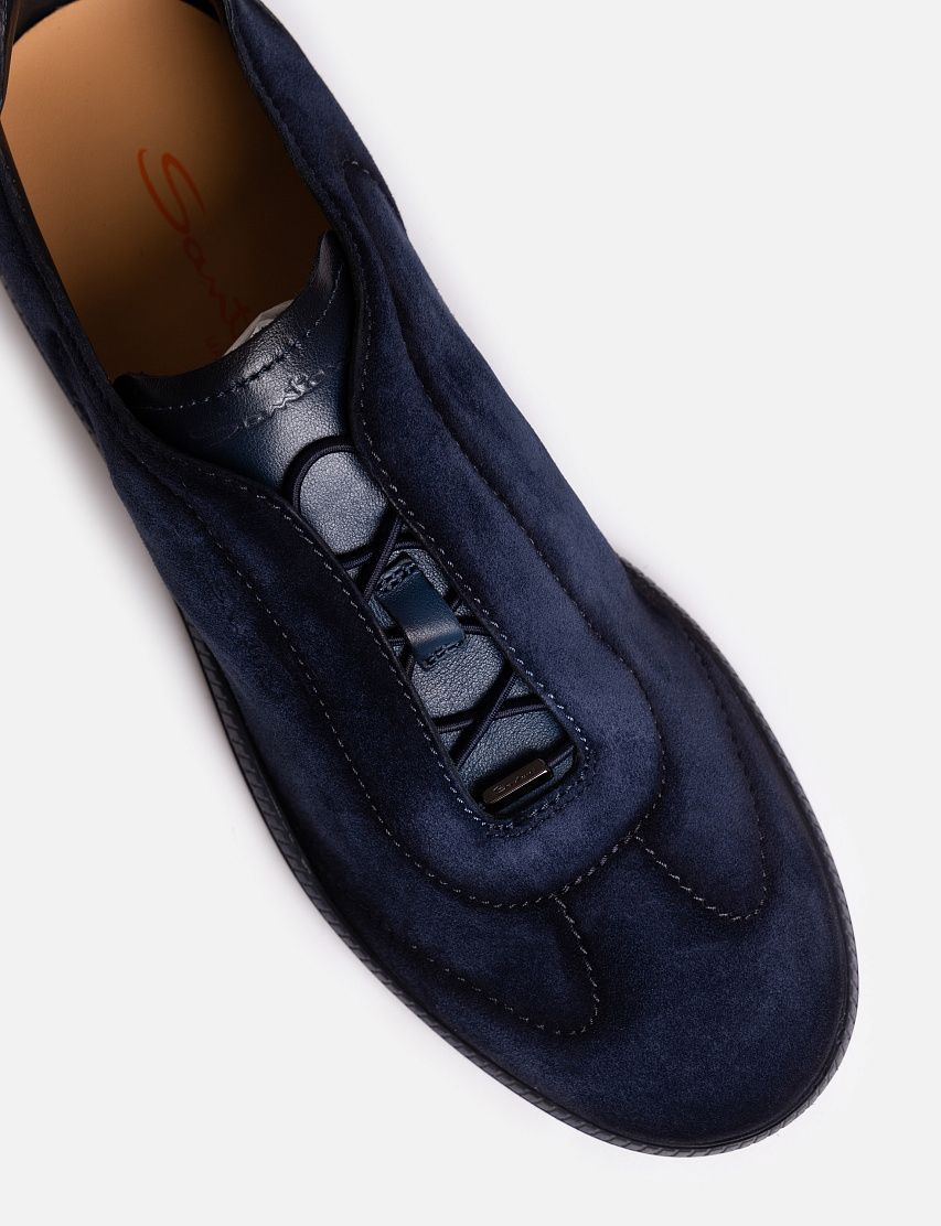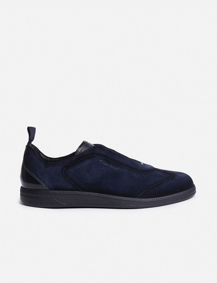 Кеды на плоской резиновой подошве сшили из мягкой замши с бархатистой фактурой. Пара дополнена эластичной шнуровкой и задником из глянцевой кожи, окрашенной в фирменной технике velatura. Тисненый логотип на язычке и стежок оттенка Arancio Santoni подчеркивают принадлежность к бренду.
