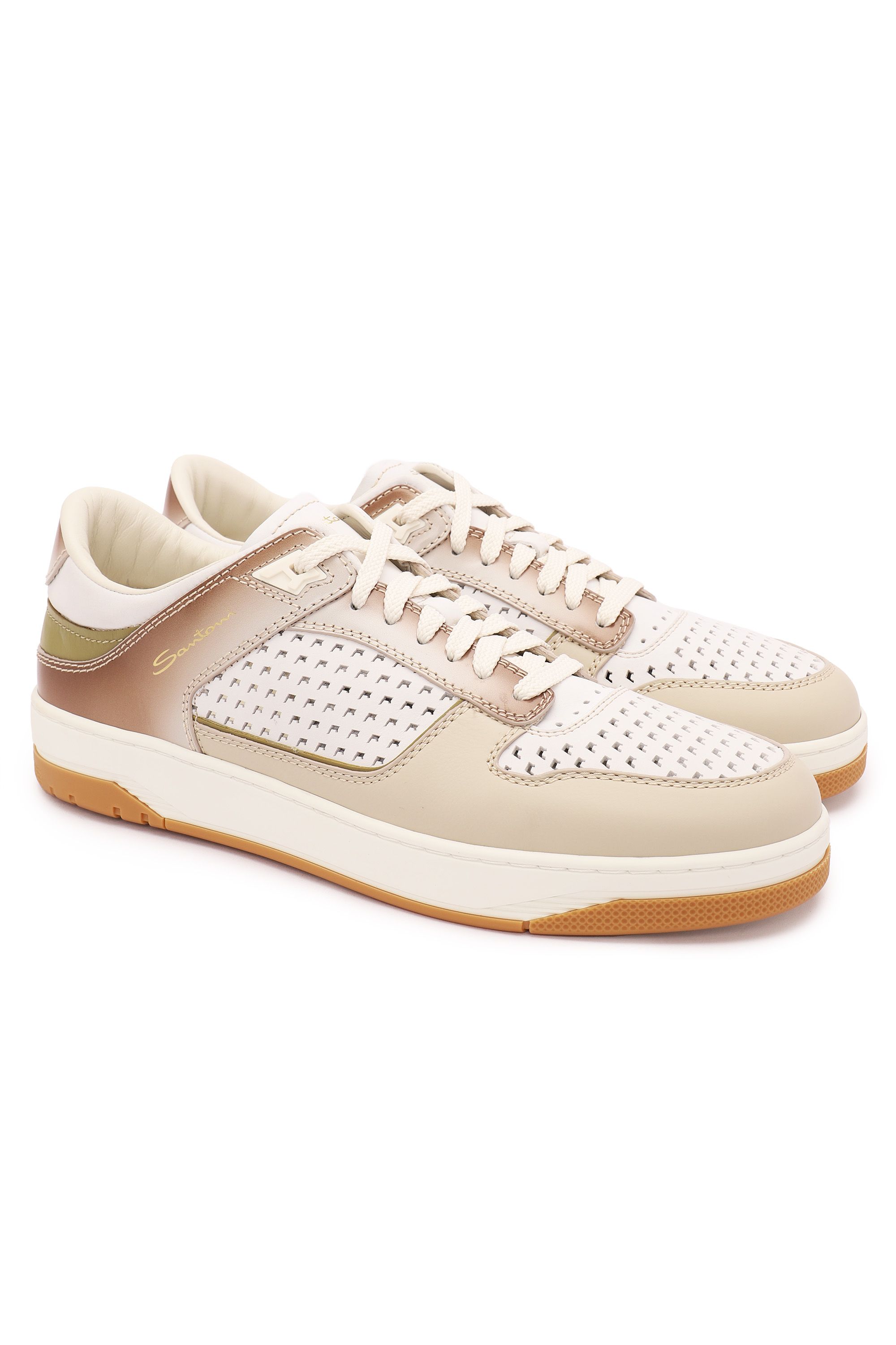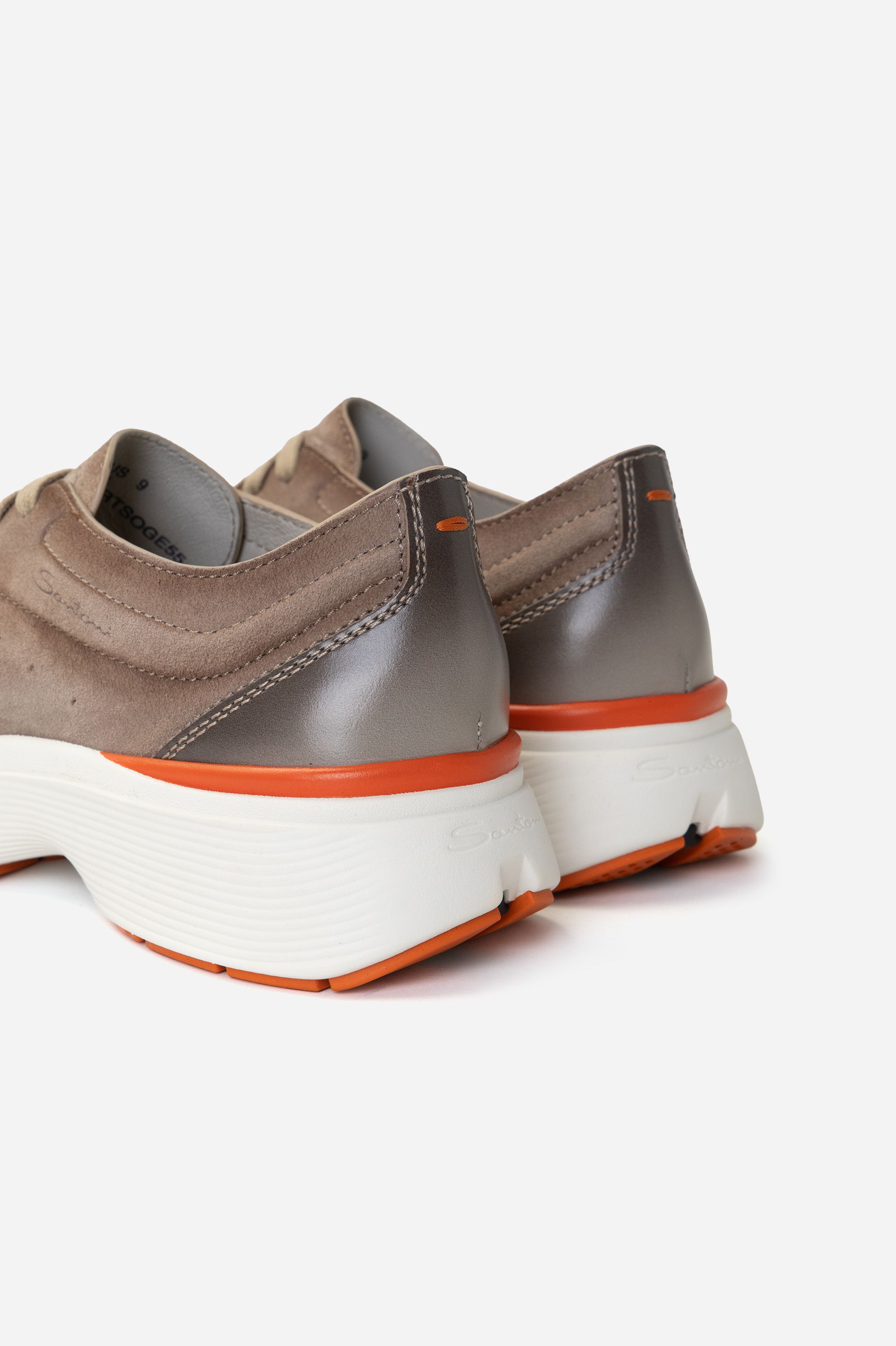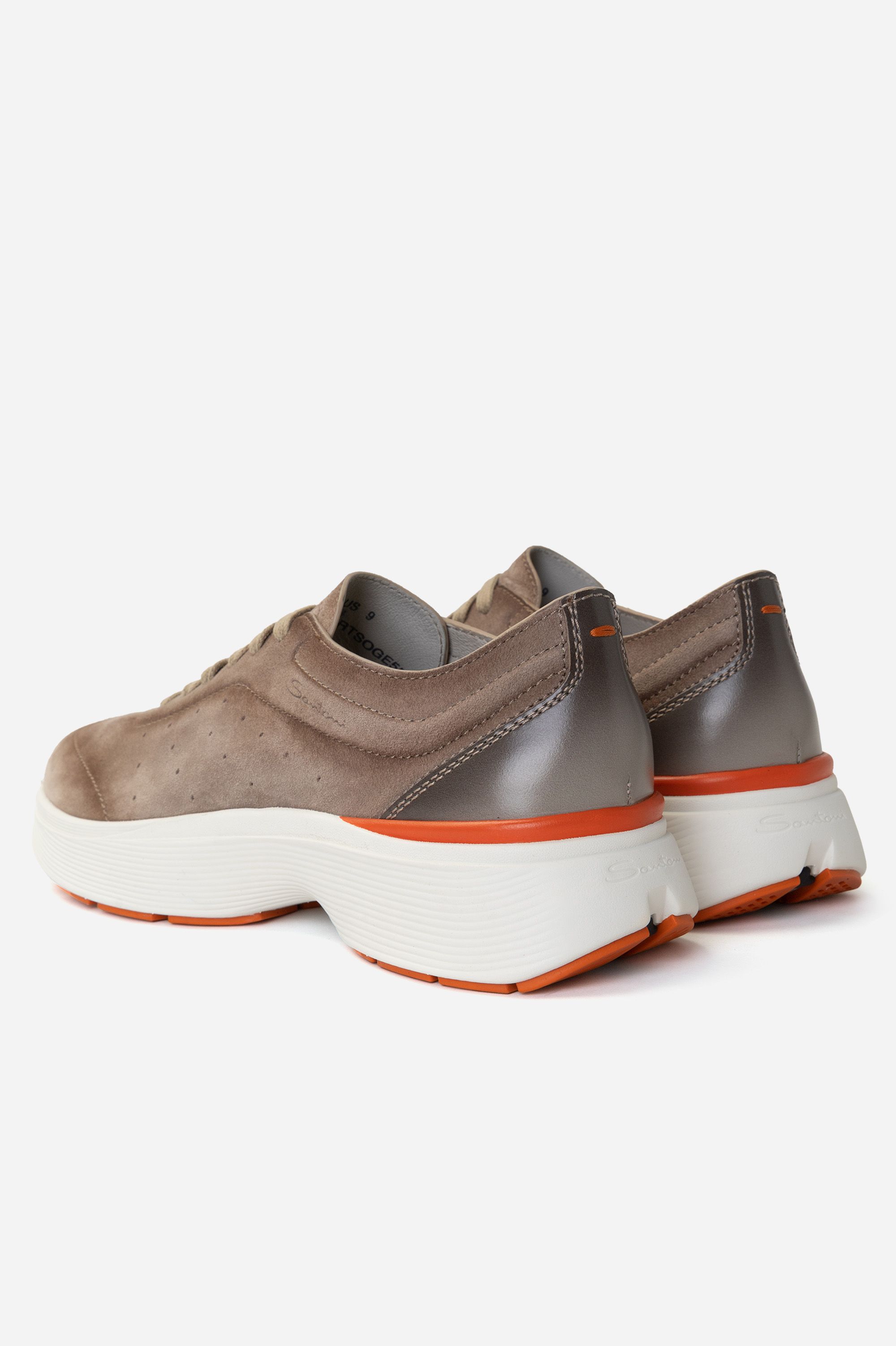 При изготовлении этой пары скомбинировали гладкую телячью кожу и мягкую замшу. Модель на широкой резиновой подошве дополнена шнуровкой и украшена фирменным логотипом на боковых панелях и заднике.