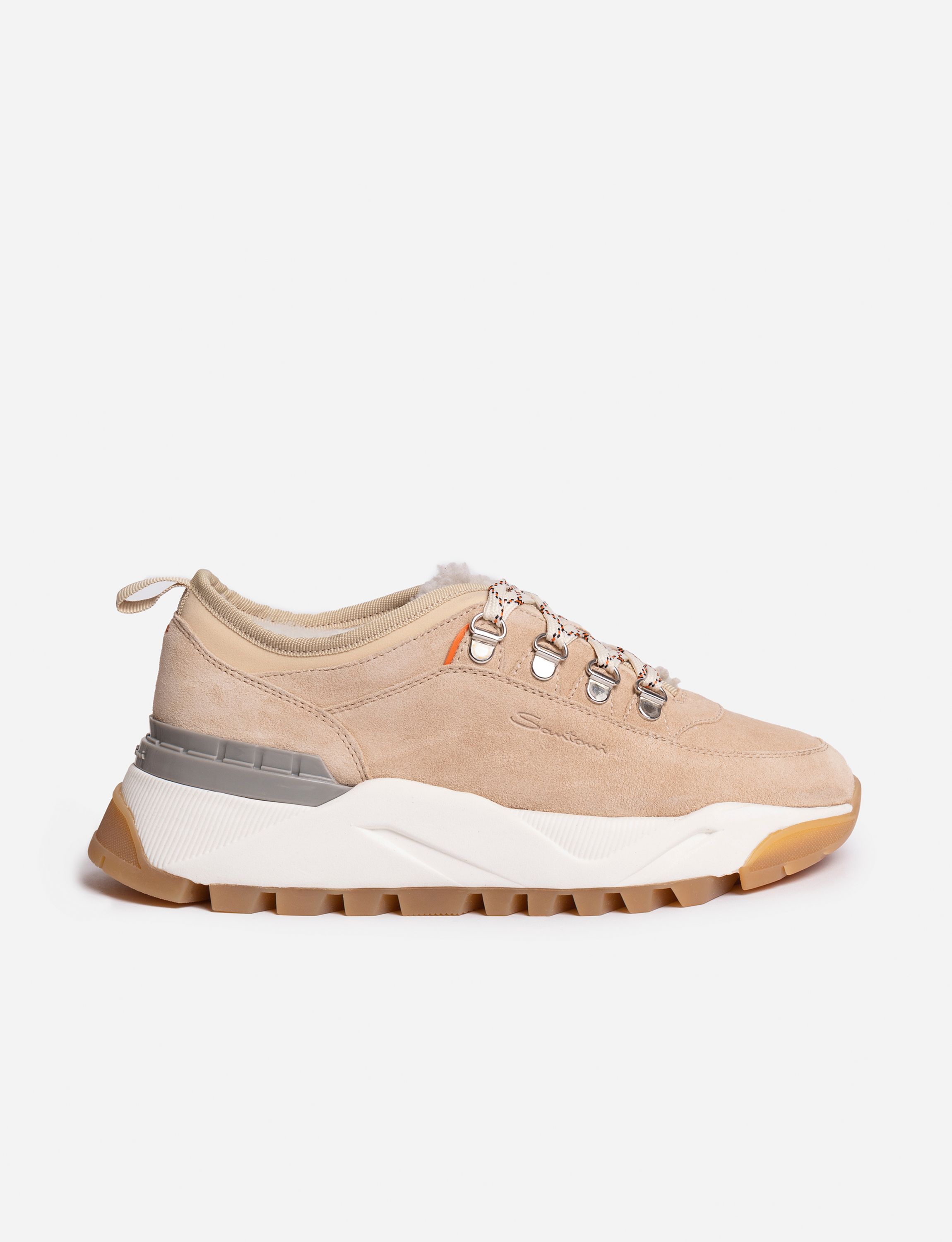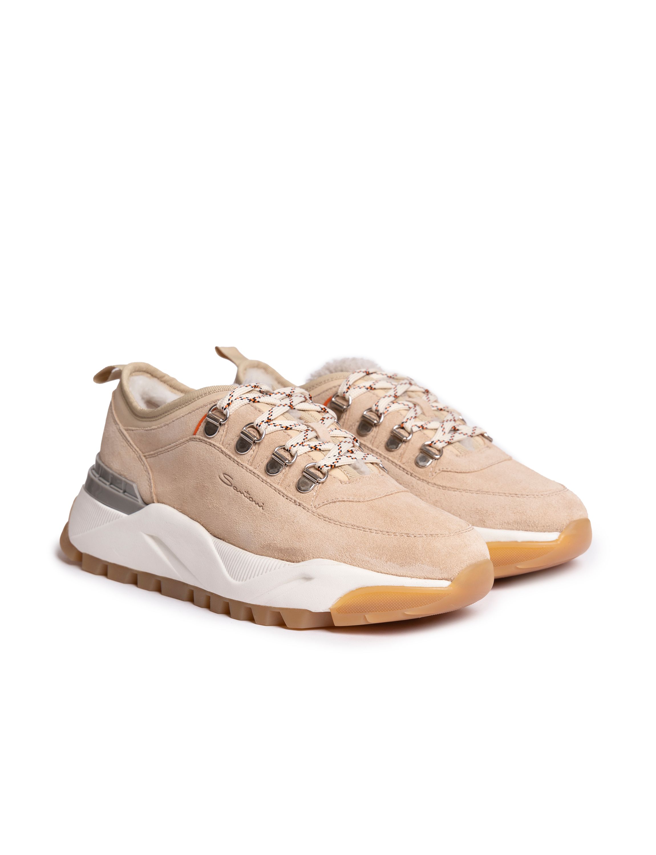 Кеды Santoni дополнены опушкой из мягкого меха кролика и фирменным оранжевым лейблом сбоку. Изделие выполнено из 100% натуральной замши. Подкладка и стелька из 100% овчины согреют вас в холодное время года, а высокая подошва защитит обувь от влаги. Также язычки украшены лаконичным кожаным фирменным лейблом.