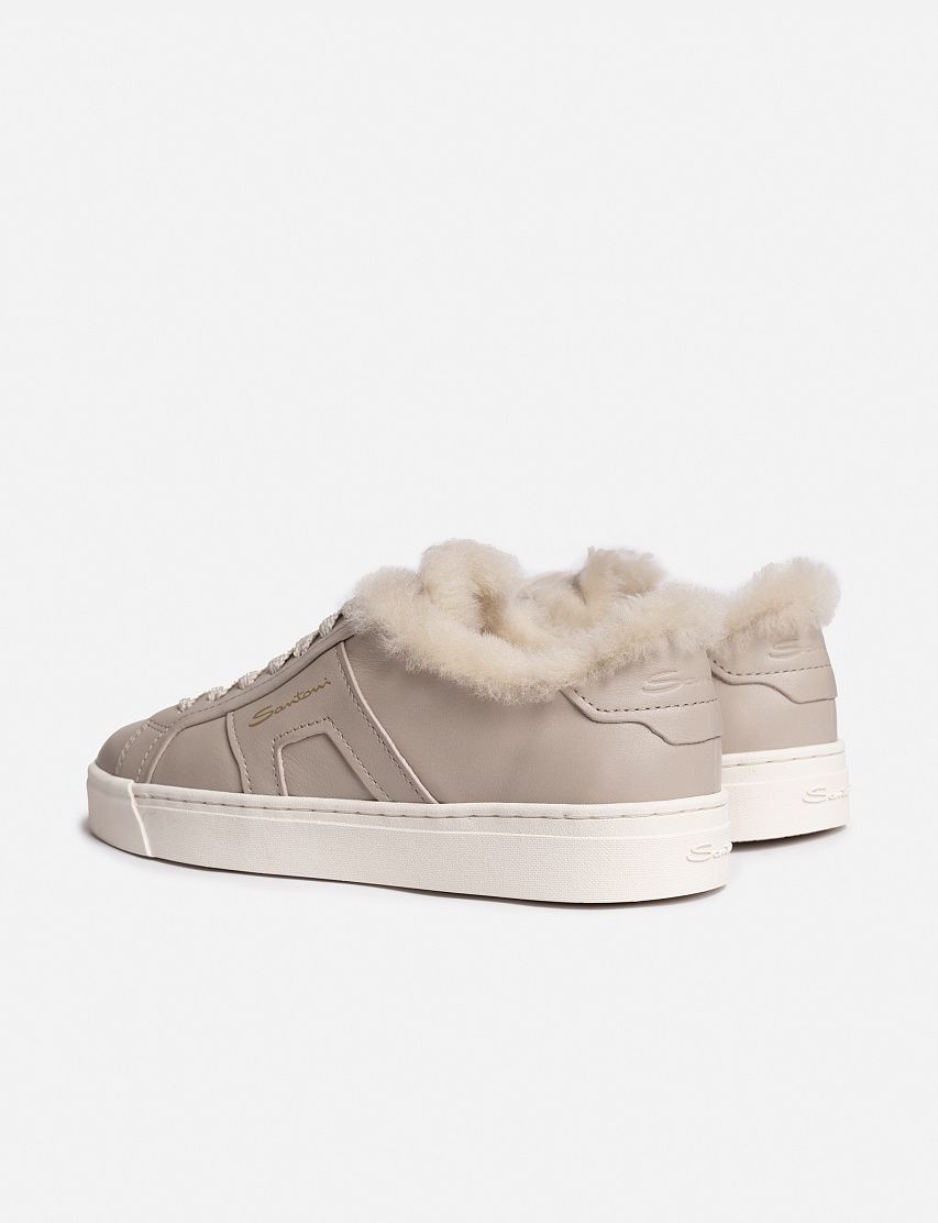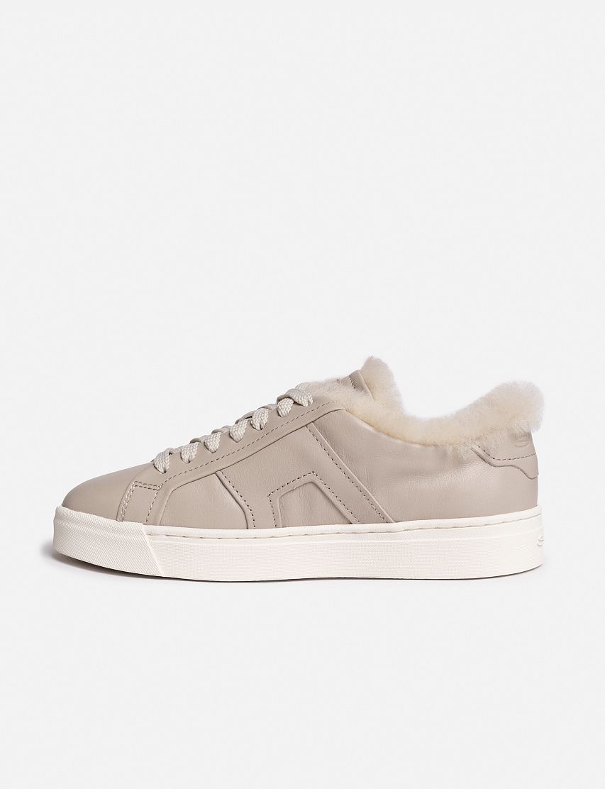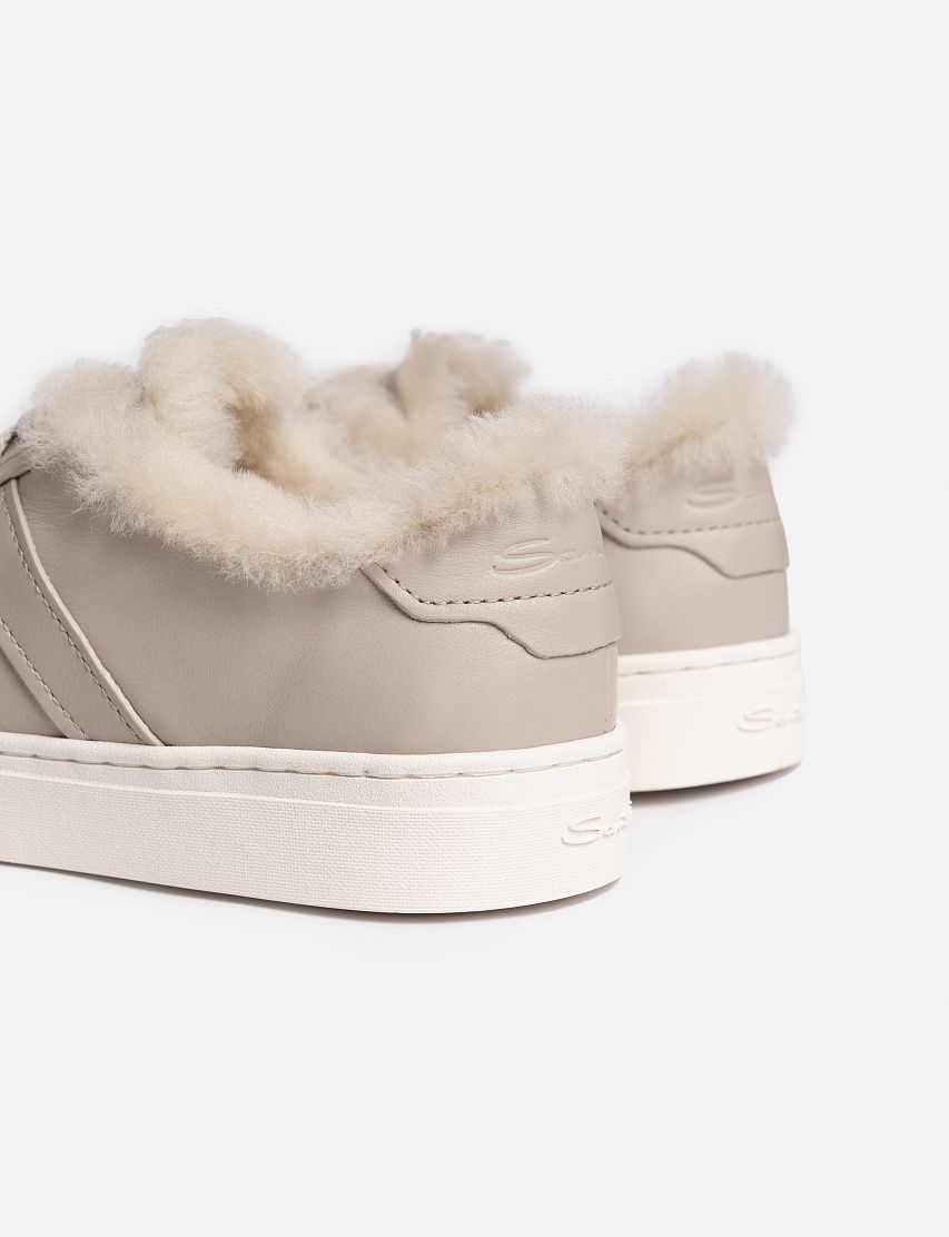Кеды на сплошной резиновой подошве выполнили из гладкой телячьей кожи, утеплив внутри отделкой из овчины. Накладки по бокам напоминают по форме двойные ремешки фирменных монков.