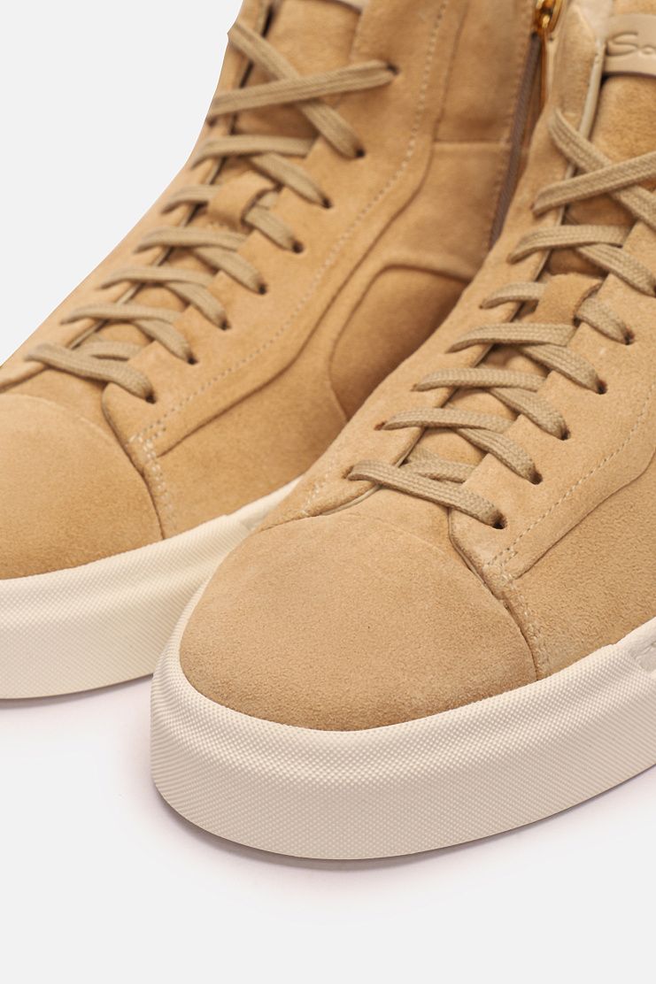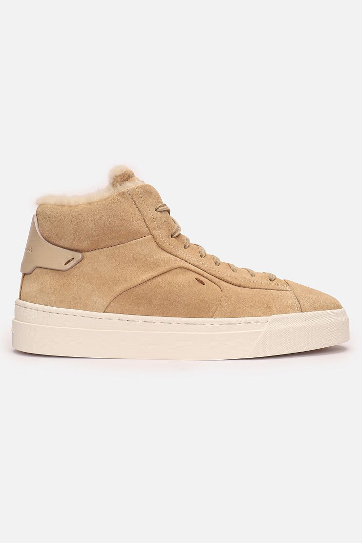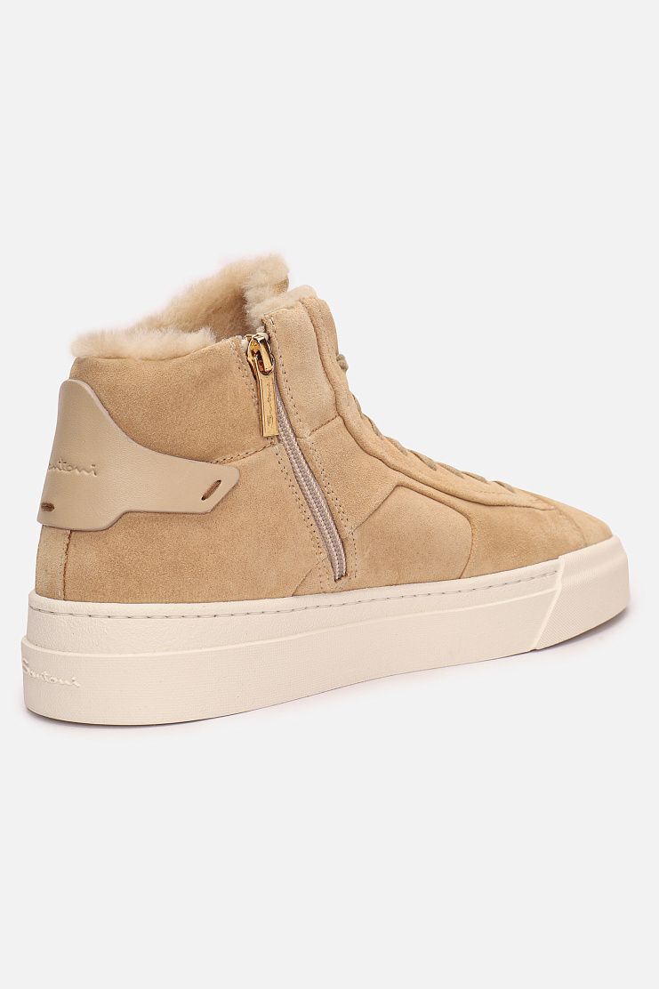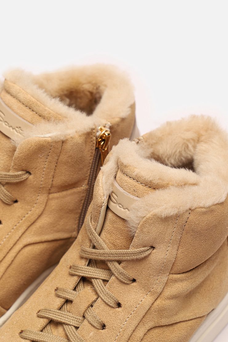 Высокие замшевые кеды с меховой подкладкой прекрасно подойдут для холодной погоды. Модель имеет кожаные вставки на язычках и задниках с тиснением в виде надписи Santoni и застежку на боковую молнию.