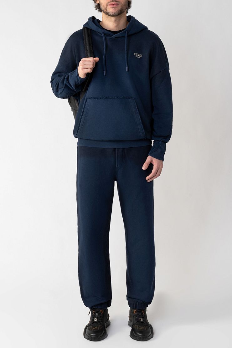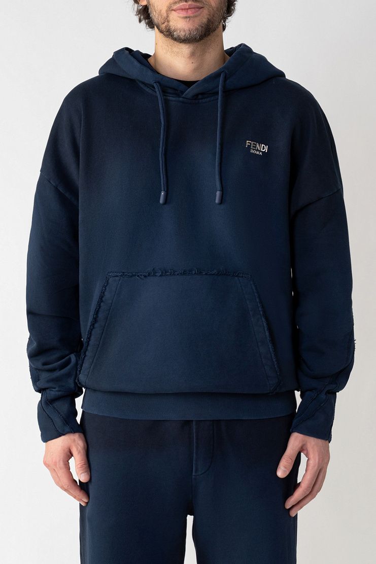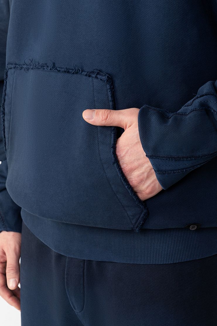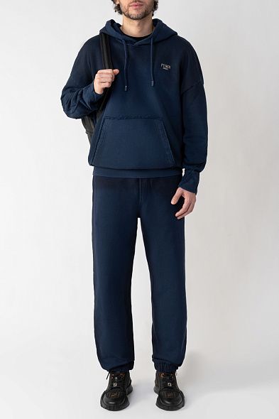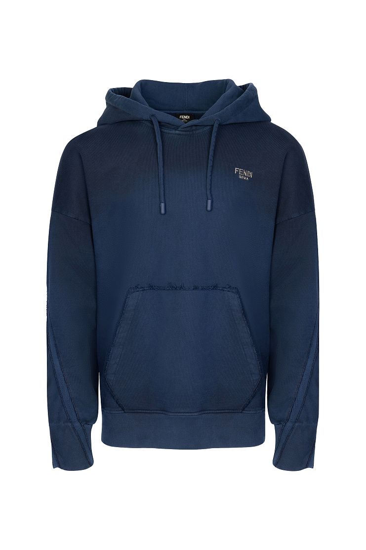 Худи кроя оверсайз со спущенной линией плеч сшили из мягкого хлопкового джерси. Модель с объемным капюшоном на шнурке дополнили накладным карманом с необработанными краями и эластичной отделкой на манжетах и поясе. Особенность модели — градиентное окрашивание в технике garment dye, которое создает легкий эффект потертости и подчеркивает фактуру ткани. Дизайн завершают вставки на рукавах и кокетке, а также нашивка с логотипом на груди.
