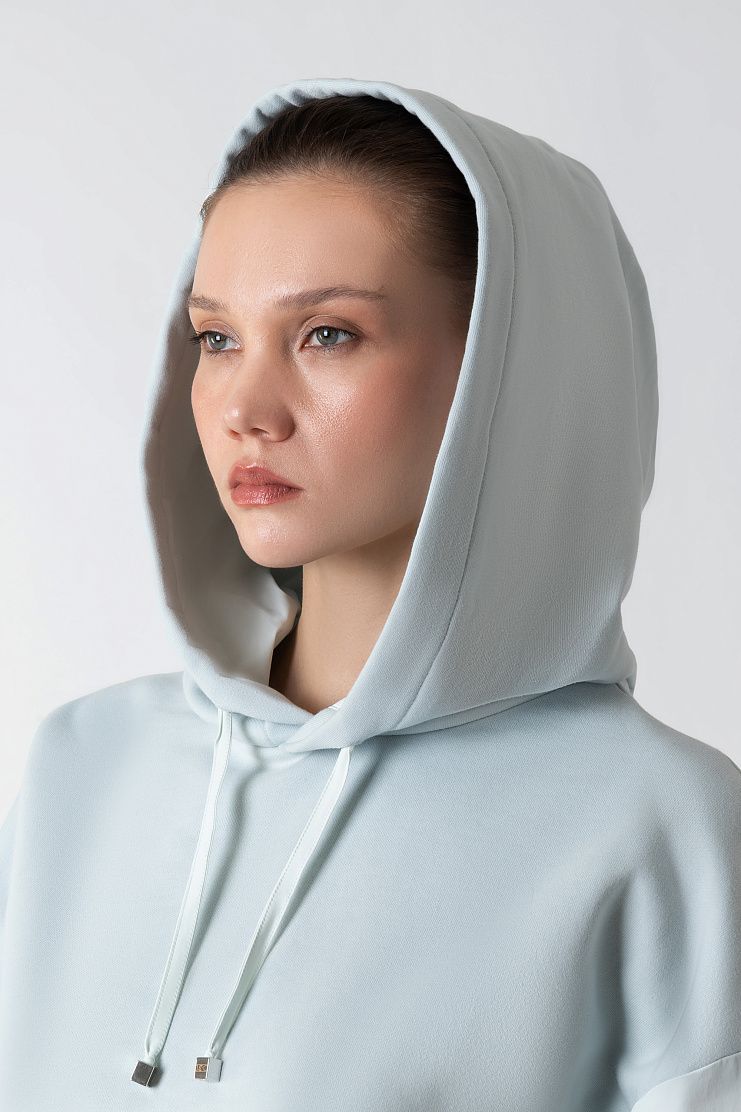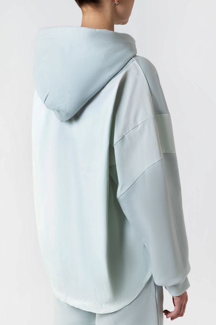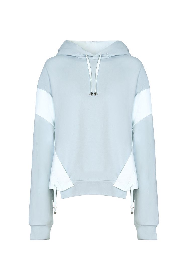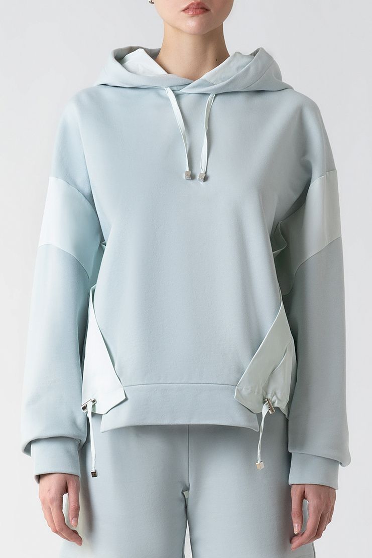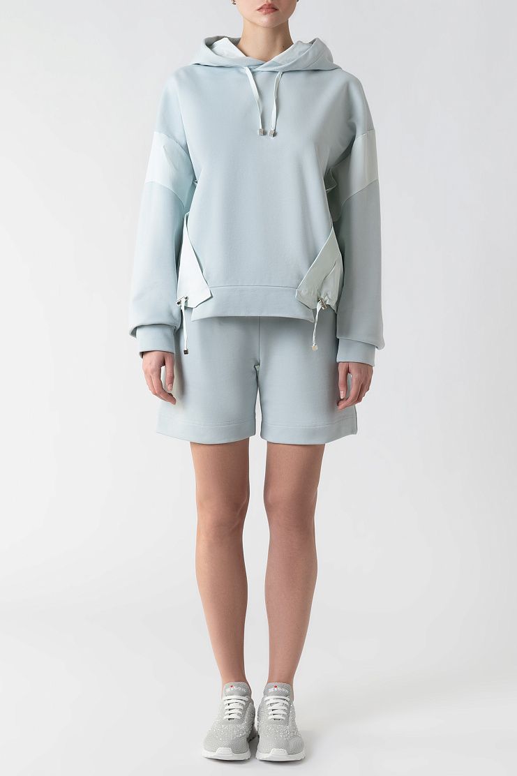 Свободное худи со спущенной линией плеч и капюшоном выполнили из мягкого и дышащего хлопкового трикотажа. Особенность дизайна — декоративные вставки на спине и рукавах. Модель будет гармонично сочетаться с парными спортивными брюками.