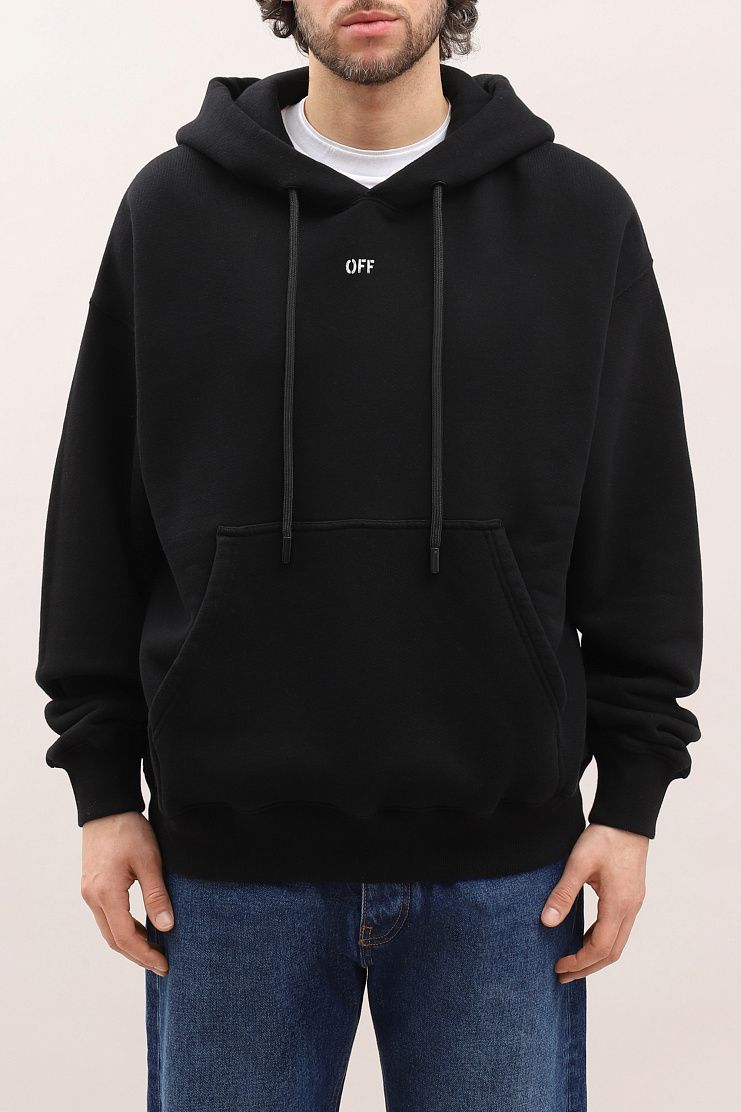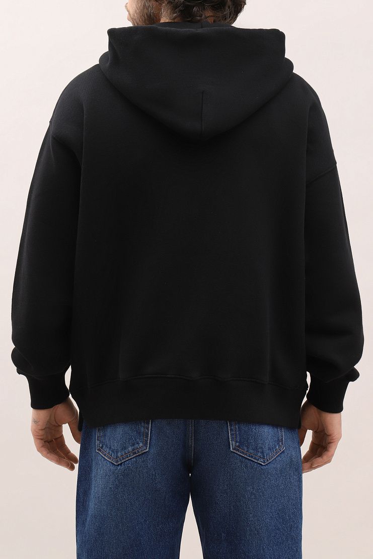 Свободное худи с капюшоном со спущенной линией плеча сшили из мягкого хлопкового футера. Модель дополнена большим карманом-кенгуру и эластичной отделкой на манжетах и поясе. Лаконичный элемент декора — контрастный фирменный логотип спереди.
