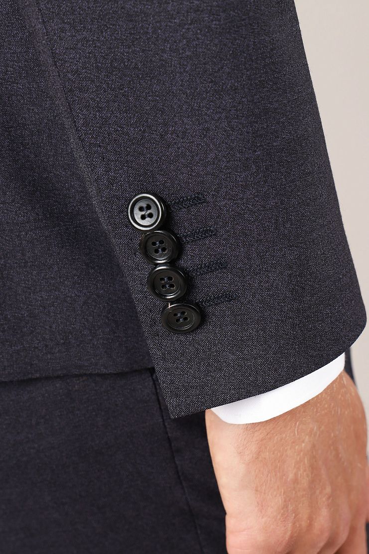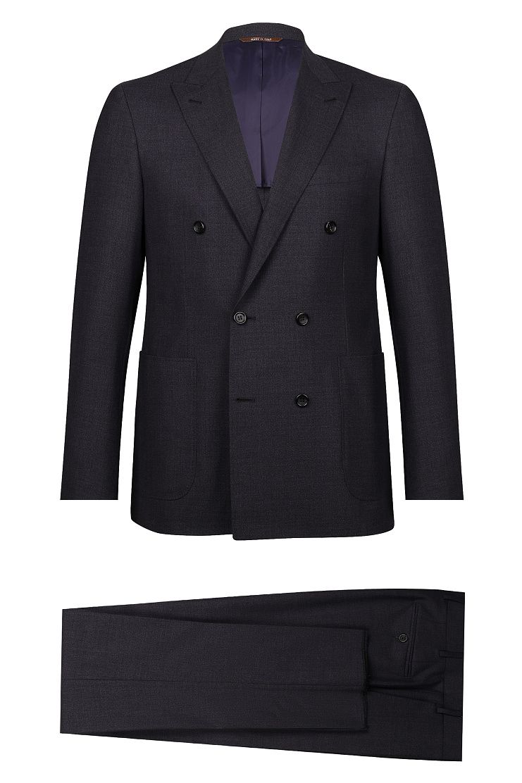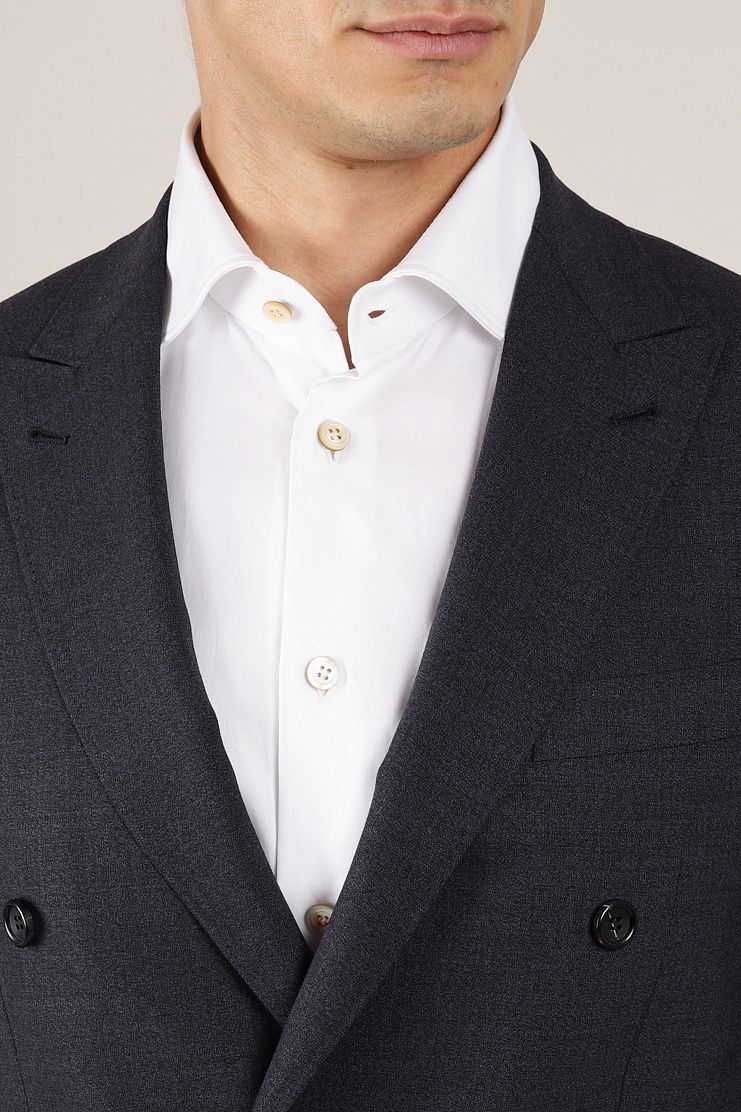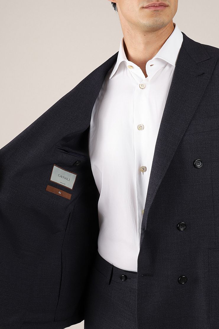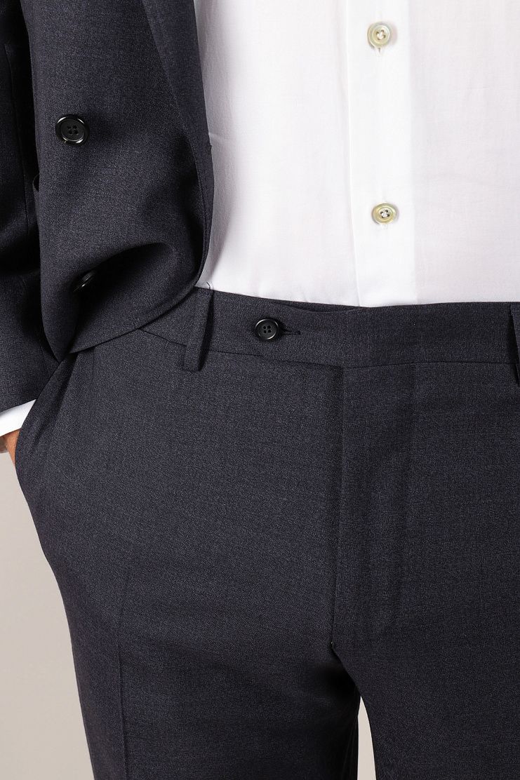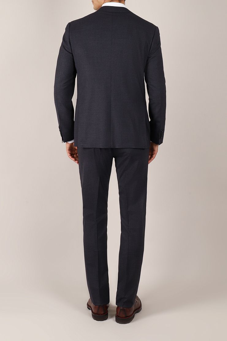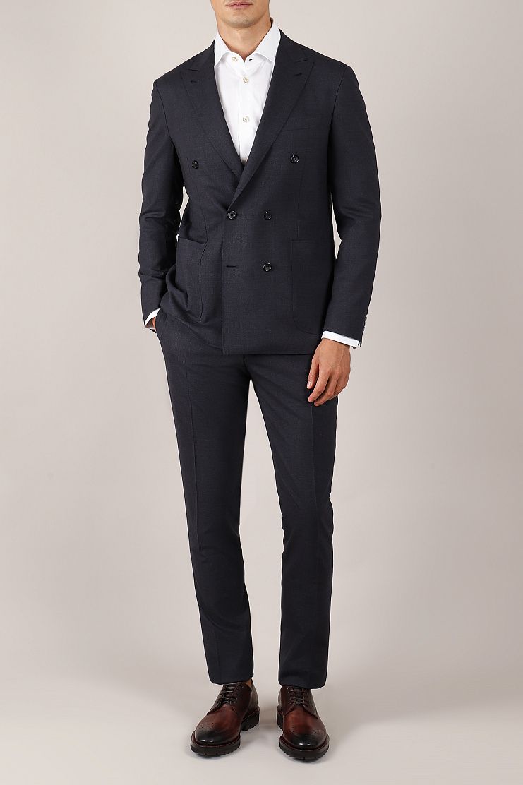 Костюм превосходно подойдет для торжественного меропрития. Двубортный пиджак на полуподкладке с заостренными лацканами и боковыми накладными карманами. Брюки прямого кроя со стрелками и застежкой на молнию и пуговицу.