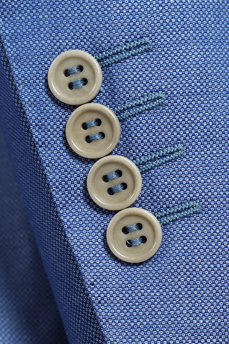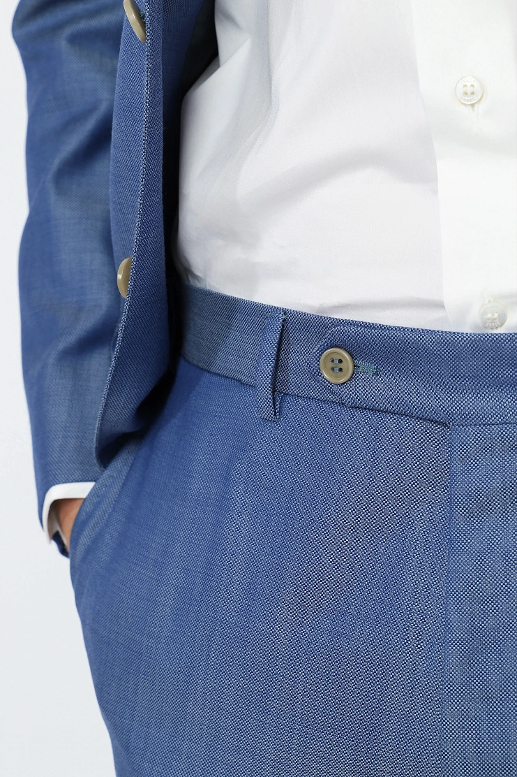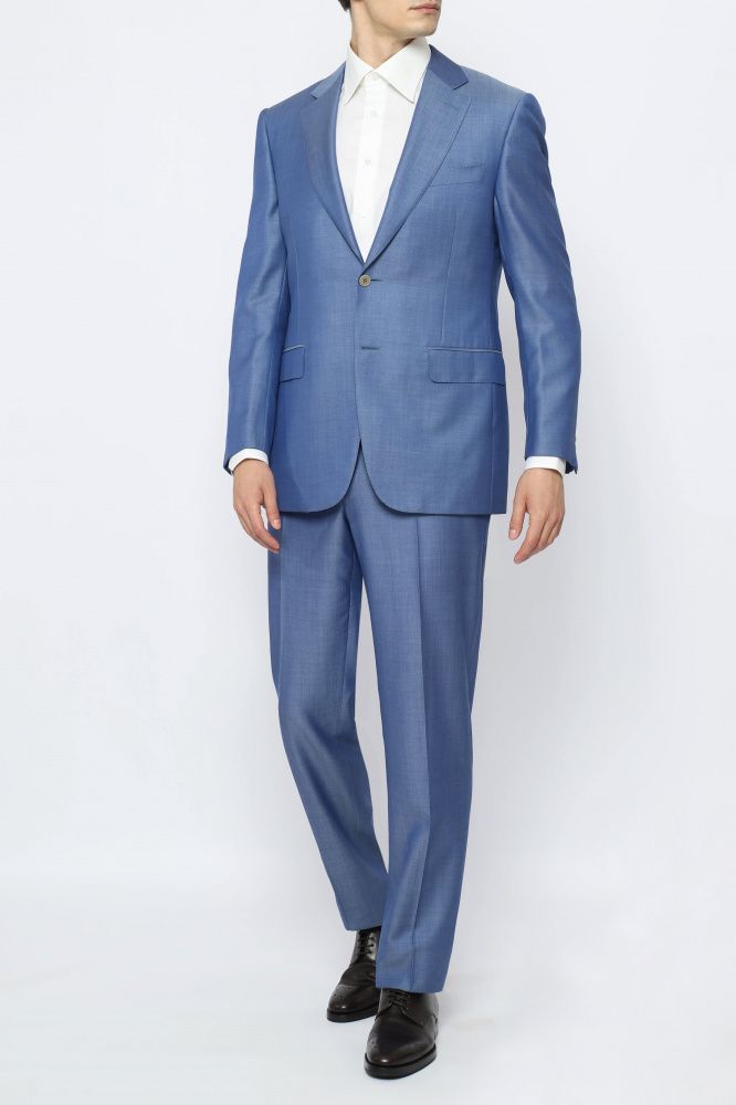 Костюм выполнен из шерстяной ткани с клетчатой фактурой. Слегка приталенный пиджак на подкладке, с боковыми карманами. Классические брюки со стрелками и застежкой на молнию и пуговицу.