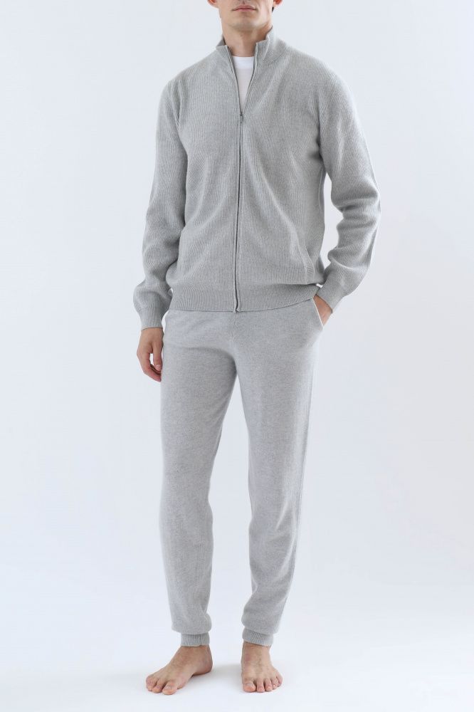 Костюм из шерсти и кашемира для комфортного отдыха дома. В комплекте кардиган на молнии с высоким горлом и брюки-джоггеры свободного кроя с поясом на кулиске.