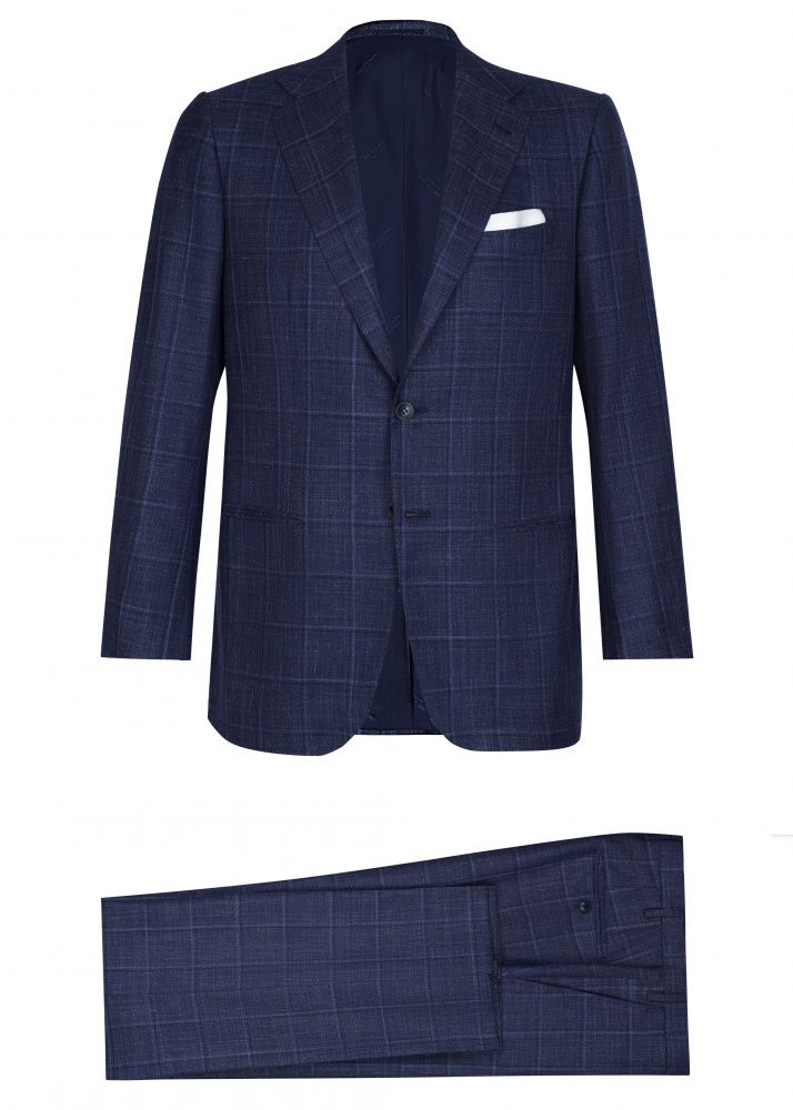 Костюм в крупную клетку из кашемира и шелка превосходно подойдет для походов в офис. Слегка приталенный пиджак на подкладке. Классические брюки со стрелками и застежкой на молнию и пуговицу.
