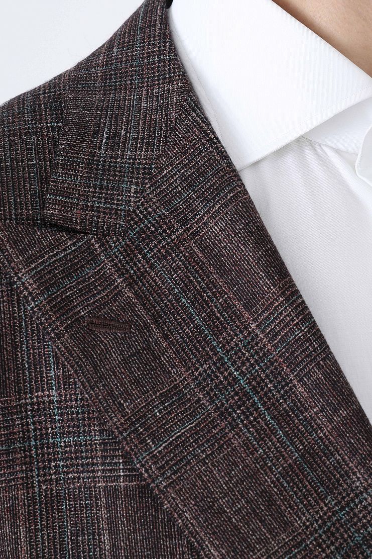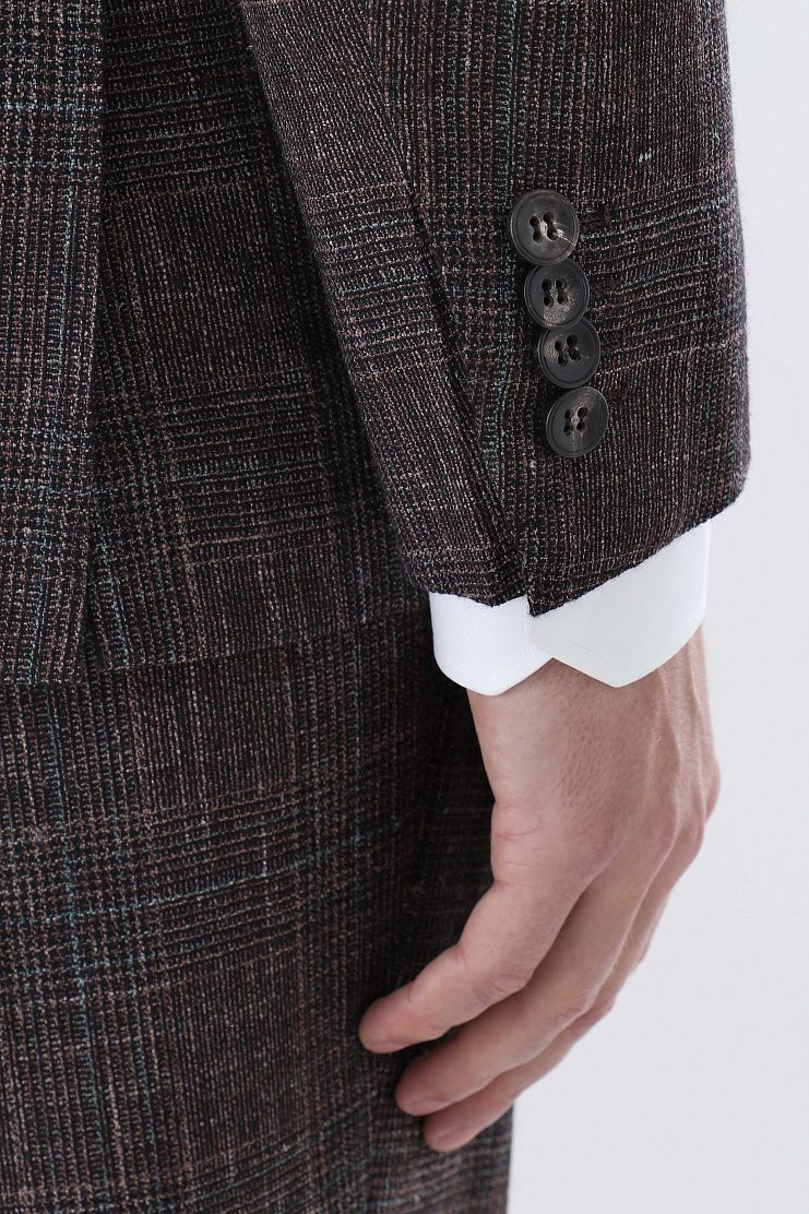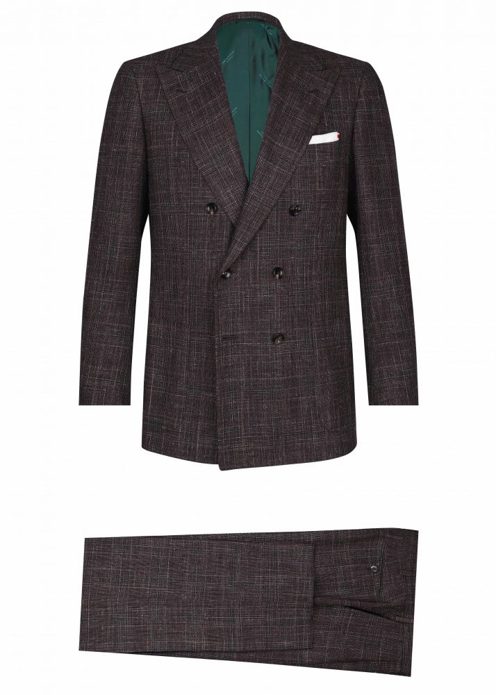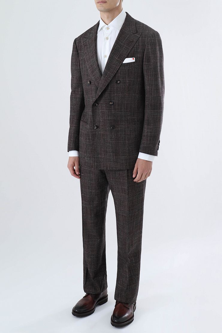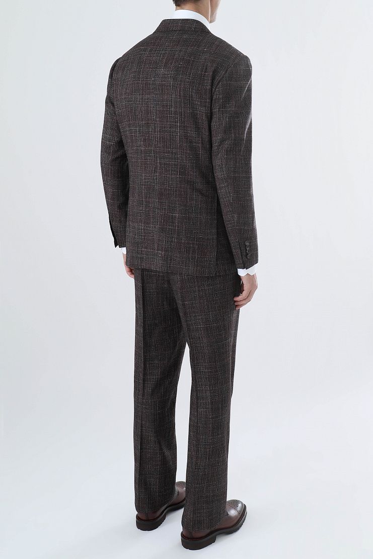Костюм из кашемира и шерсти с клетчатым узором, образованным переплетением нитей нескольких оттенков. Двубортный пиджак приталенного силуэта, с заостреннными лацканами, боковыми карманами и застежкой на пуговицы. Брюки прямого кроя, со стрелками, боковыми и задними карманами. Костюм позволит создать изысканный образ для торжественного и неформального мероприятия.