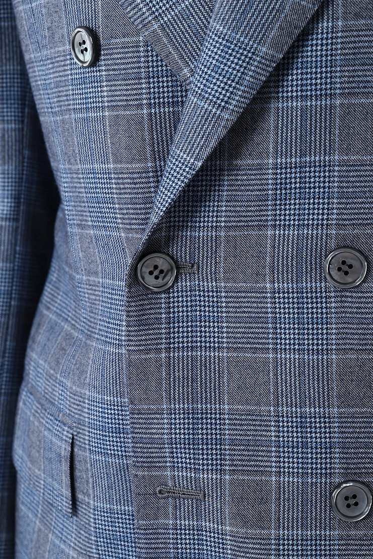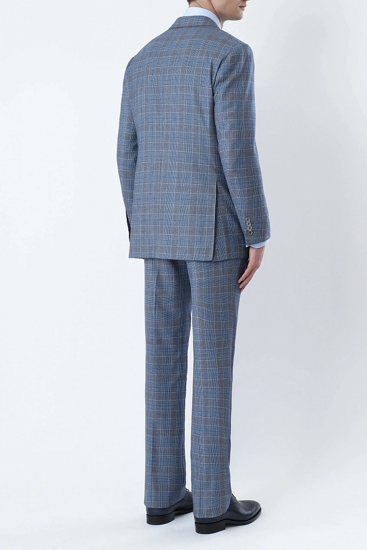 Костюм в клетку выполнен из изысканного сочетания кашемира и тончайшей шерсти 14 MIC, что придает ткани особенную гладкость и шелковистость. Слегка приталенный двубортный пиджак с заостренными лацканами и классические брюки со стрелками идеально дополняют друг друга.