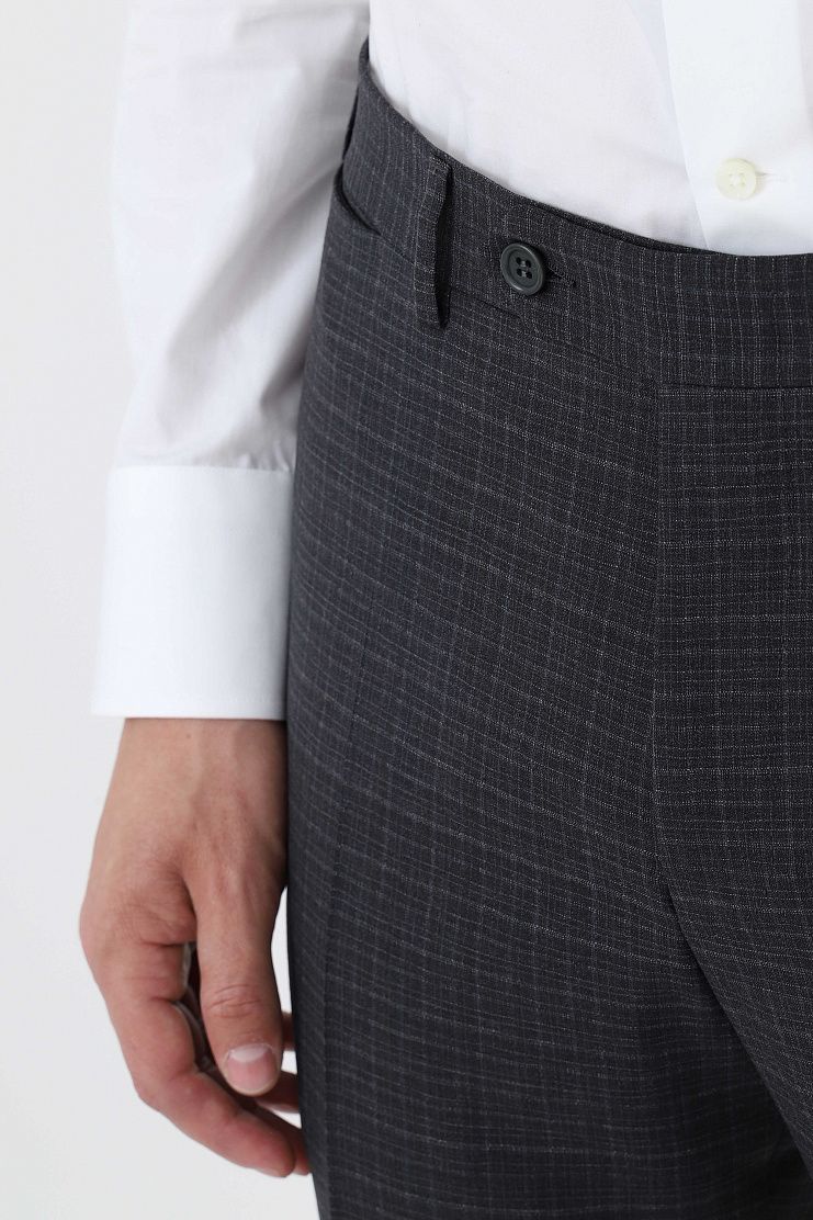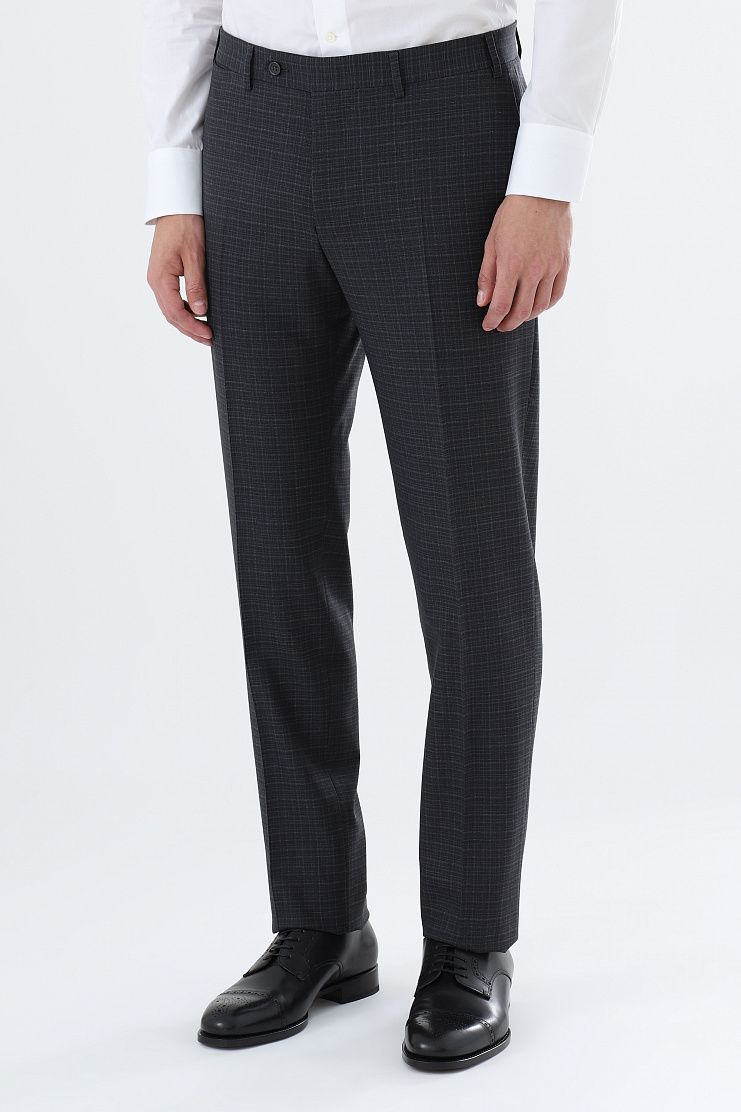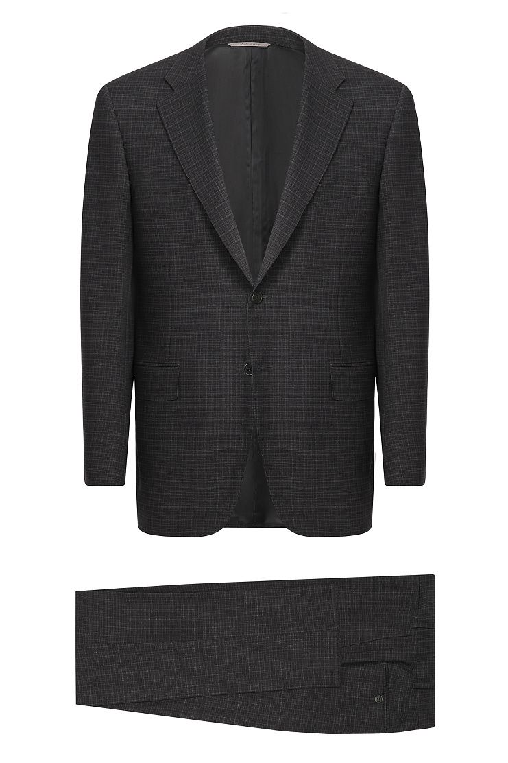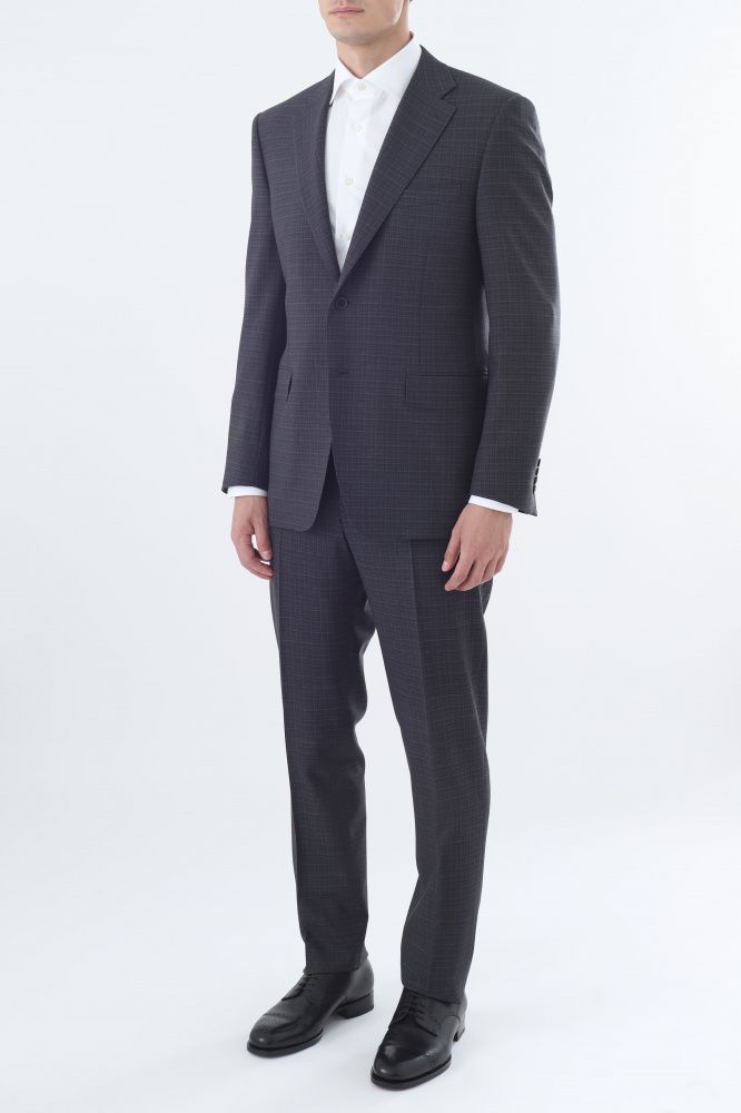 Костюм из шерсти в мелкую клетку создан для тех, кто любит сочетание комфорта и изысканности. Однобортный пиджак с лацканами, нагрудным и боковыми карманами. Изделие выполнено на подкладке, с застежкой на пуговицы. Классические брюки прямого кроя со стрелками и застежкой на молнию и пуговицу.