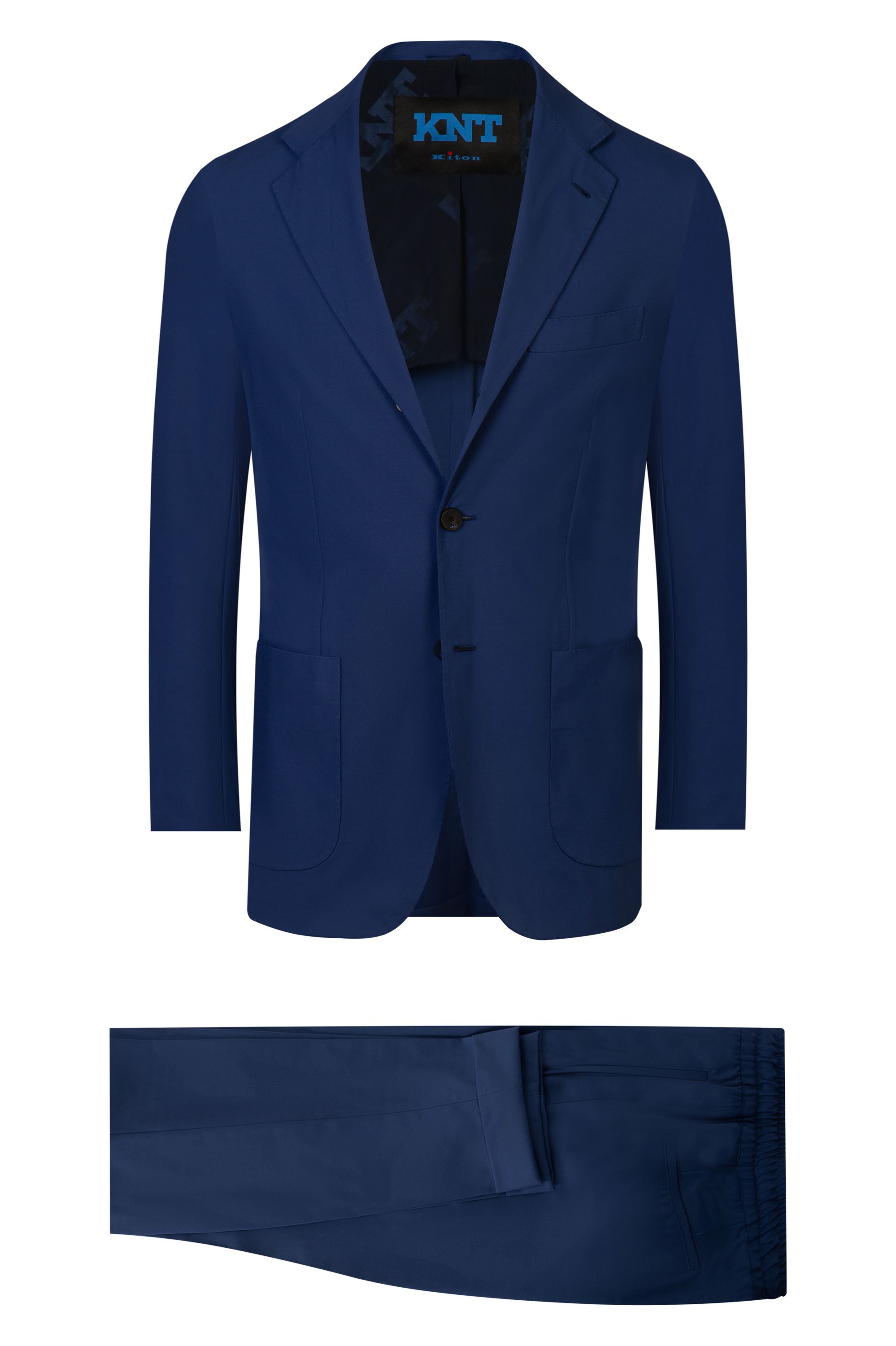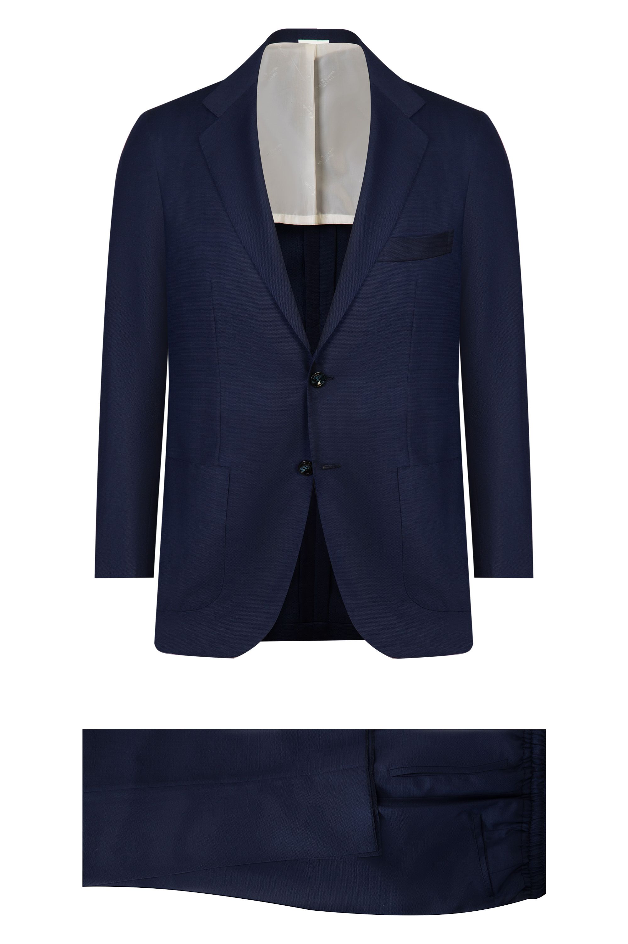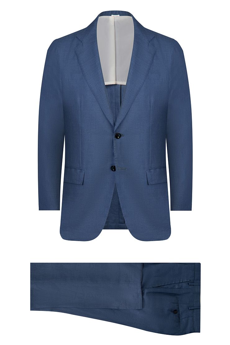 При изготовлении этого костюма дизайнеры Kiton выбрали ткань, соединившую фактурный лен, тонкую шерсть и прочный шелк. Однобортный пиджак с прямоугольными лацканами дополнили полуподкладом, а брюки со стрелками — двумя парами карманов.