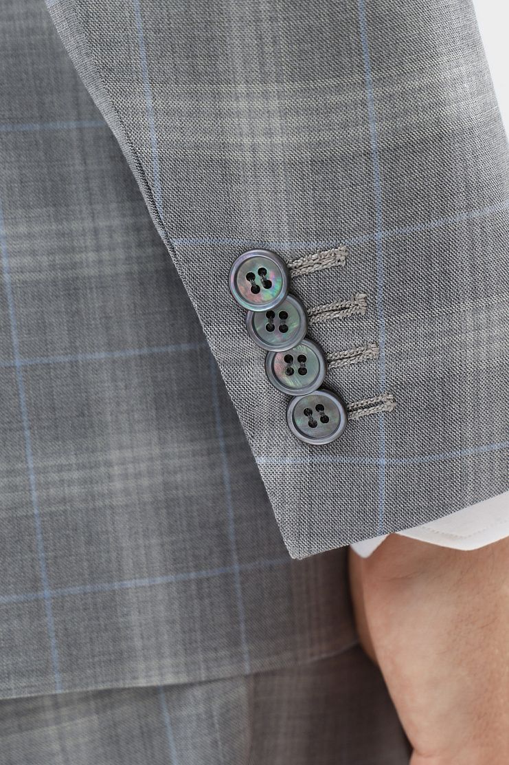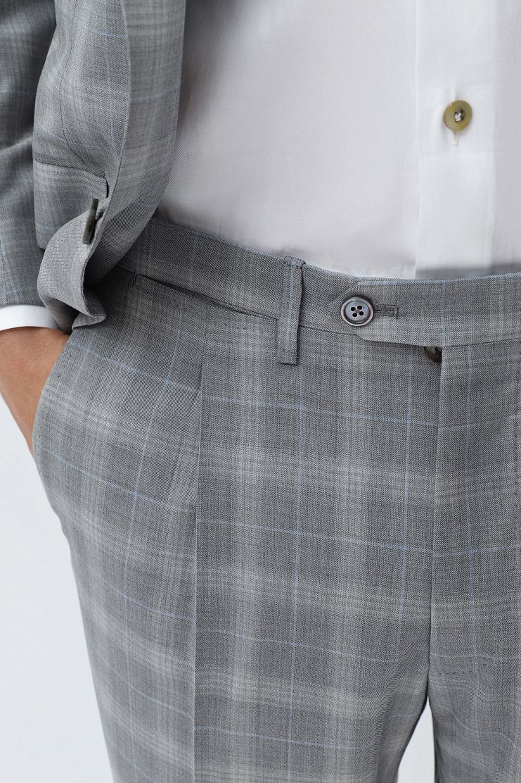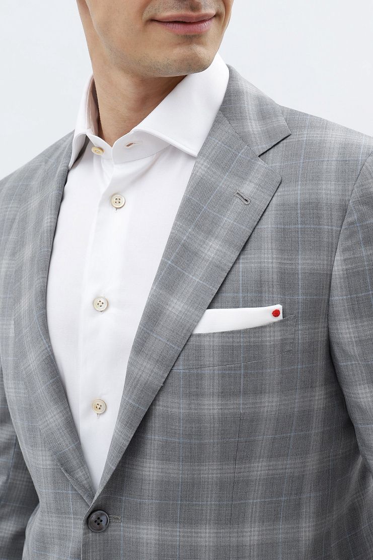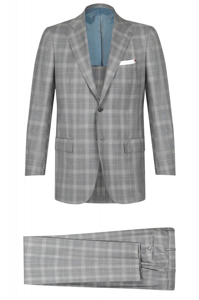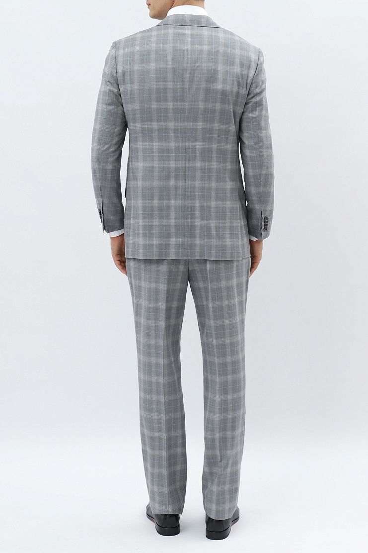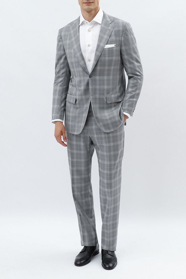 Костюм в крупную клетку отлично подойдет для полуформальных и неформальных мероприятий. Приталенный пиджак на подкладке дополнен белым нагрудным платком с вышивкой, придающим образу особенную изысканность. Классические брюки со стрелками и застежкой на молнию и пуговицу.