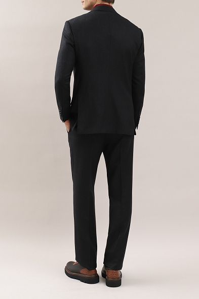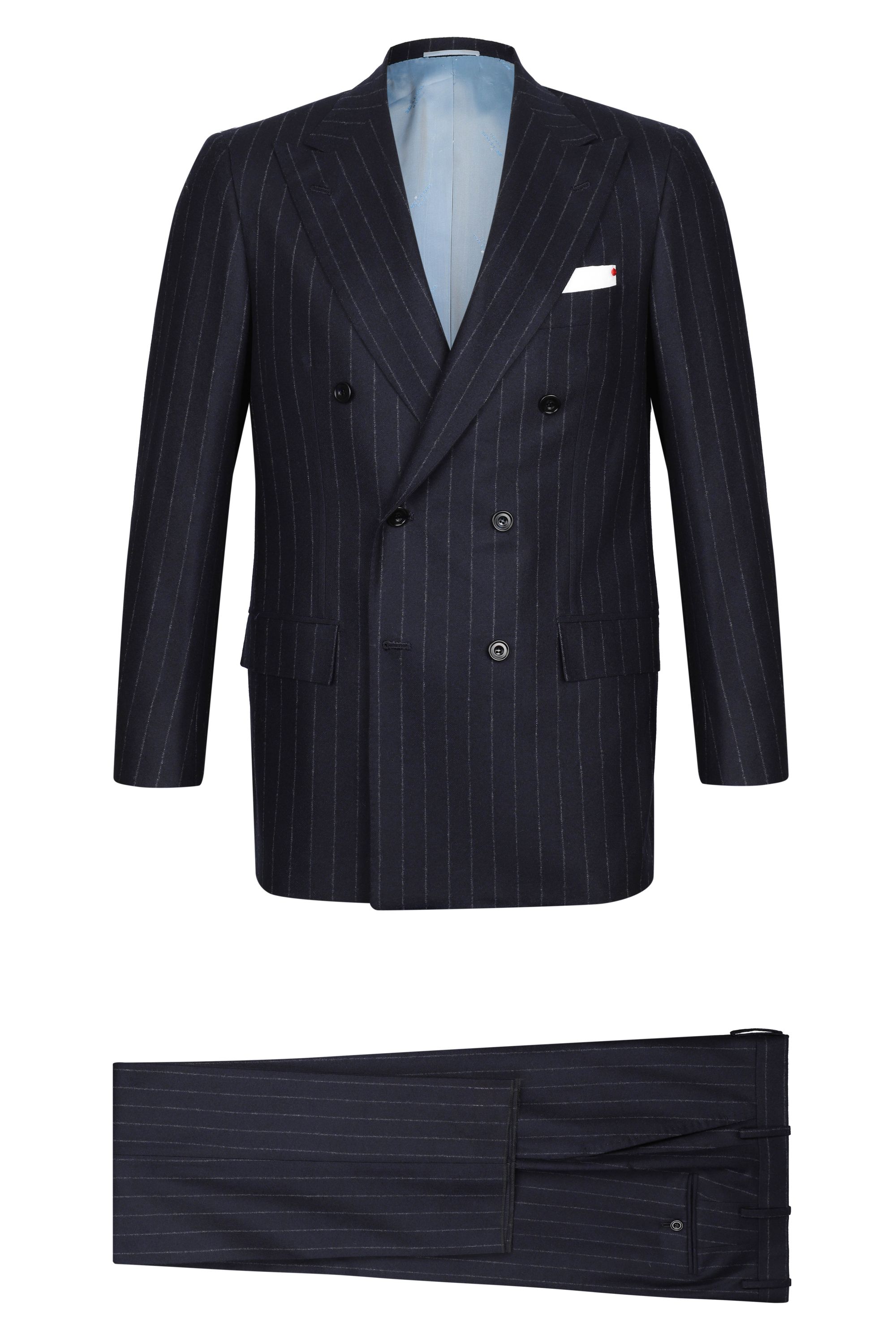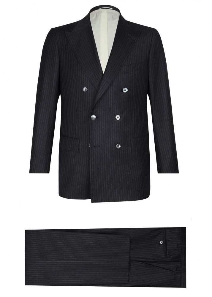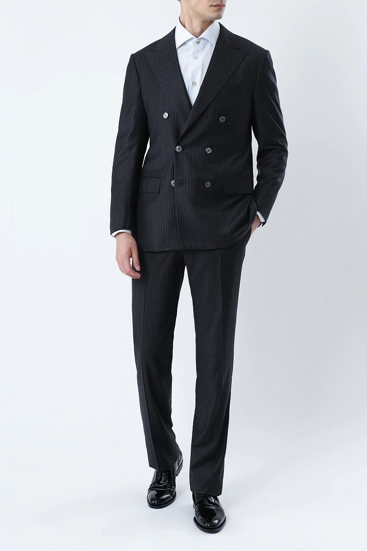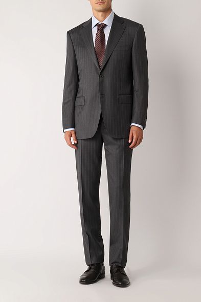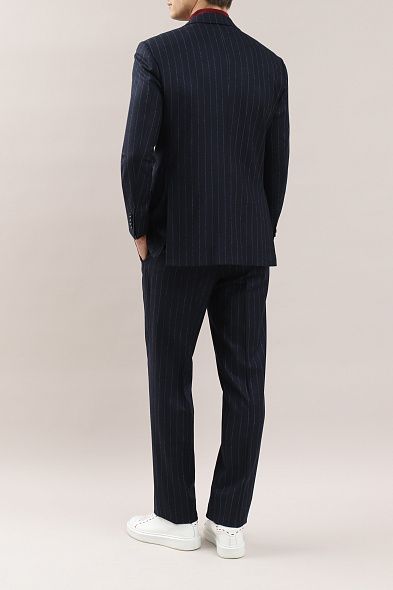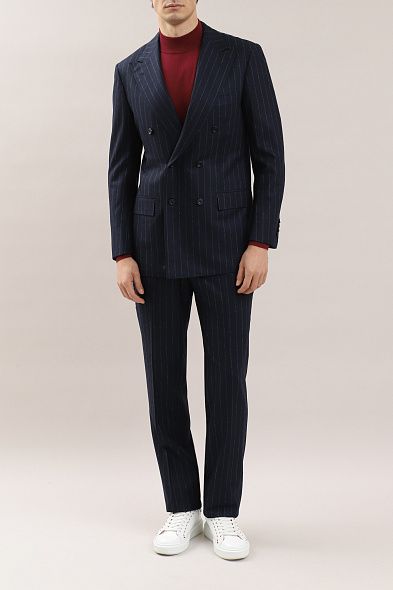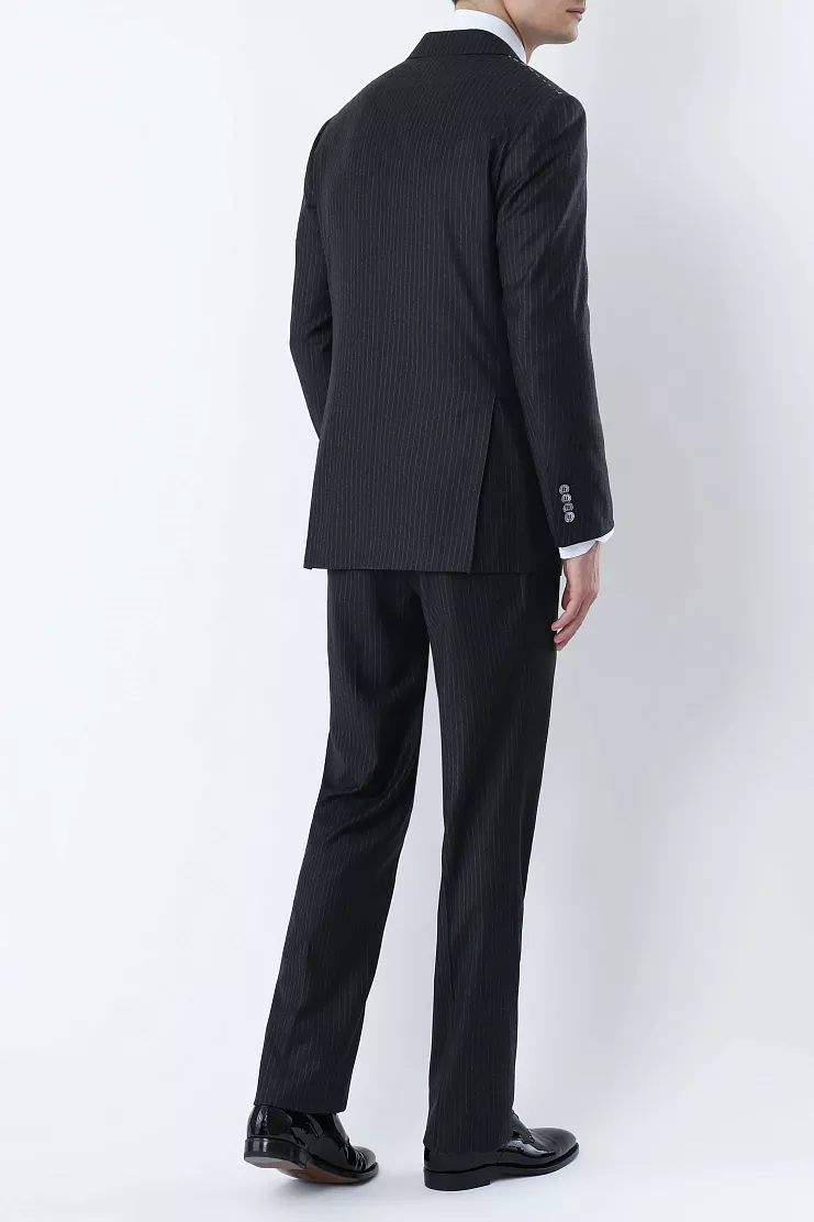 Костюм в вертикальную полоску выполнен из тончайшей шерсти 14 MIC, придающей изделиям невероятную гладкость и шелковистость. Слегка приталенный двубортный пиджак с заостренными лацканами и классические брюки со стрелками идеально дополняют друг друга.