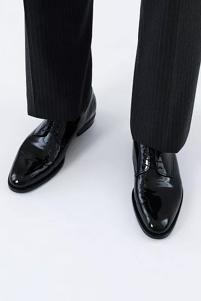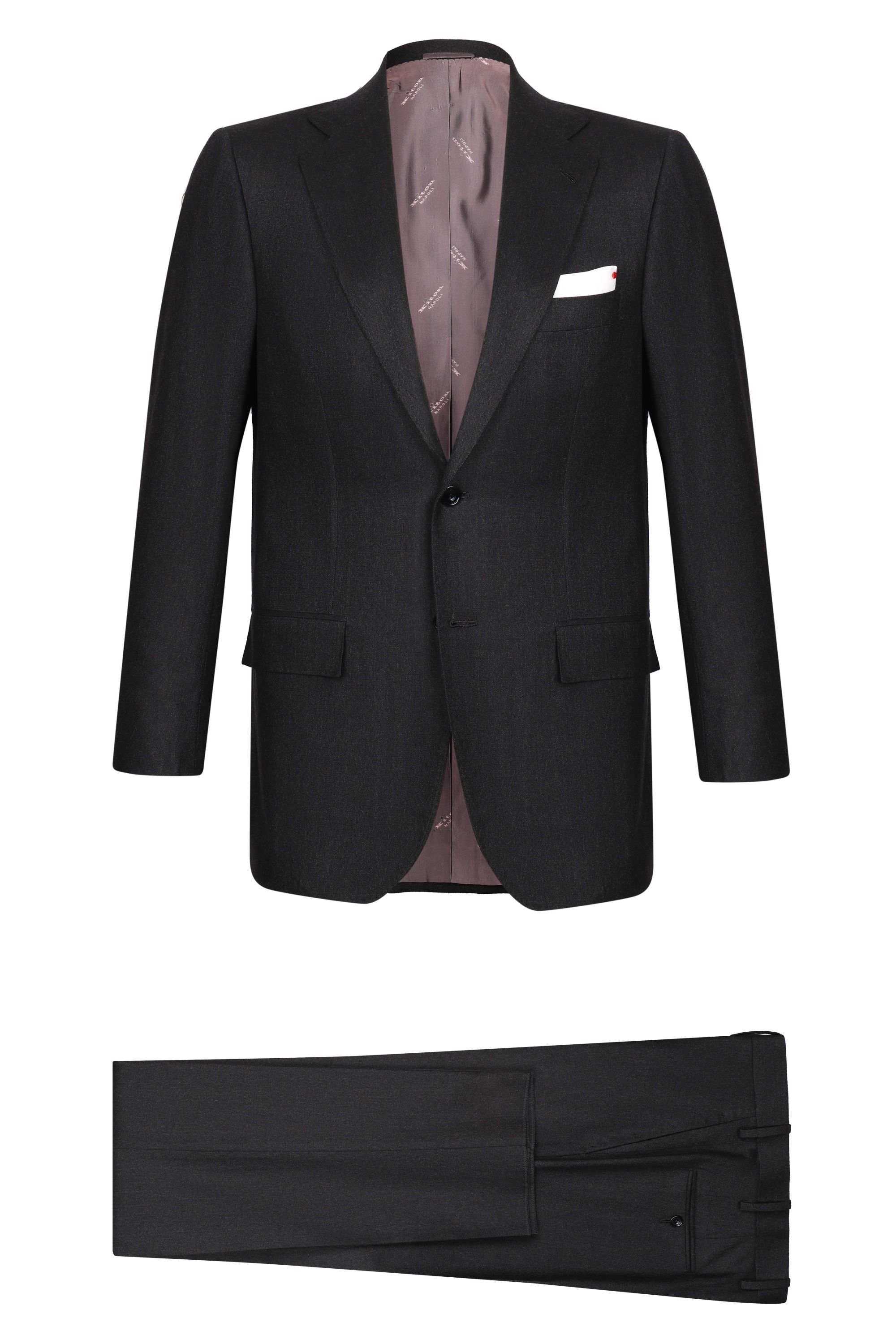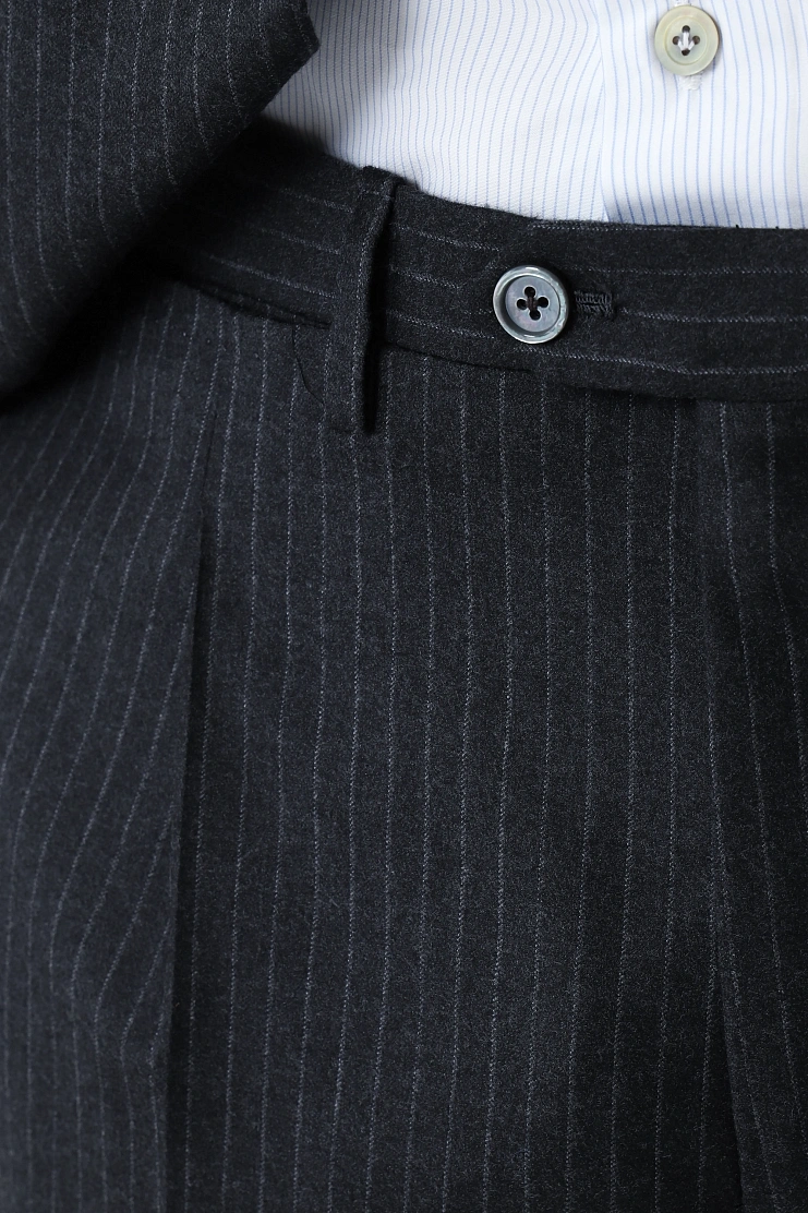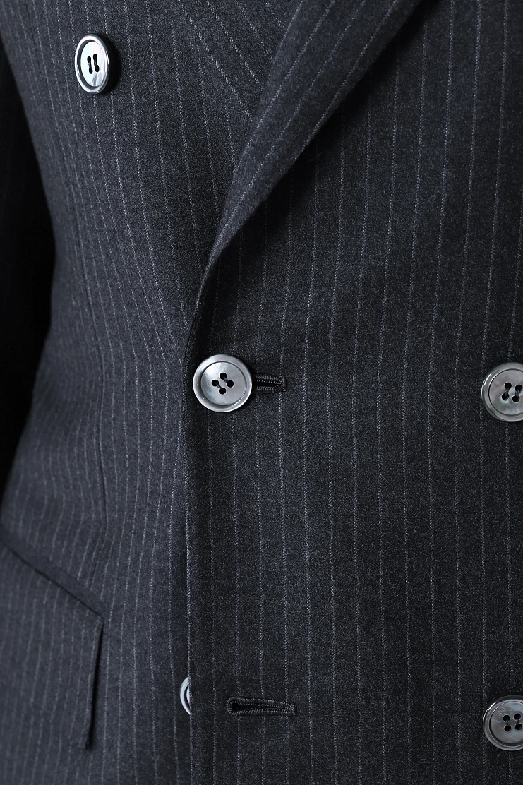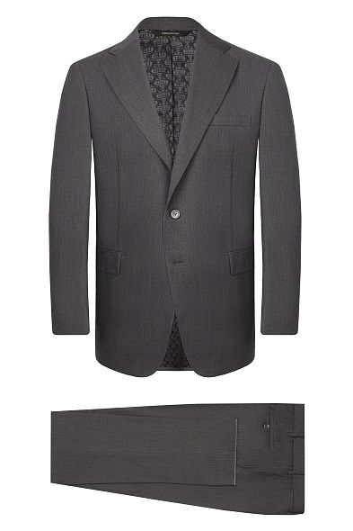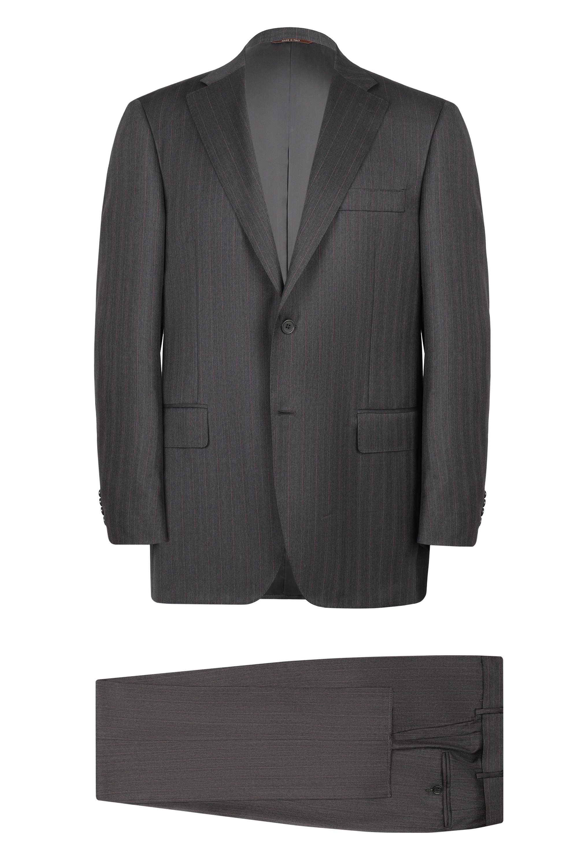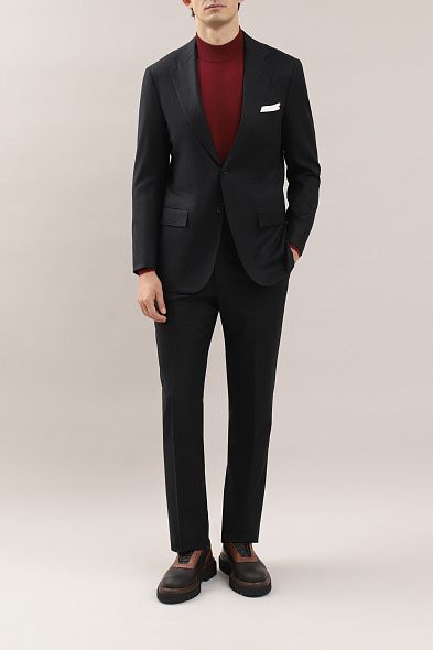 Костюм в вертикальную полоску выполнен из тончайшей шерсти 14 MIC, придающей изделиям невероятную гладкость и шелковистость. Слегка приталенный двубортный пиджак с заостренными лацканами и классические брюки со стрелками идеально дополняют друг друга.