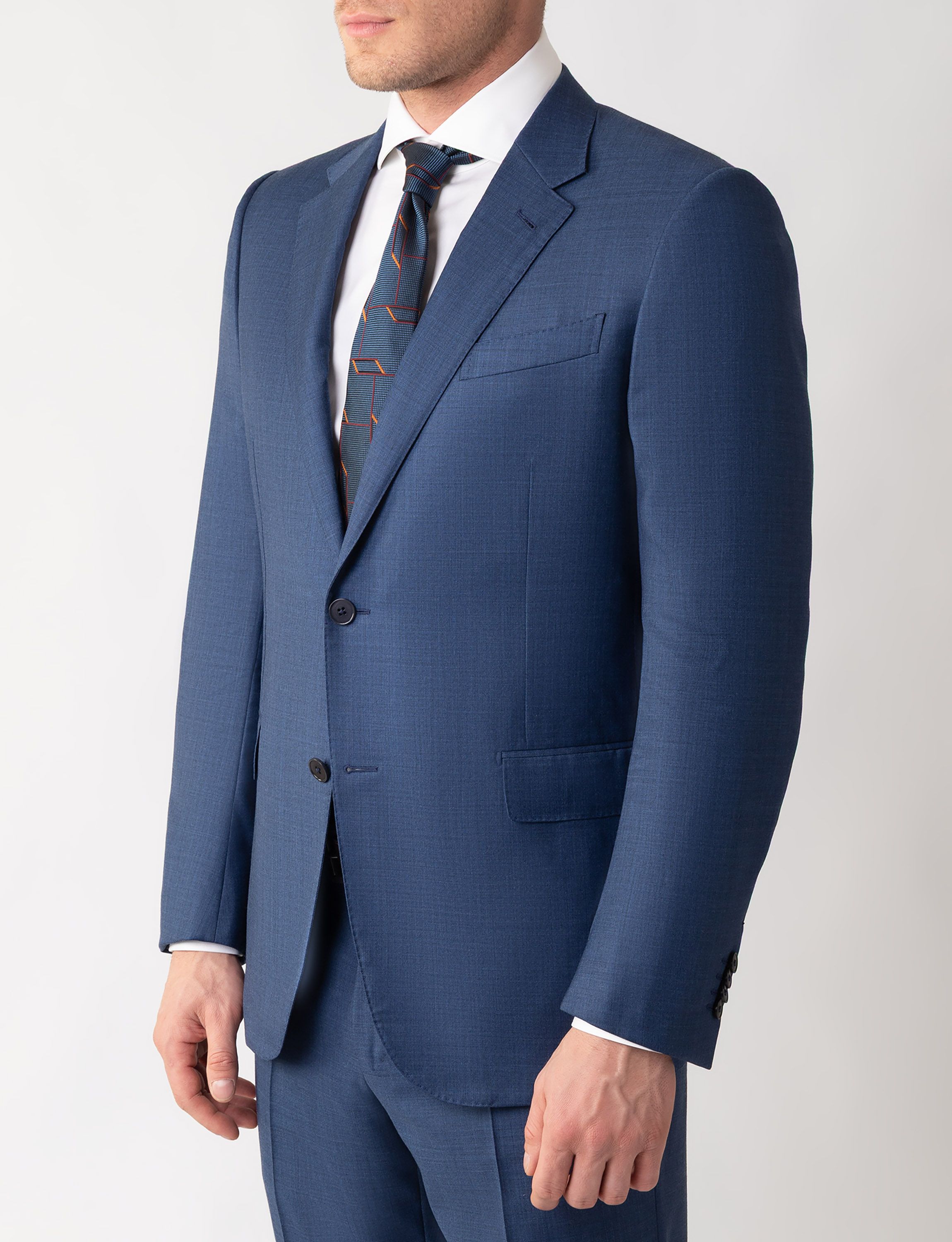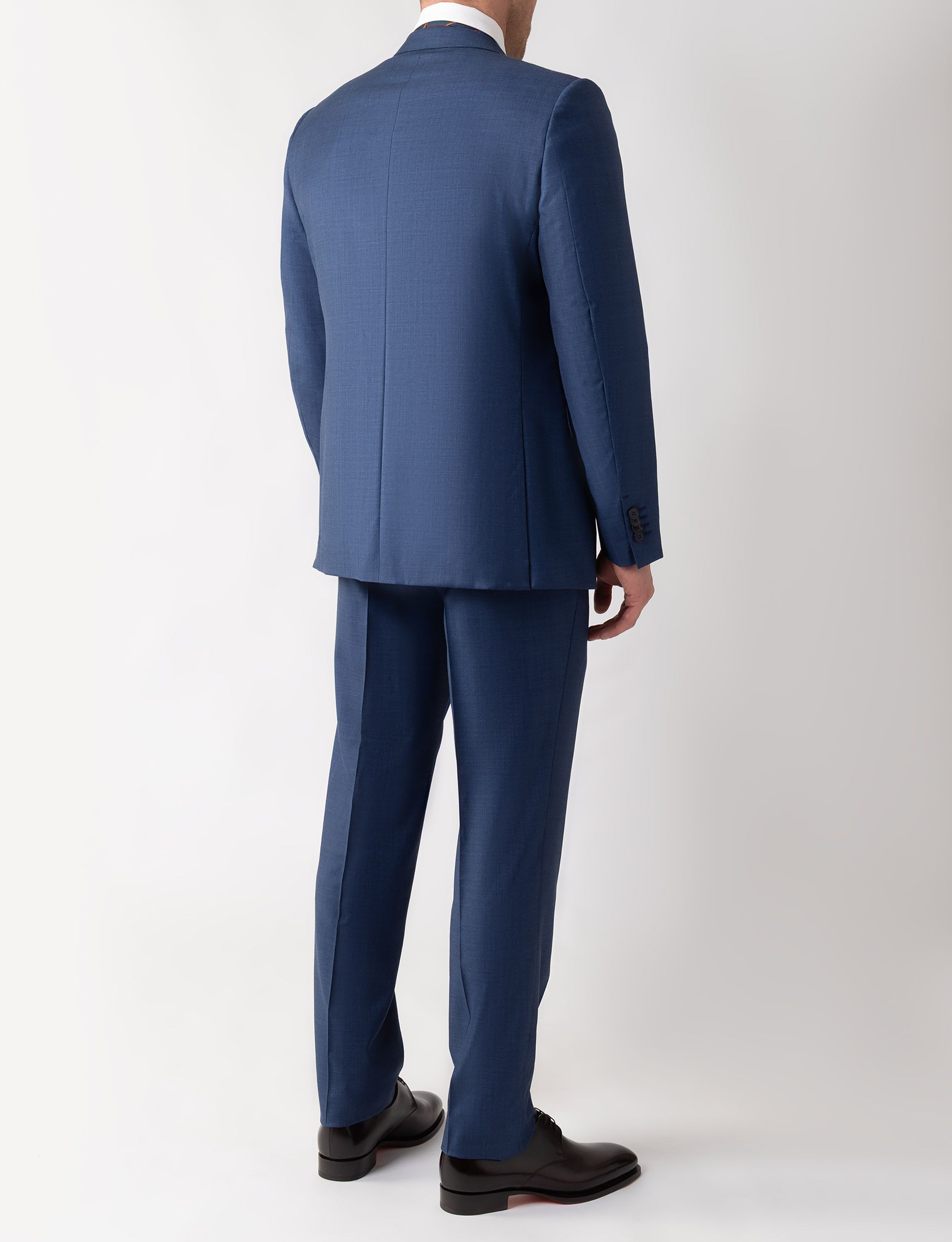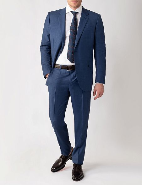 Костюм сшили из тончайшей шерстяной ткани, волокна которой отличаются особой мягкостью и прочностью. Однобортный пиджак с прямоугольными лацканами дополнен тремя внешними карманами, а брюки — проглаженными стрелками и двумя парами карманов.