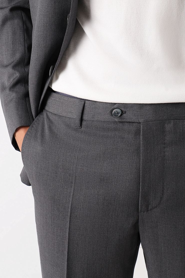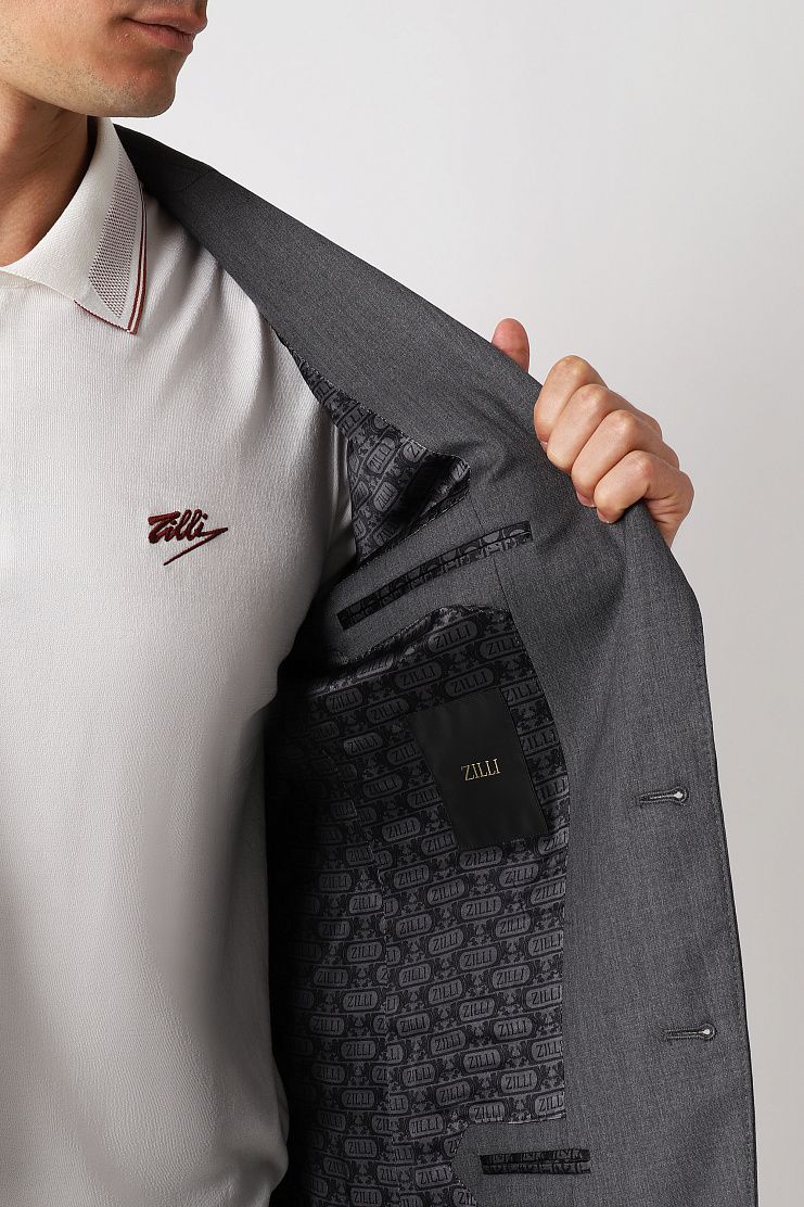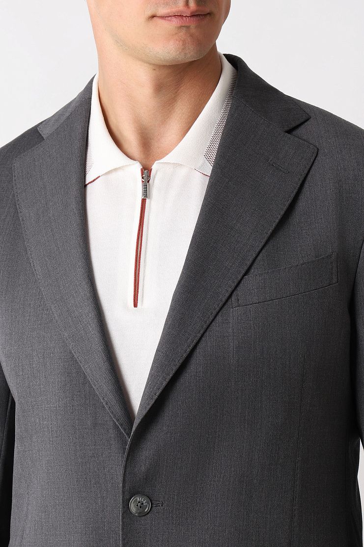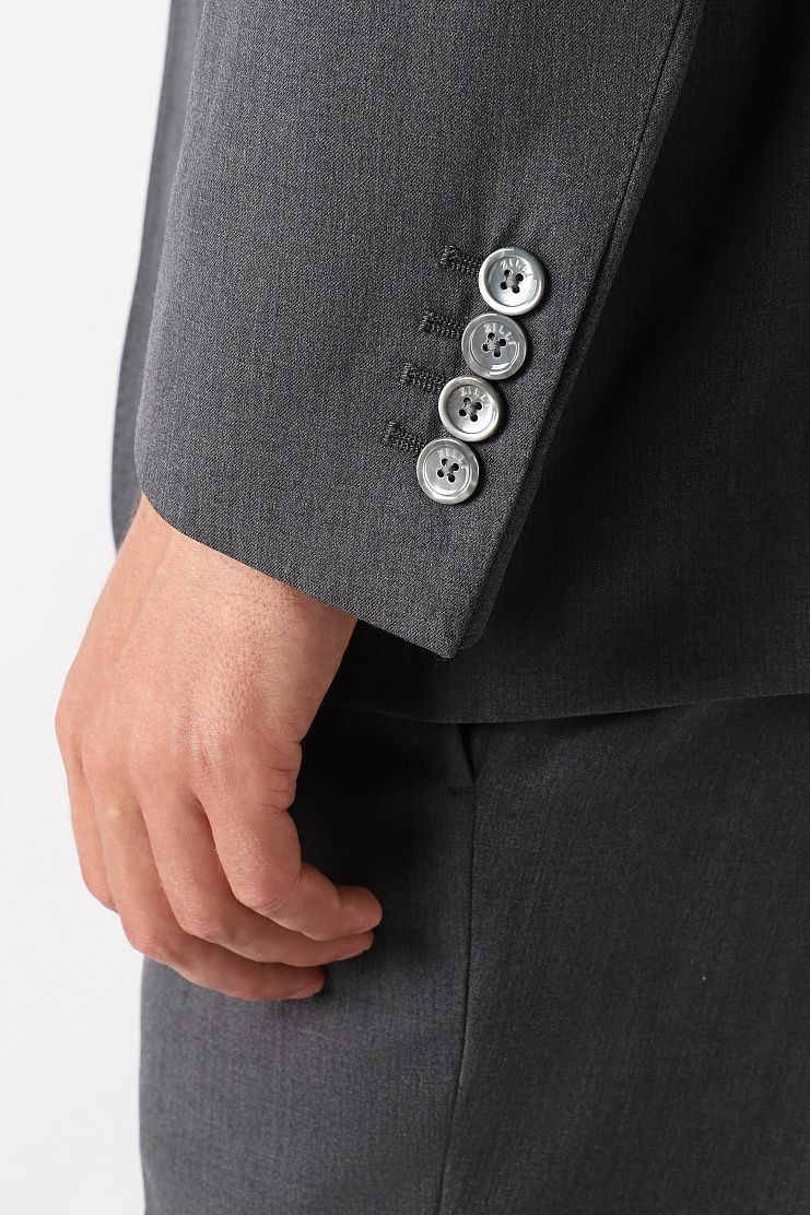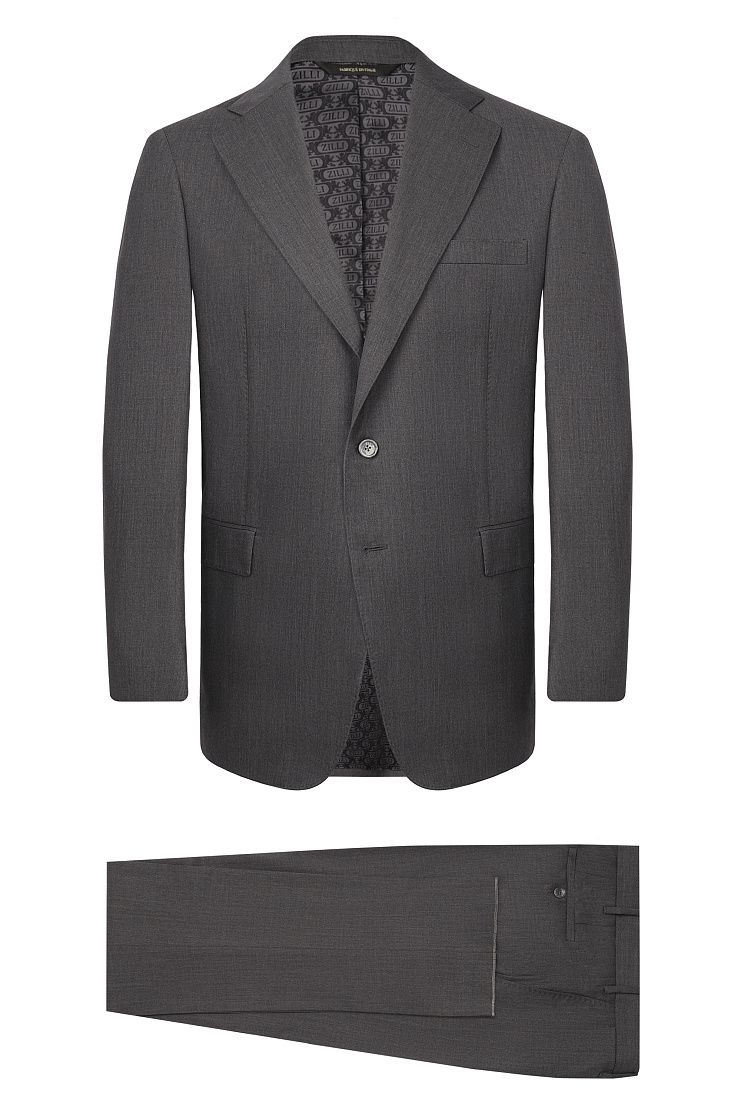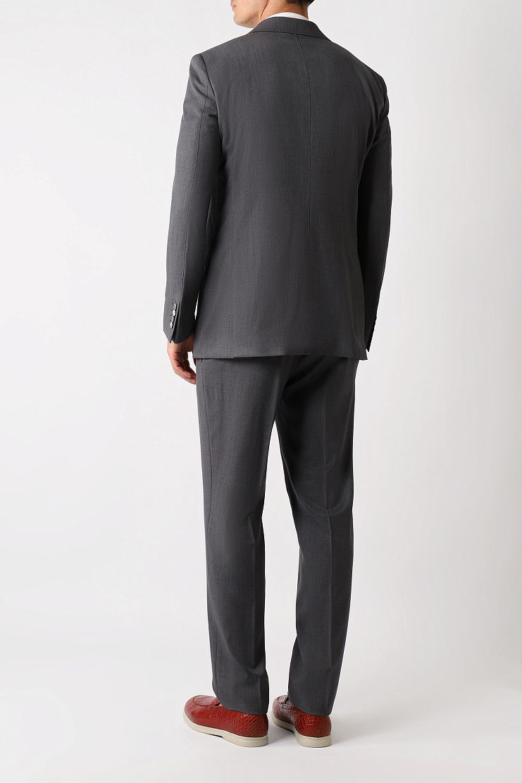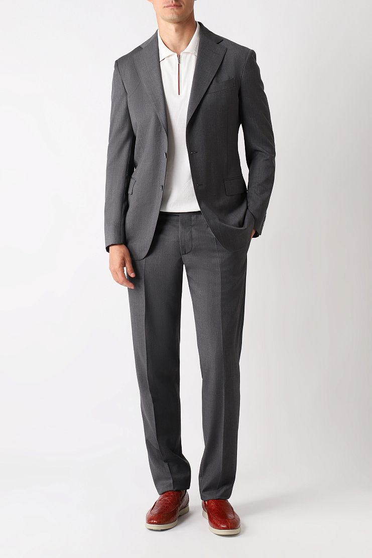 Серый костюм выполнен из мягкой немнущейся шерсти. Тщательно выверенный крой гарантирует идеальную посадку. Костюм дополнен пуговицами с перламутровым отливом. Модель идеально подойдет для официальной встречи.