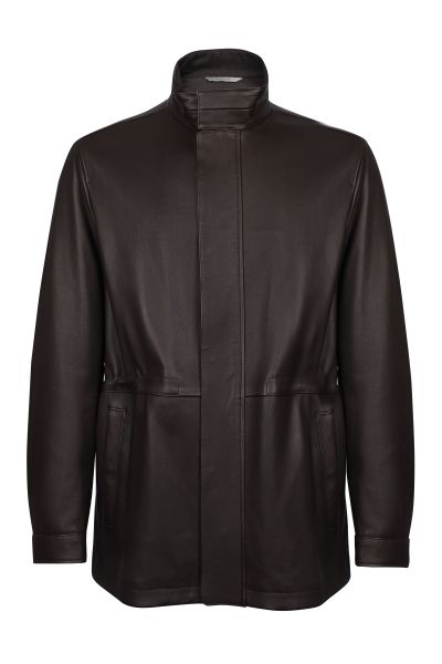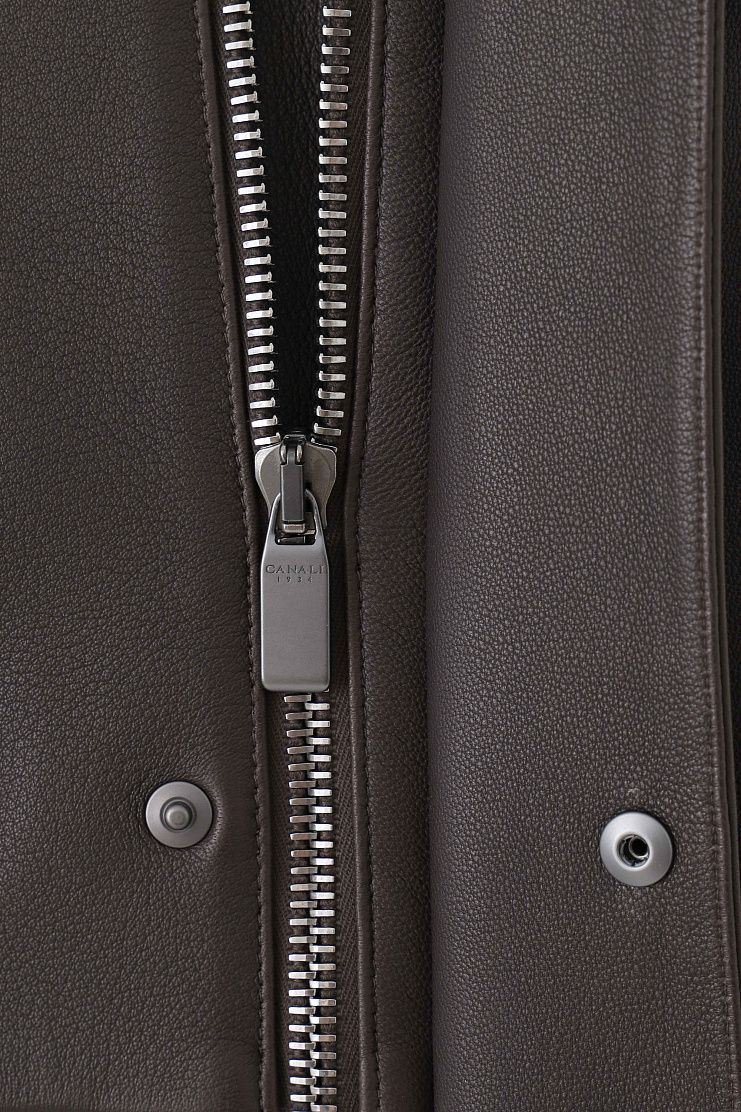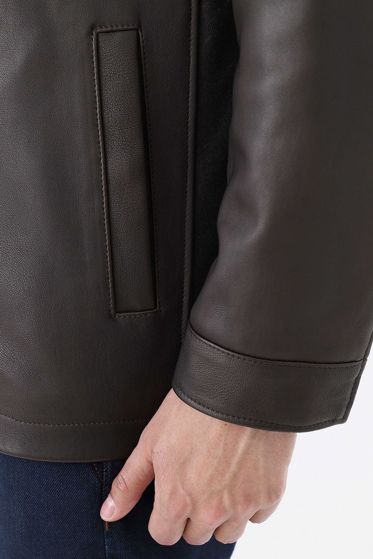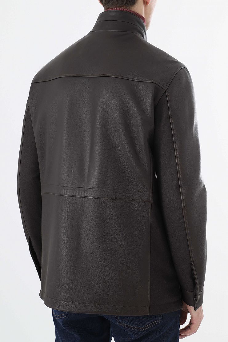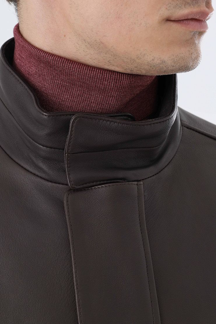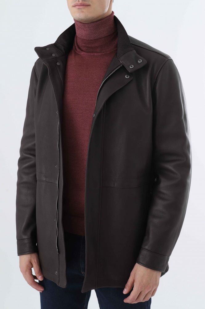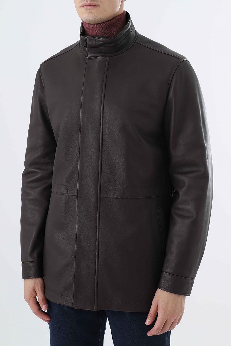 Удлиненная кожаная куртка с воротником-стойкой подойдет для стильного современного образа. Модель прямого кроя, с застежкой на скрытую молнию и кнопки.
