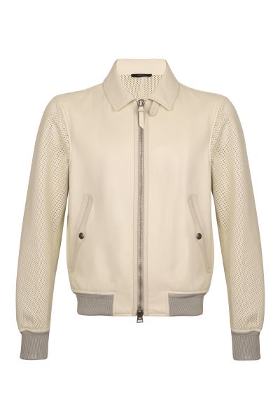 Кожаная куртка бежевого цвета с сетчатыми рукавами и вставкой на спине отлично подойдет для стильного городского образа. Модель свободного кроя имеет отложной воротник с ремешком, боковые карманы и застежку на молнию.