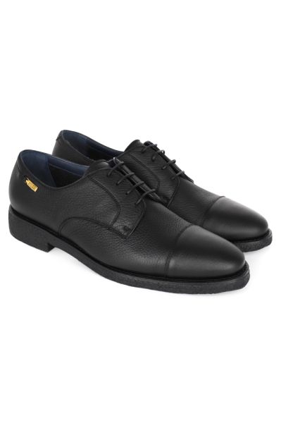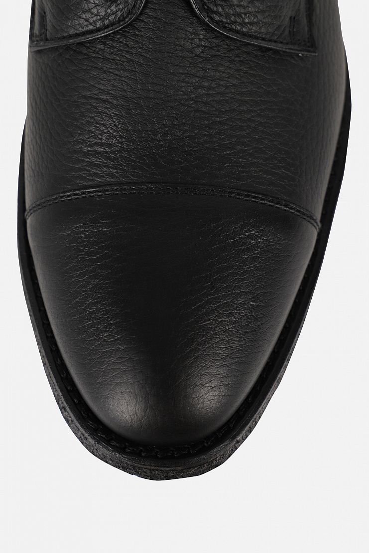 Дерби из зернистой кожи. Модель с подкладкой и стелькой из шерсти, на тонкой подошве и низком каблуке. Сбоку на задней части расположен логотип бренда в виде слитка.