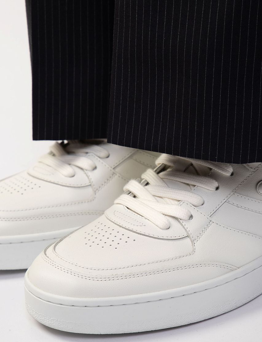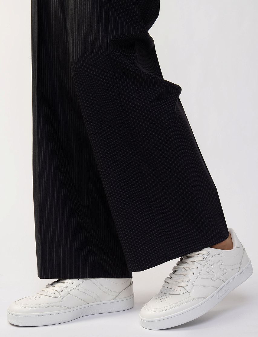 Кеды на сплошной резиновой подошве выполнили из гладкой телячьей кожи. Модель на шнуровке дополнена перфорацией на закругленном мысе. О принадлежности к бренду говорят эмблема Triomphe на боковых панелях и логотип на заднике.