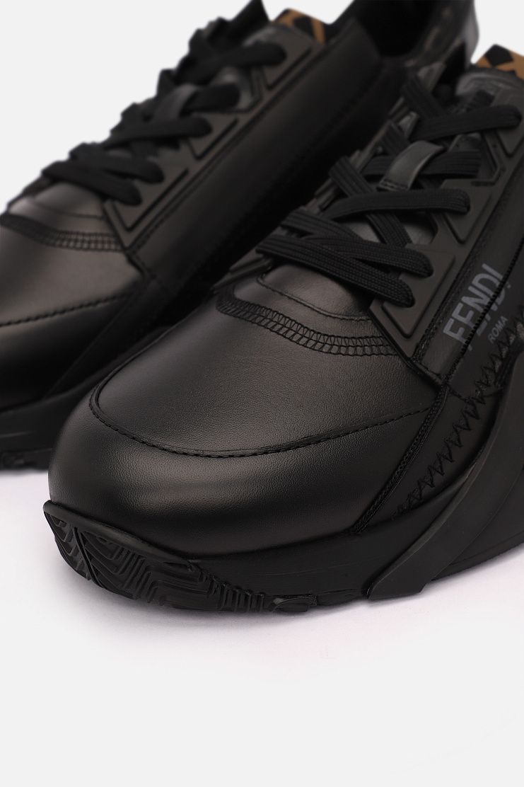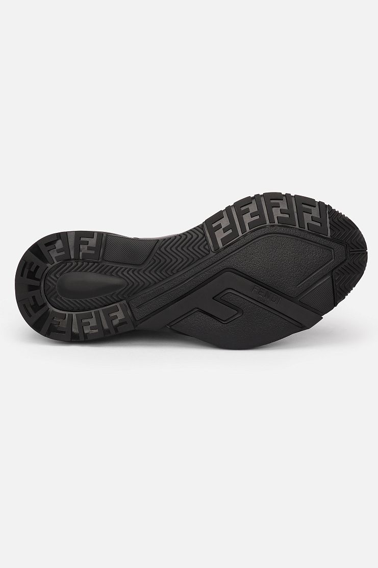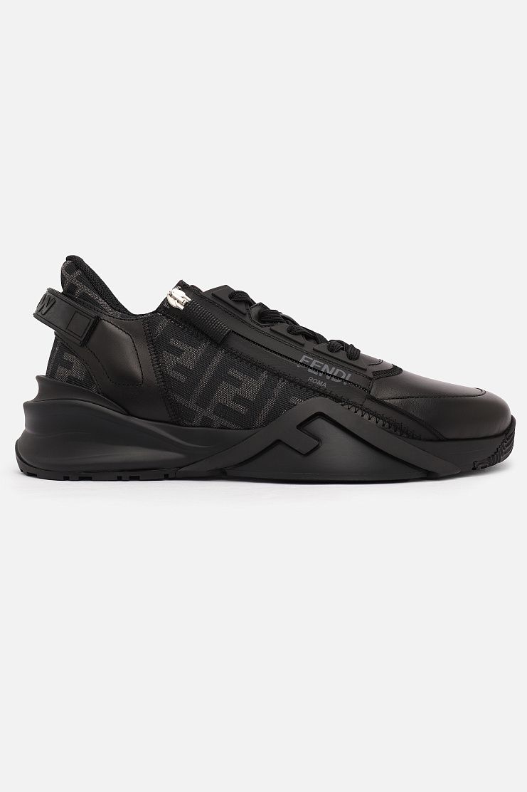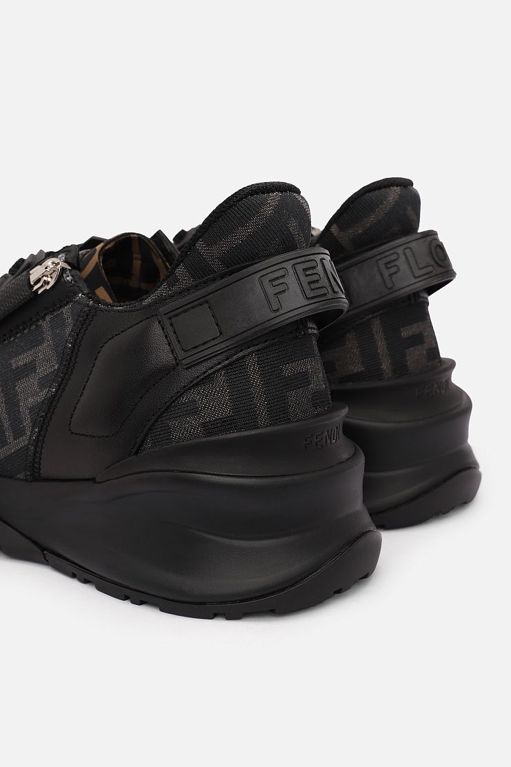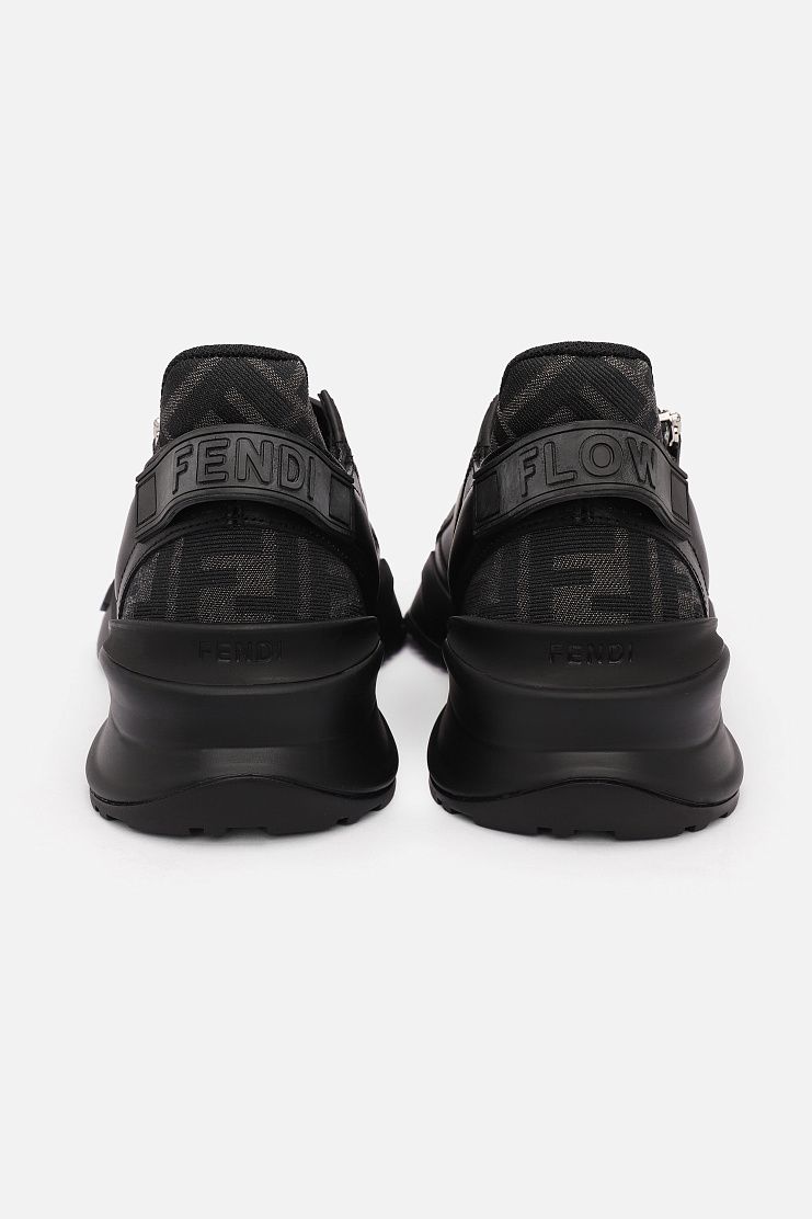 Кроссовки Flow на массивной каучуковой подошве выполнили из гладкой телячьей кожи и плотного текстиля с паттерном FF. Пару на шнуровке дополнили боковой молнией и брендированным ремешком на заднике.