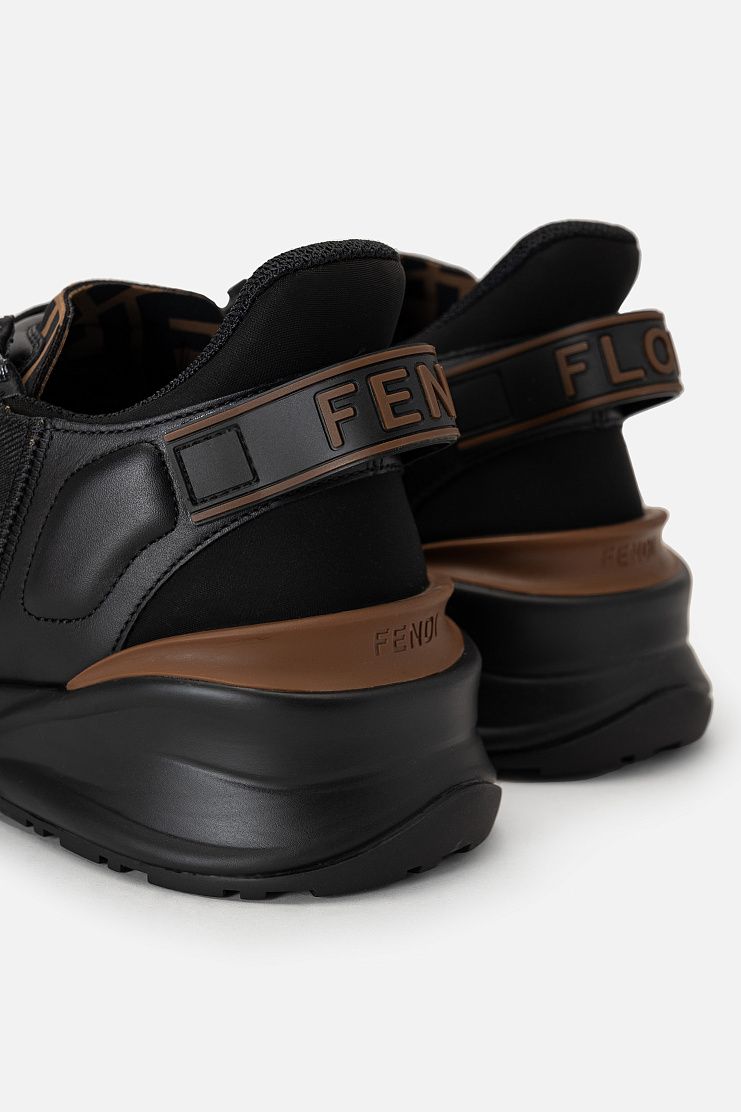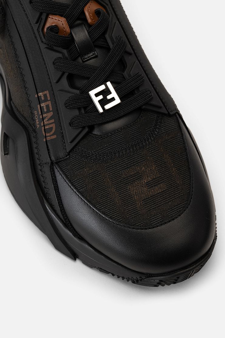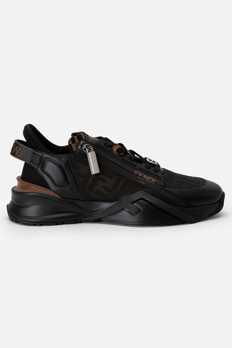 Комбинированные кроссовки Fendi Flow изготовили из телячьей кожи и жаккардового текстиля. Помимо шнуровки, дизайнеры предусмотрели боковую молнию. Массивная фигурная подошва из резины украшена диагональной деталью F в тон. Логотипы бренда разместили также на язычке и петле на заднике.