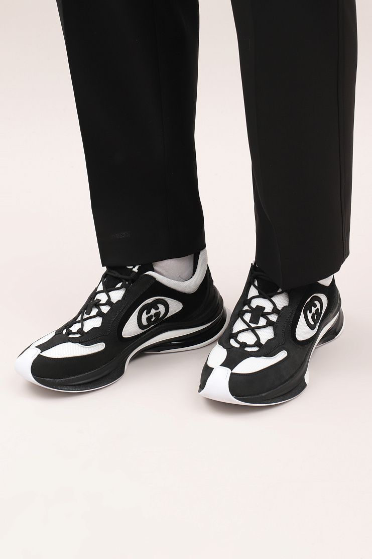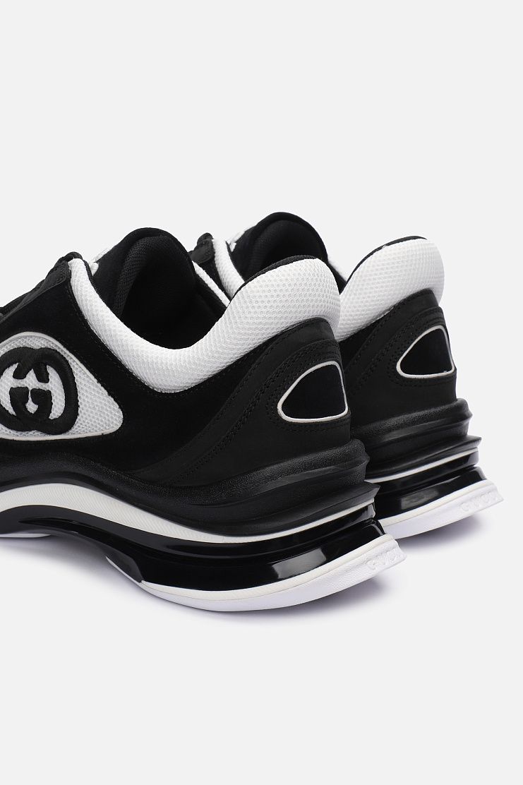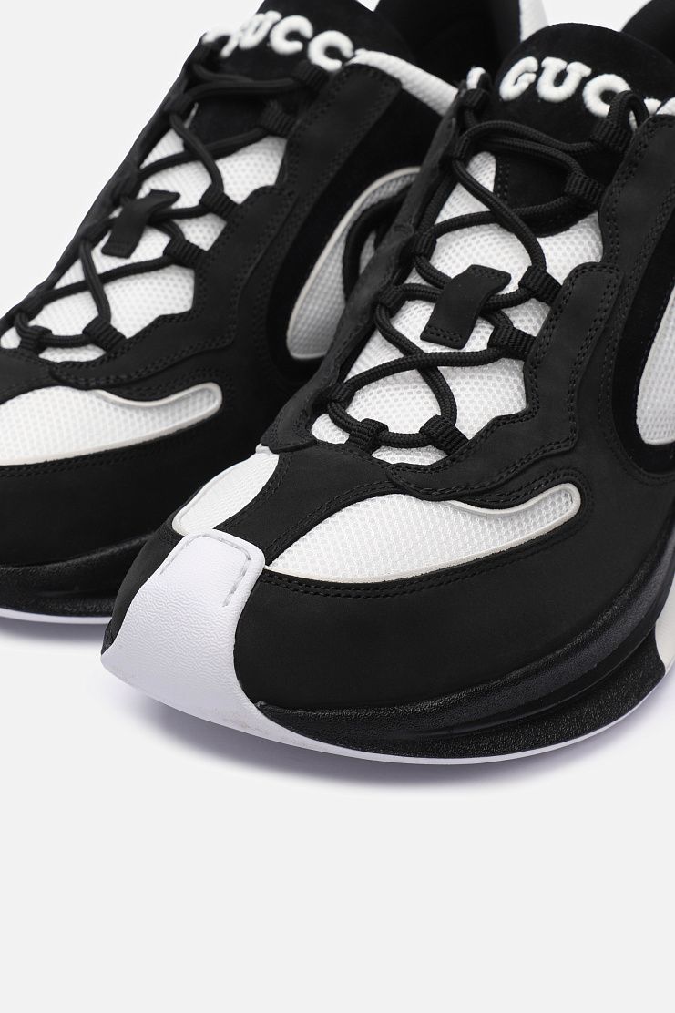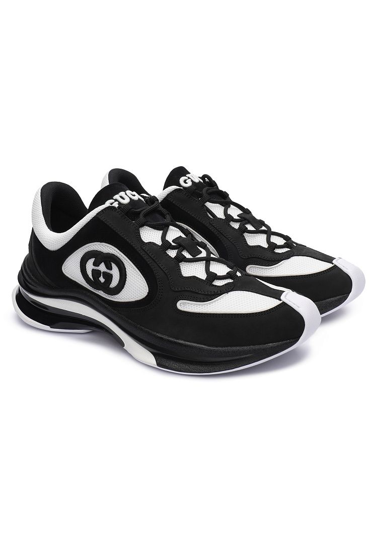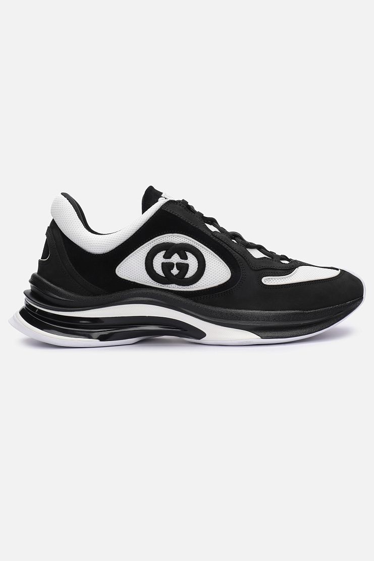 Кроссовки из замши и сетчатого трикотажа со знаменитой символикой в виде двух переплетающихся букв G и объемной вышитой надписью Gucci на язычке в стильном исполнении. Модель имеет текстильную подкладку и резиновую подошву.