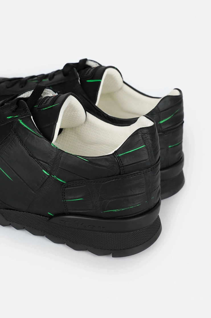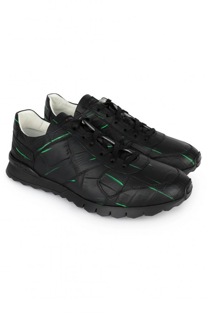 Кроссовки из кожи крокодила с зелеными полосками. Модель выполнена на кожаной подкладке, на гибкой резиновой подошве.