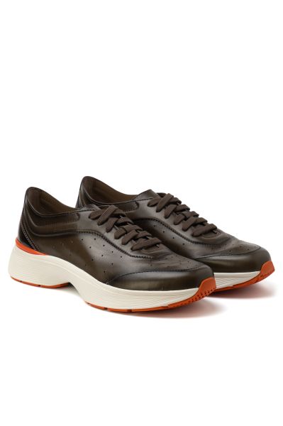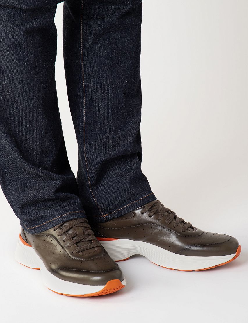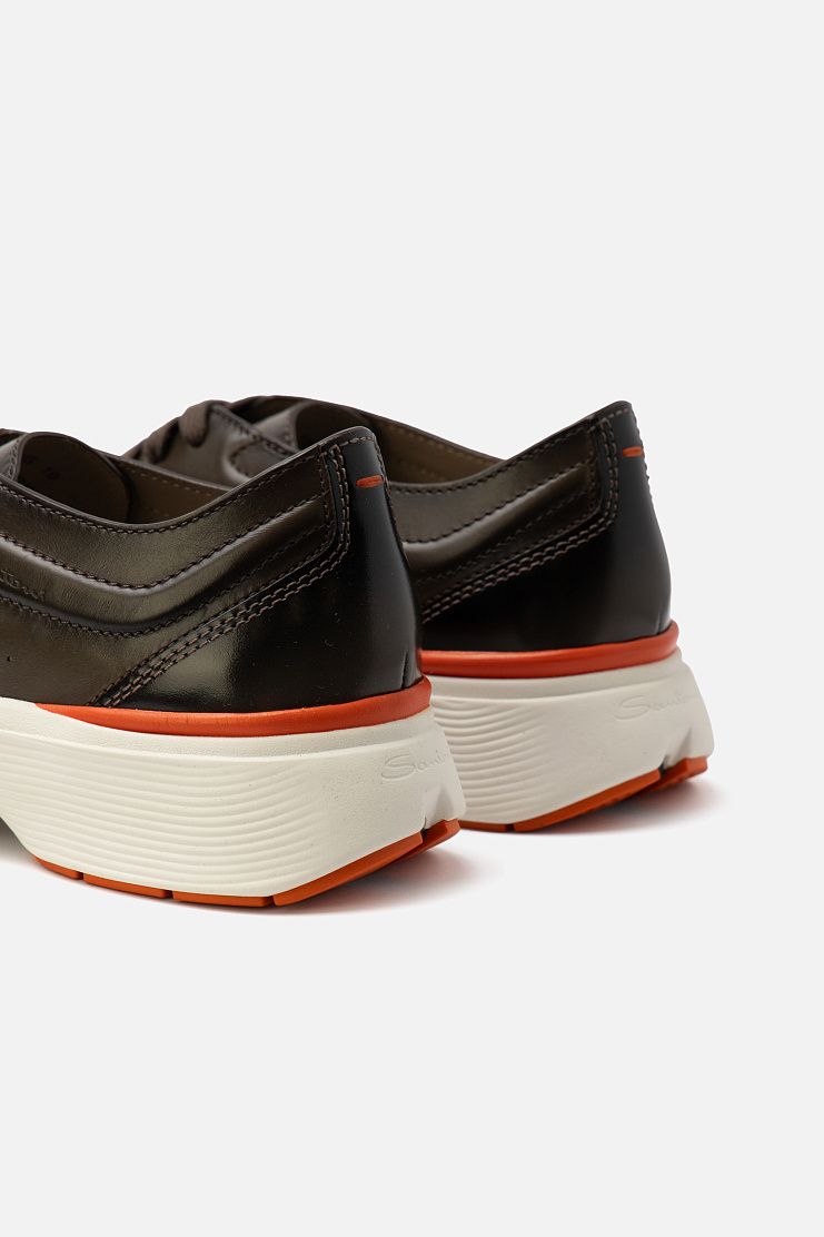 Модель дополнена перфорацией, шнуровкой и подошвой яркого оттенка Arancio Santoni.