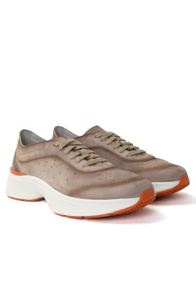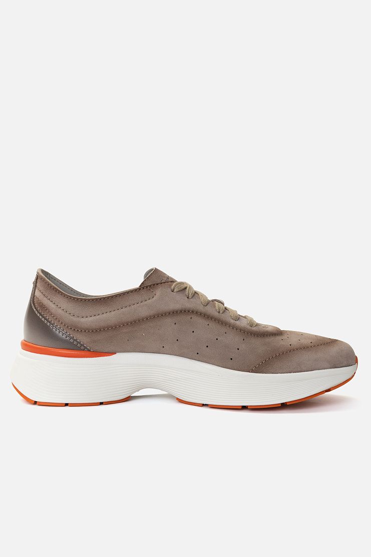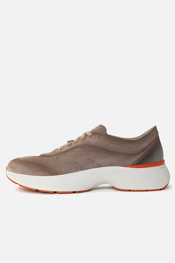 Кроссовки на массивной резиновой подошве изготовили из мягкой перфорированной замши, которую окрасили в технике velatura, чтобы получить эффект градиента. Модель дополнена задником из гладкой кожи с декоративным стежком и украшена логотипом на язычке.