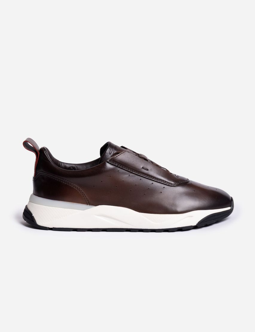 Кроссовки с перфорацией на мысе выполнили из гладкой кожи, окрашенной в технике velatura для создания эффекта патины. Пару на шнуровке установили на массивную резиновую подошву с протектором и дополнили петлей на заднике.