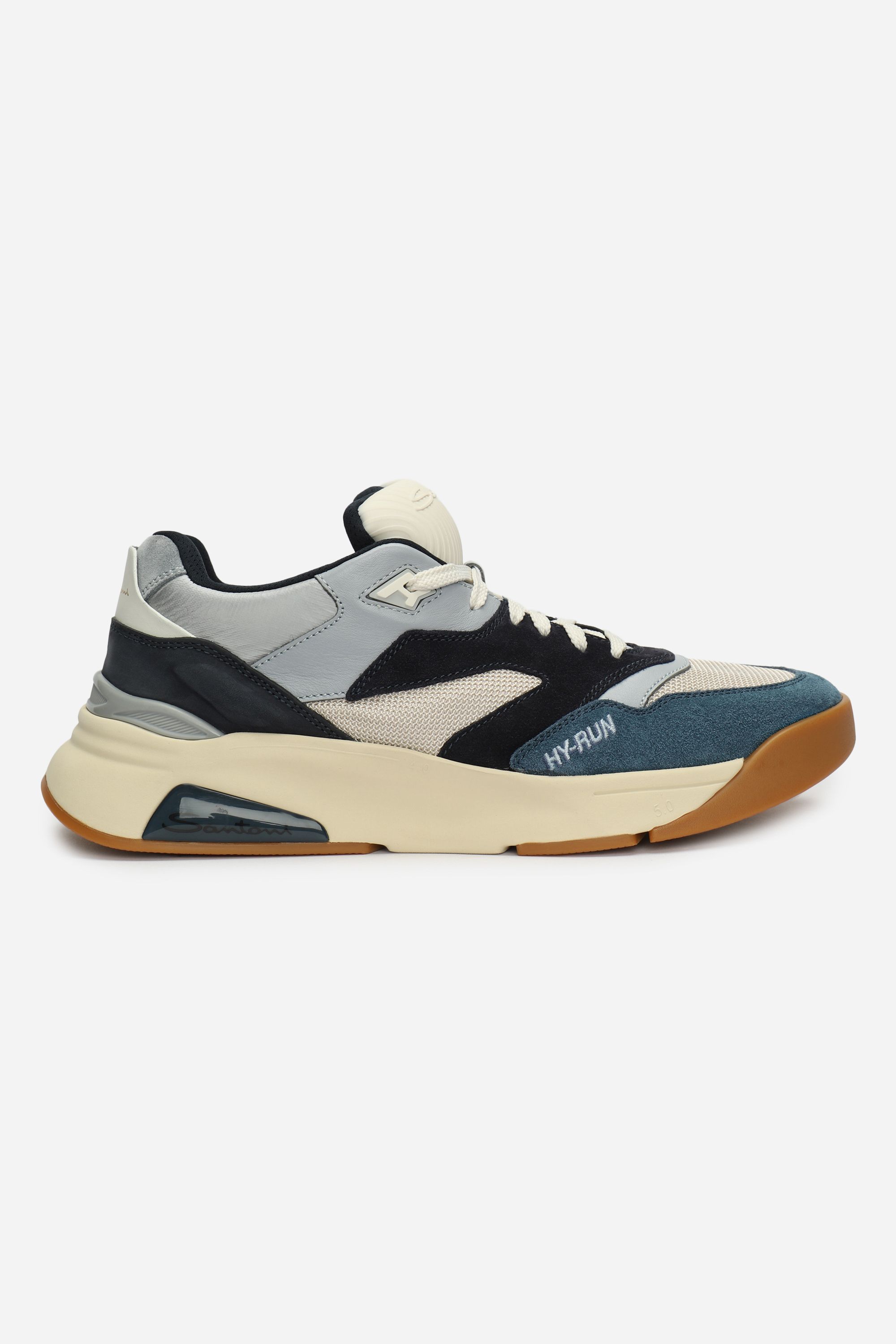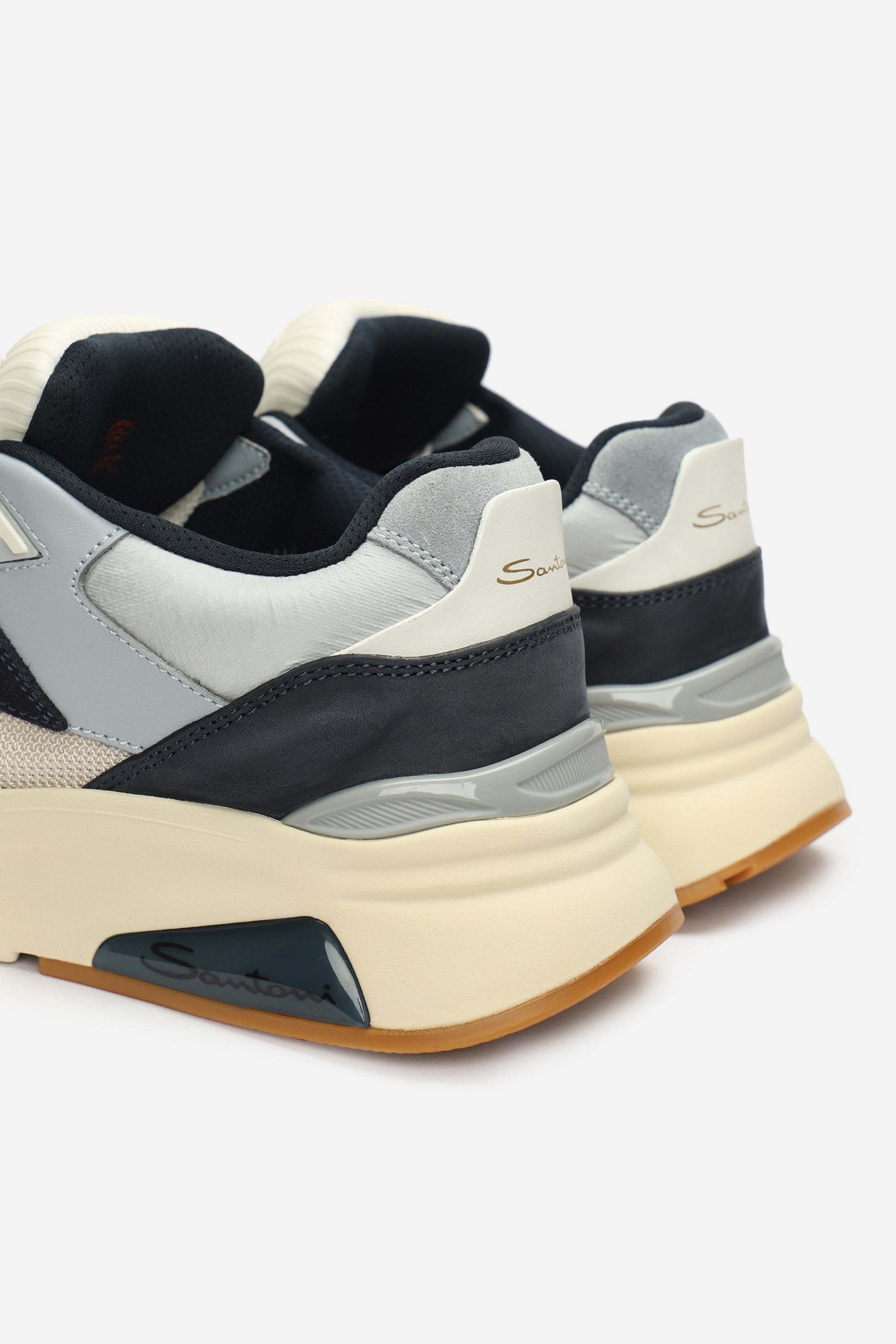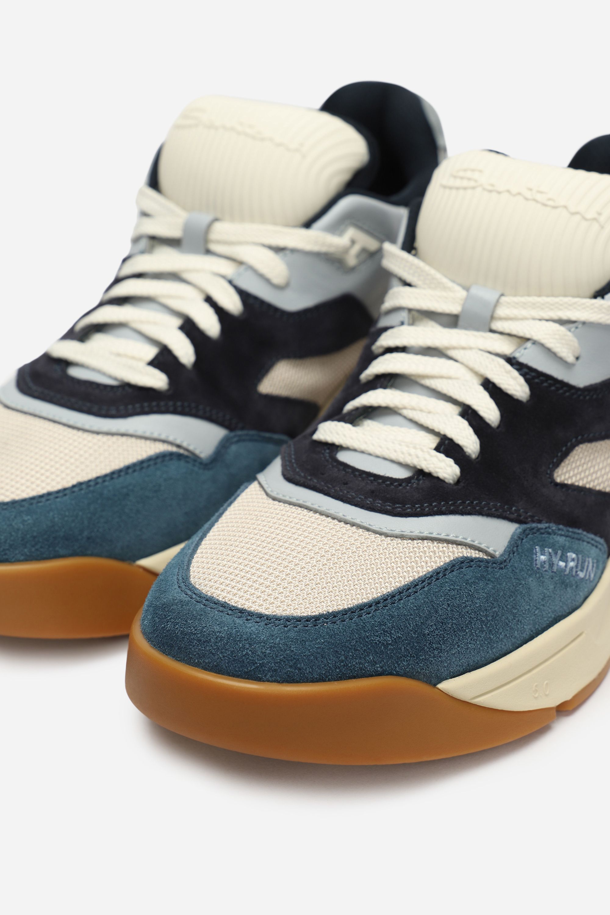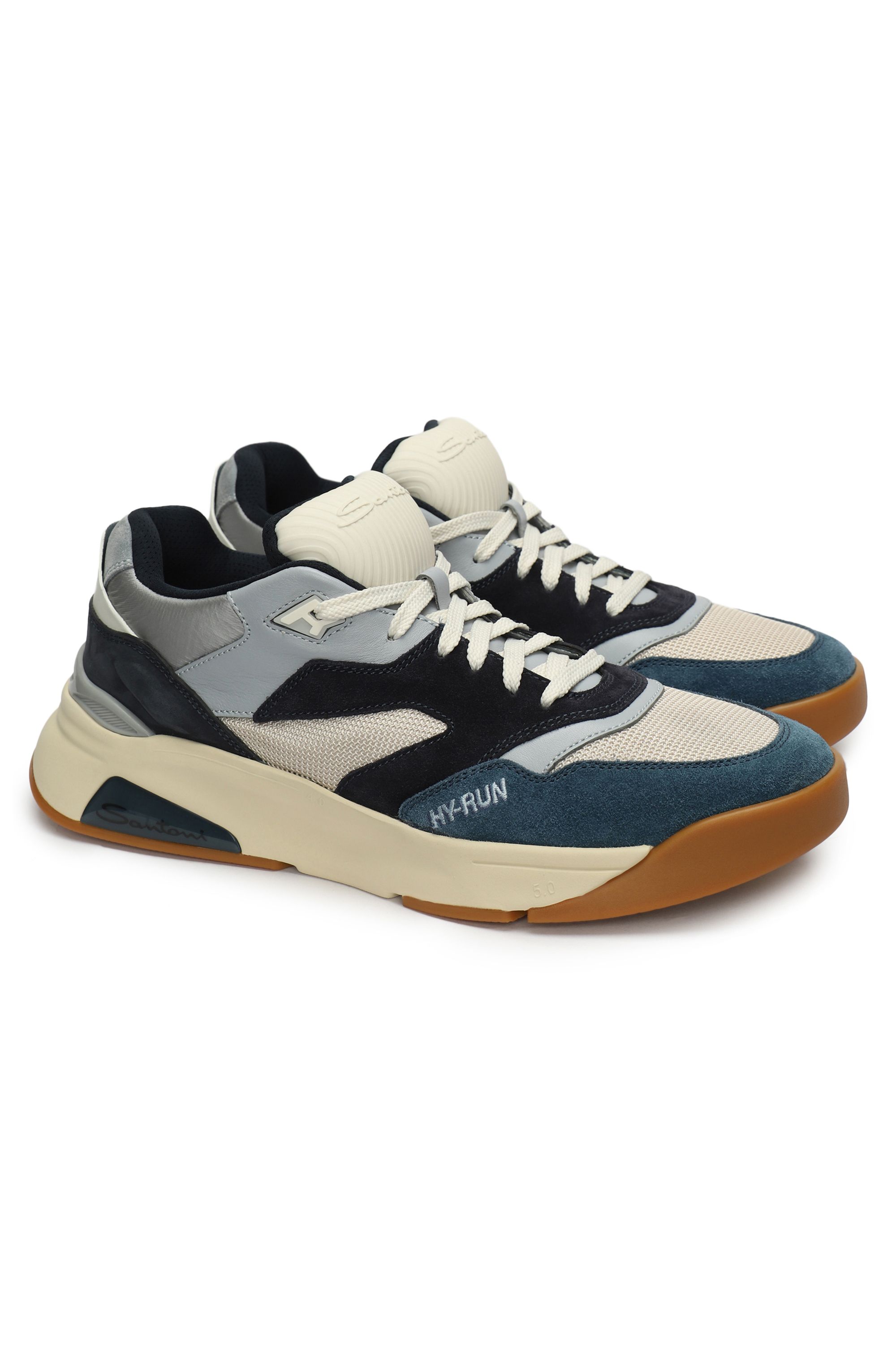 Кроссовки на легкой амортизирующей подошве выполнили из гладкого полиамида и прочной телячьей кожи, окрашенной в технике velatura. Модель с микроперфорацией дополнили эластичными трикотажным манжетом и петлей на заднике.