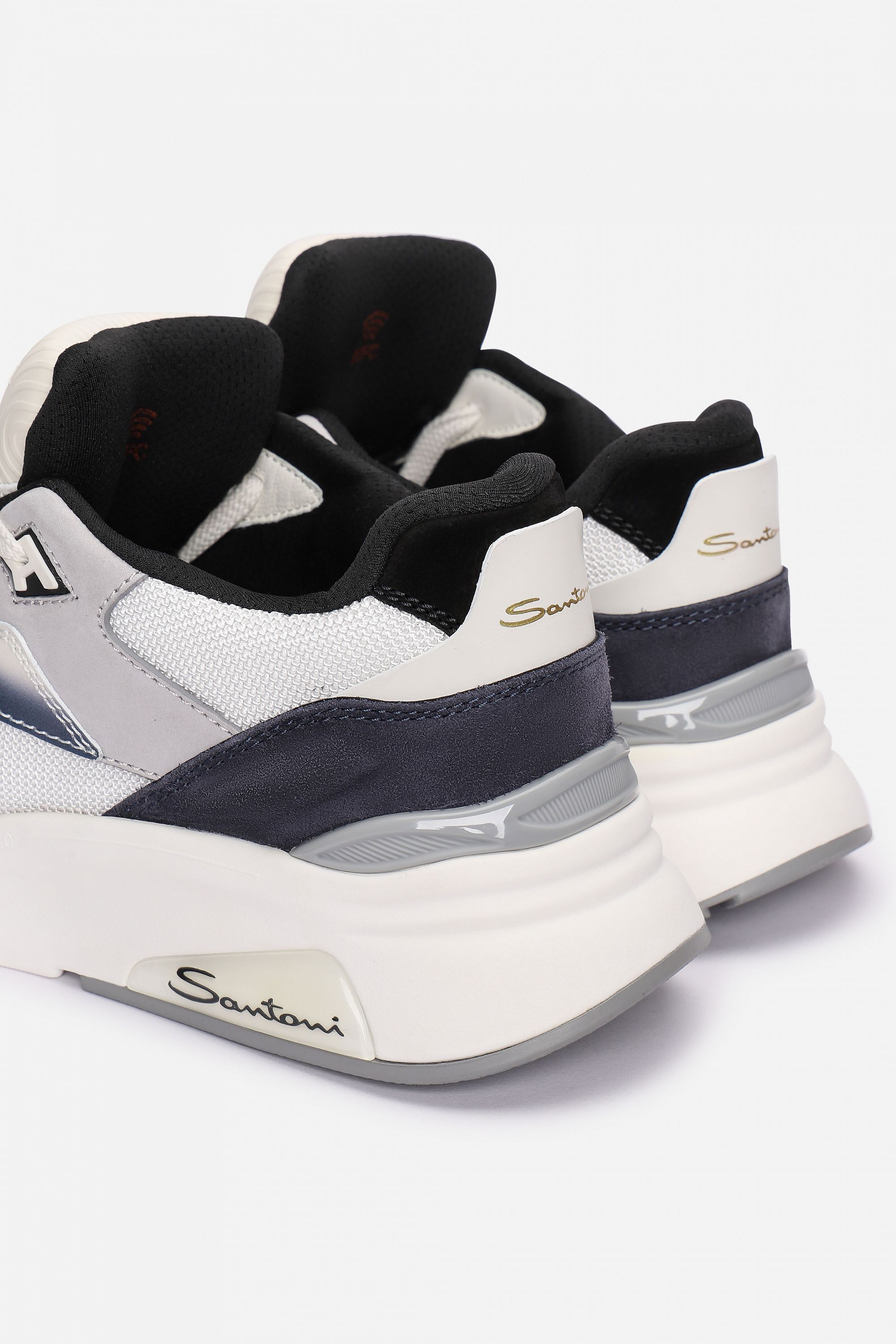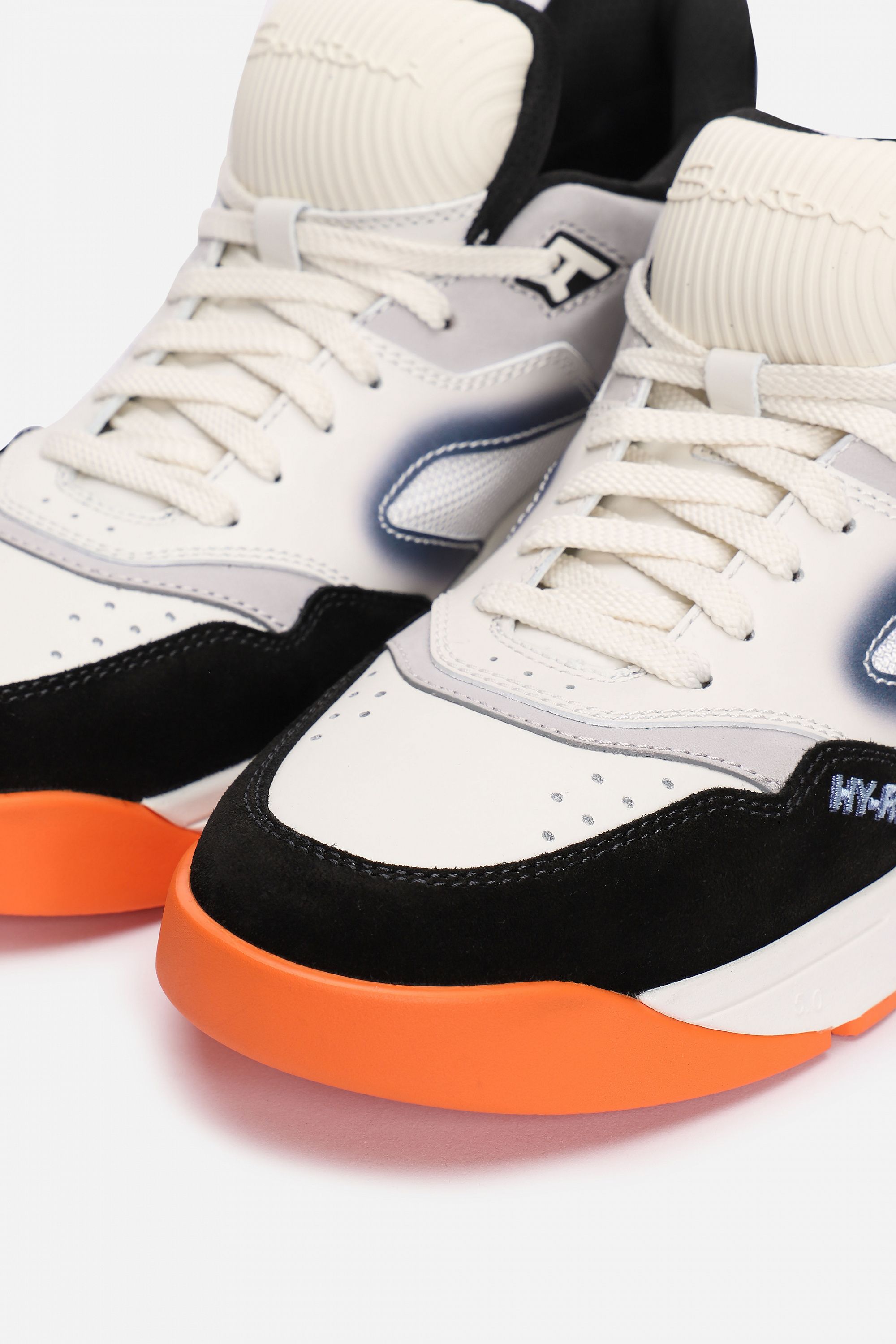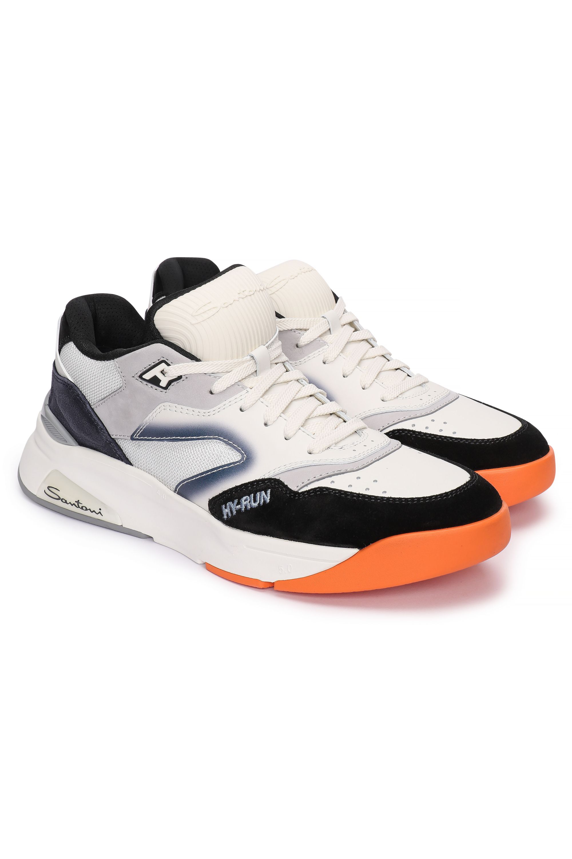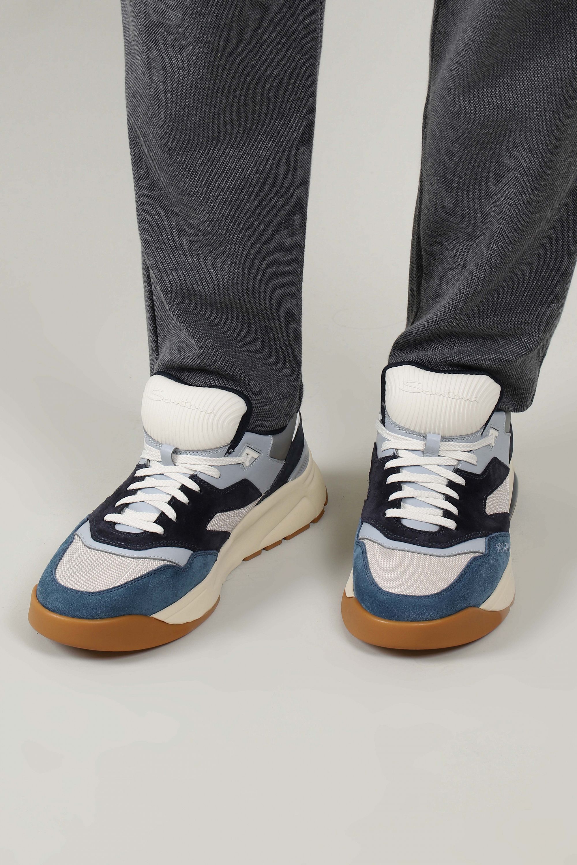 Кроссовки на легкой амортизирующей подошве выполнили из гладкого полиамида и прочной телячьей кожи, окрашенной в технике velatura. Модель с микроперфорацией дополнили эластичными трикотажным манжетом и петлей на заднике.