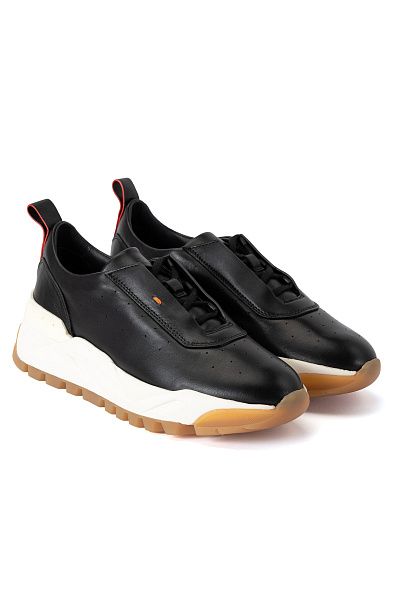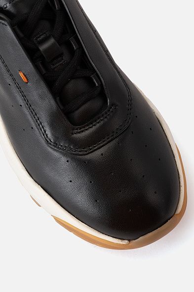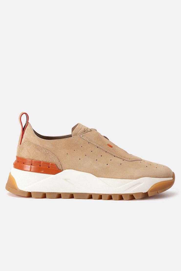 Для пошива кроссовок на массивной подошве использовали бархатистую замшу. Модель декорирована логотипом бренда на язычке и стежком фирменного оранжевого оттенка на заднике.