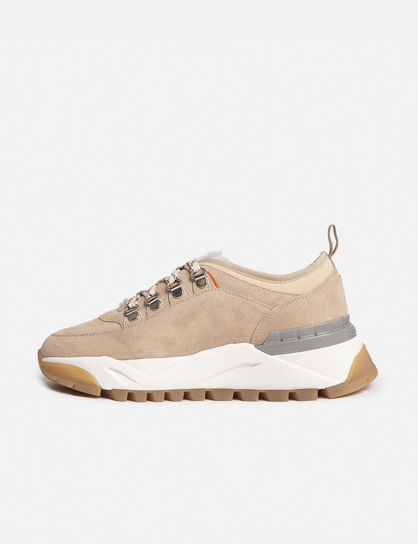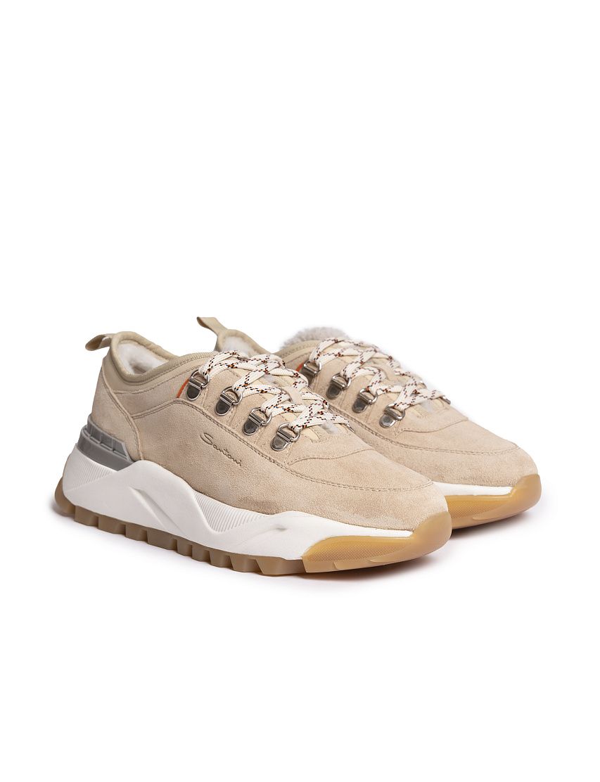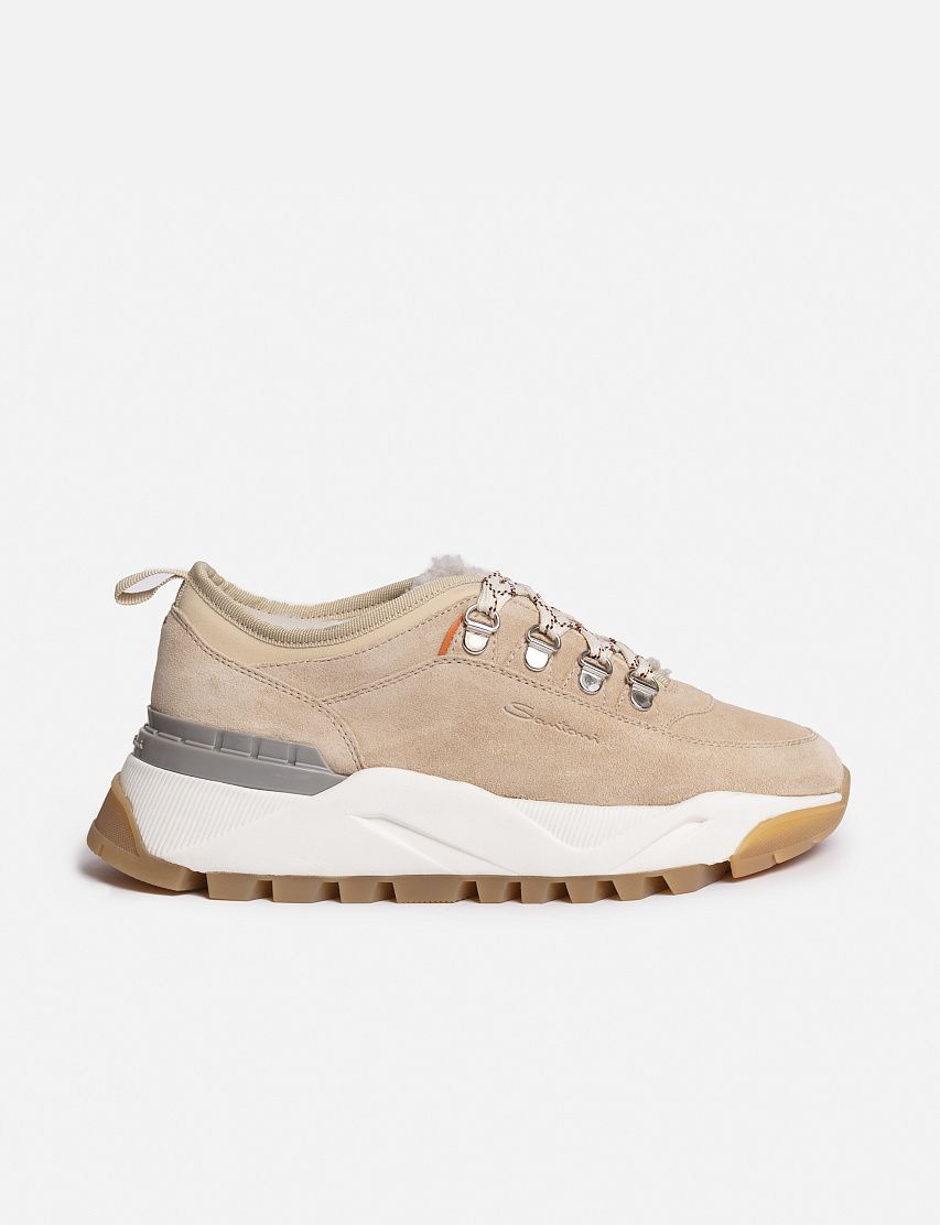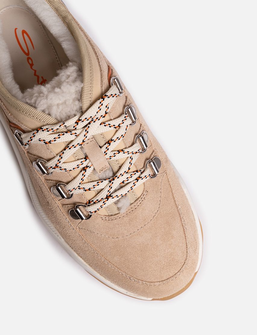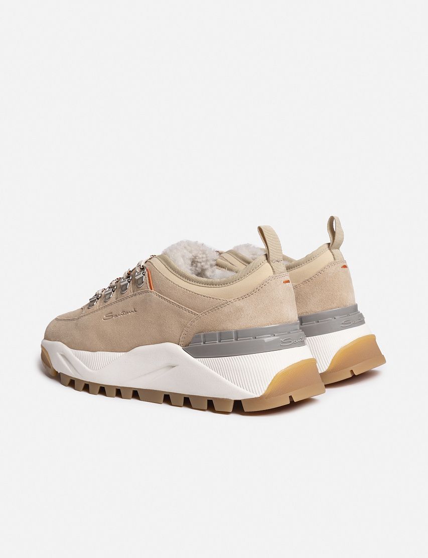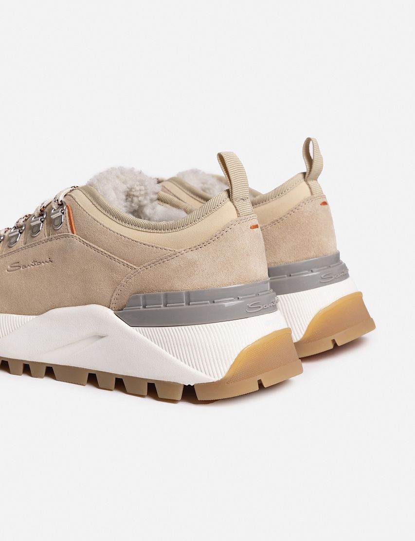 Утепленные замшевые кроссовки отлично подойдут для прохладной погоды. Модель на массивной резиновой подошве дополнили текстильной отделкой, шнуровкой и петлей на заднике. Стежок фирменного оттенка Arancio Santoni говорит о принадлежности бренду.