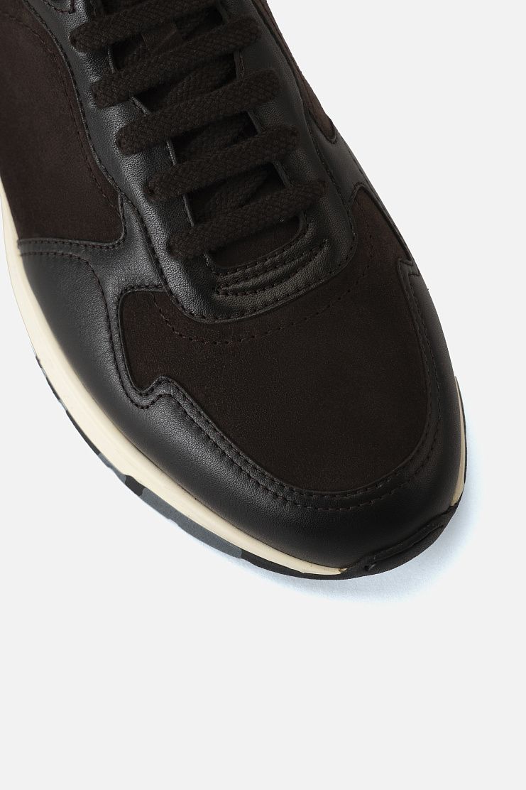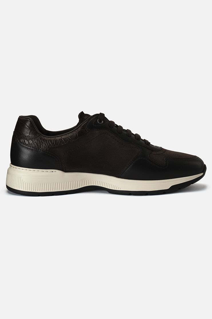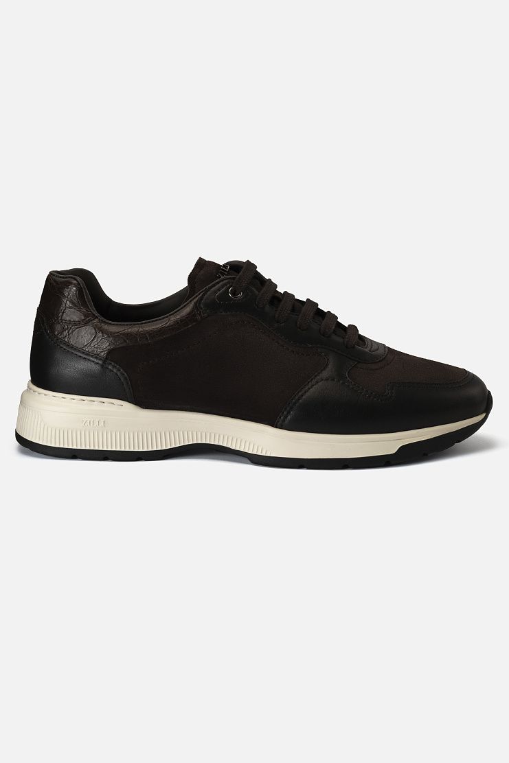 При изготовлении этой пары за основу взяли мягкую телячью кожу и бархатистую замшу. Модель на резиновой подошве с протектором дополнили шнуровкой и украсили вставками из фактурной кожи каймана. Такая обувь гармонично завершит непринужденный образ в стиле smart casual.