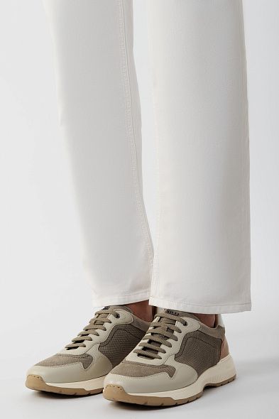 Комбинированные кроссовки на контрастной полимерной подошве выполнили из мягкой бархатистой замши, дополнив вставками из гладкой телячьей кожи на мысе, шнуровке и заднике. Пара украшена лаконичным металлическим логотипом на язычке.