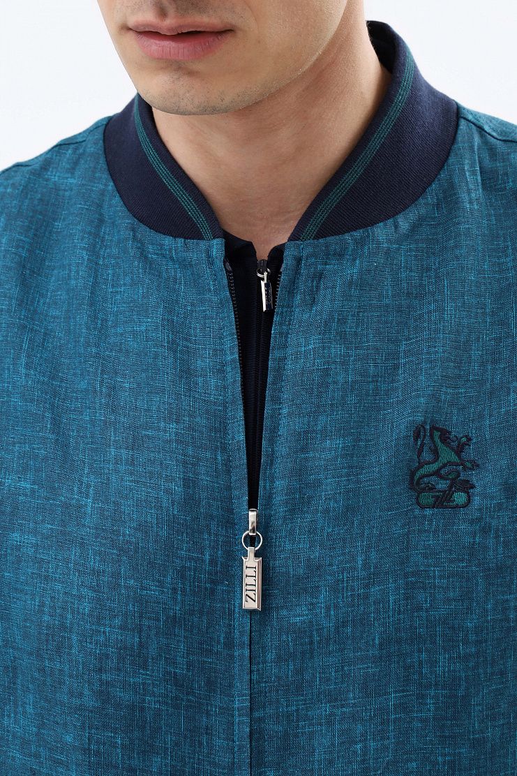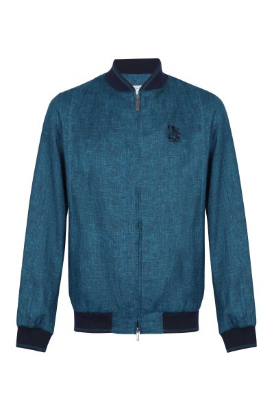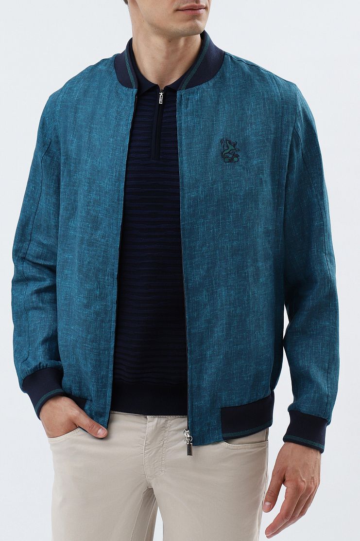 Льняная куртка-бомбер с вышивкой в виде льва на груди. Модель свободного кроя имеет боковые карманы и застежку на молнии. Воротник, манжеты и низ изделия выполнены из трикотажной резинки.