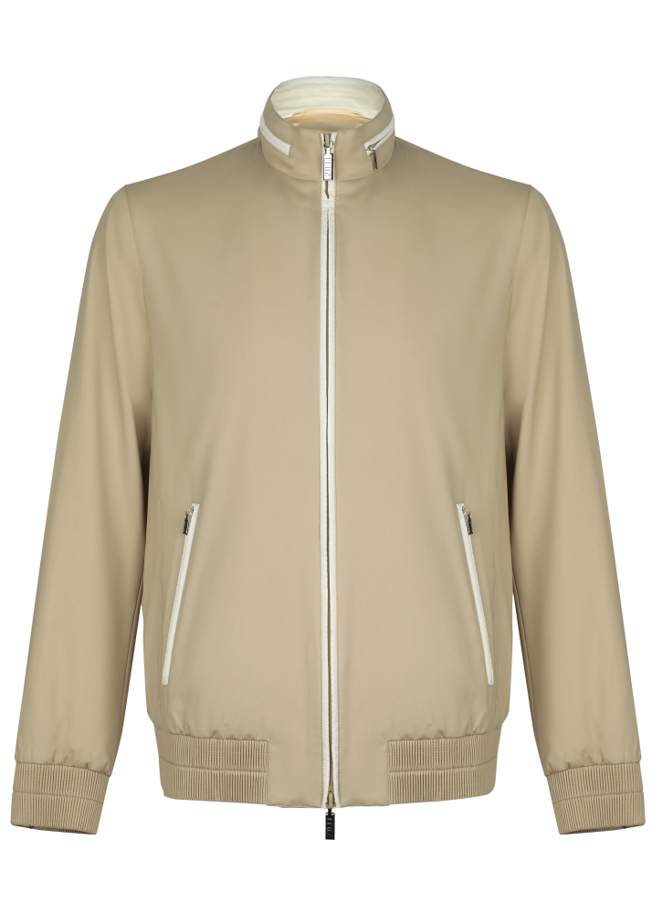 Шикарная куртка-бомбер выполнена из шелка и дополнена кожаными деталями. Модель имеет воротник-стойку, боковые карманы и манжеты и нижний край на резинке. Изделие застегивается на фирменную молнию.