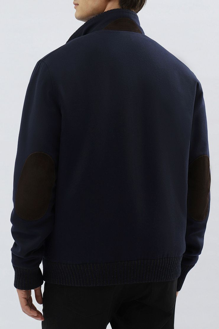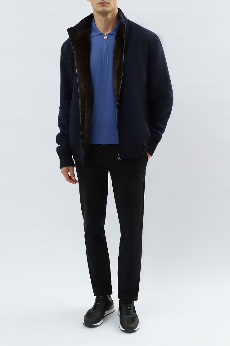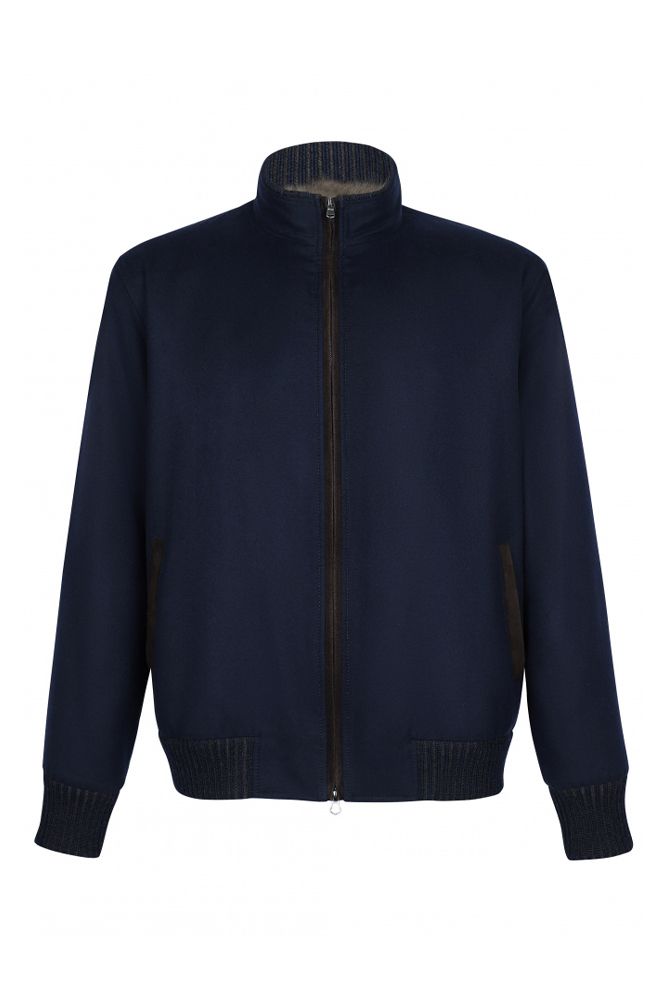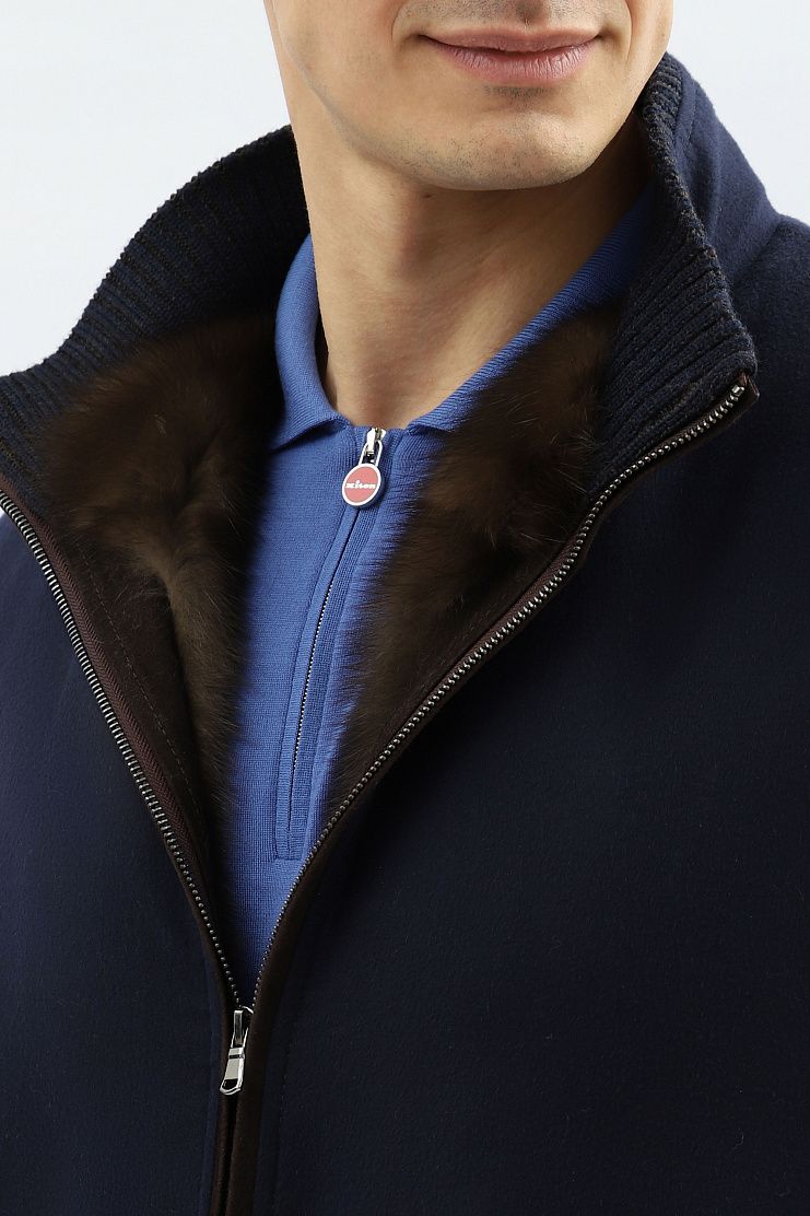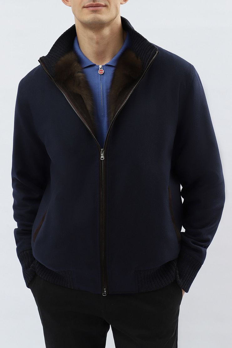 Кашемировый бомбер синего цвета на подкладке из меха соболя идеально подойдет для холодной зимы. Модель с воротником-стойкой, манжетами и нижним краем из трикотажной резинки. Линия молнии и боковые карманы отделаны коричневой замшей.