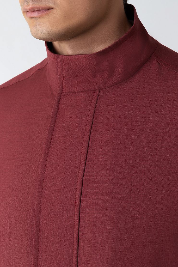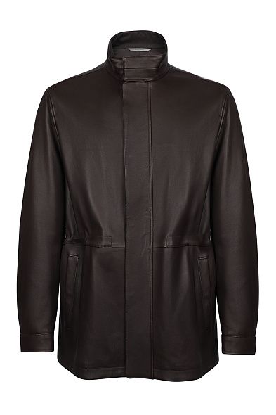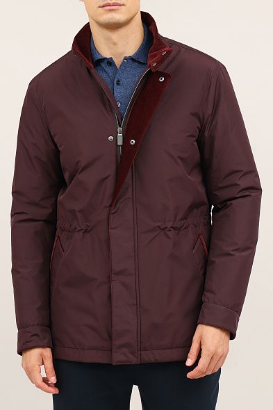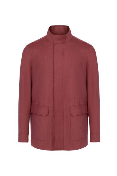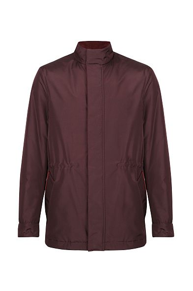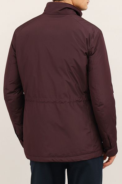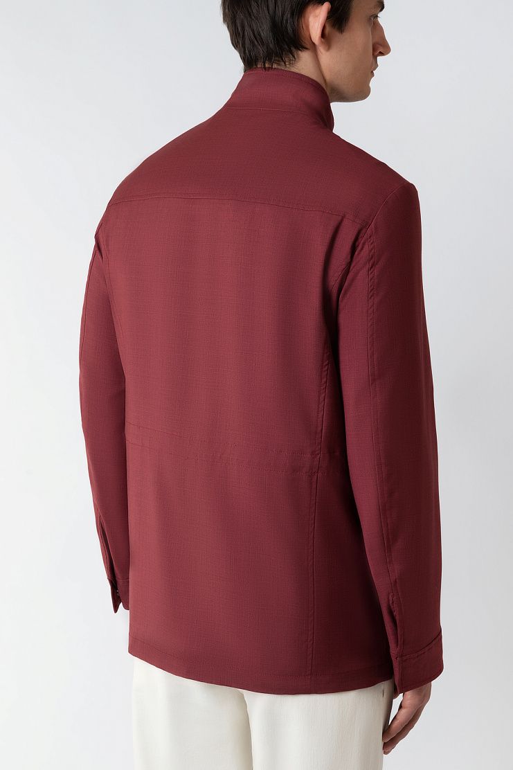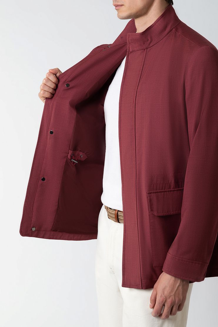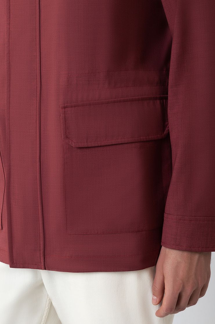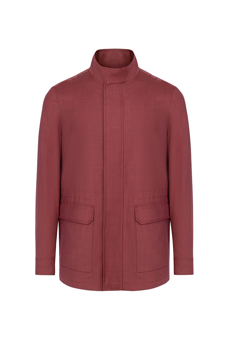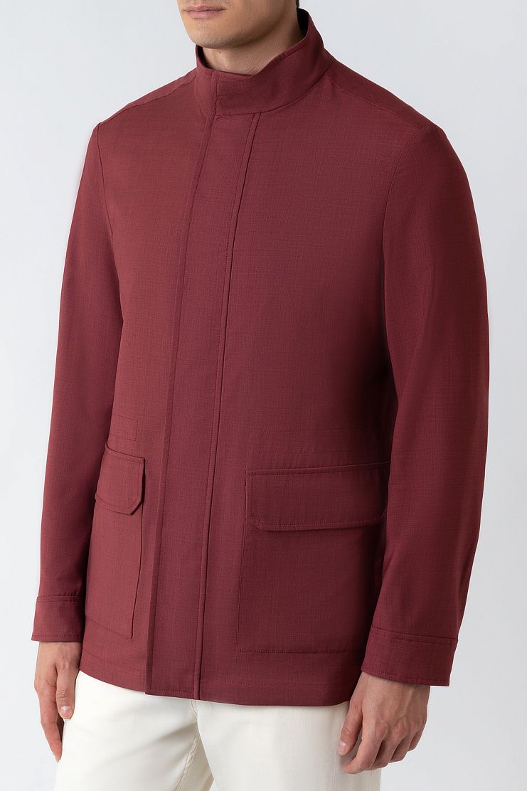 Куртку прямого кроя с воротником-стойкой сшили из тонкой шерсти. Модель дополнена накладными карманами с клапанами и застегивается на кнопки, скрытые под планкой. Потайная кулиска на талии позволяет удобно регулировать посадку по фигуре.