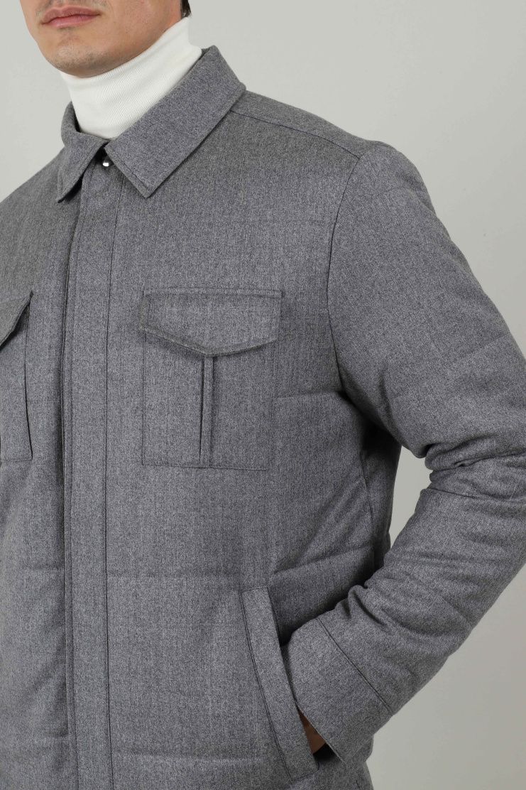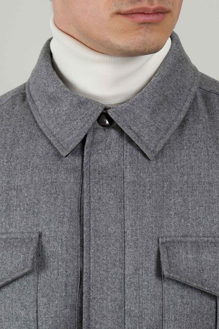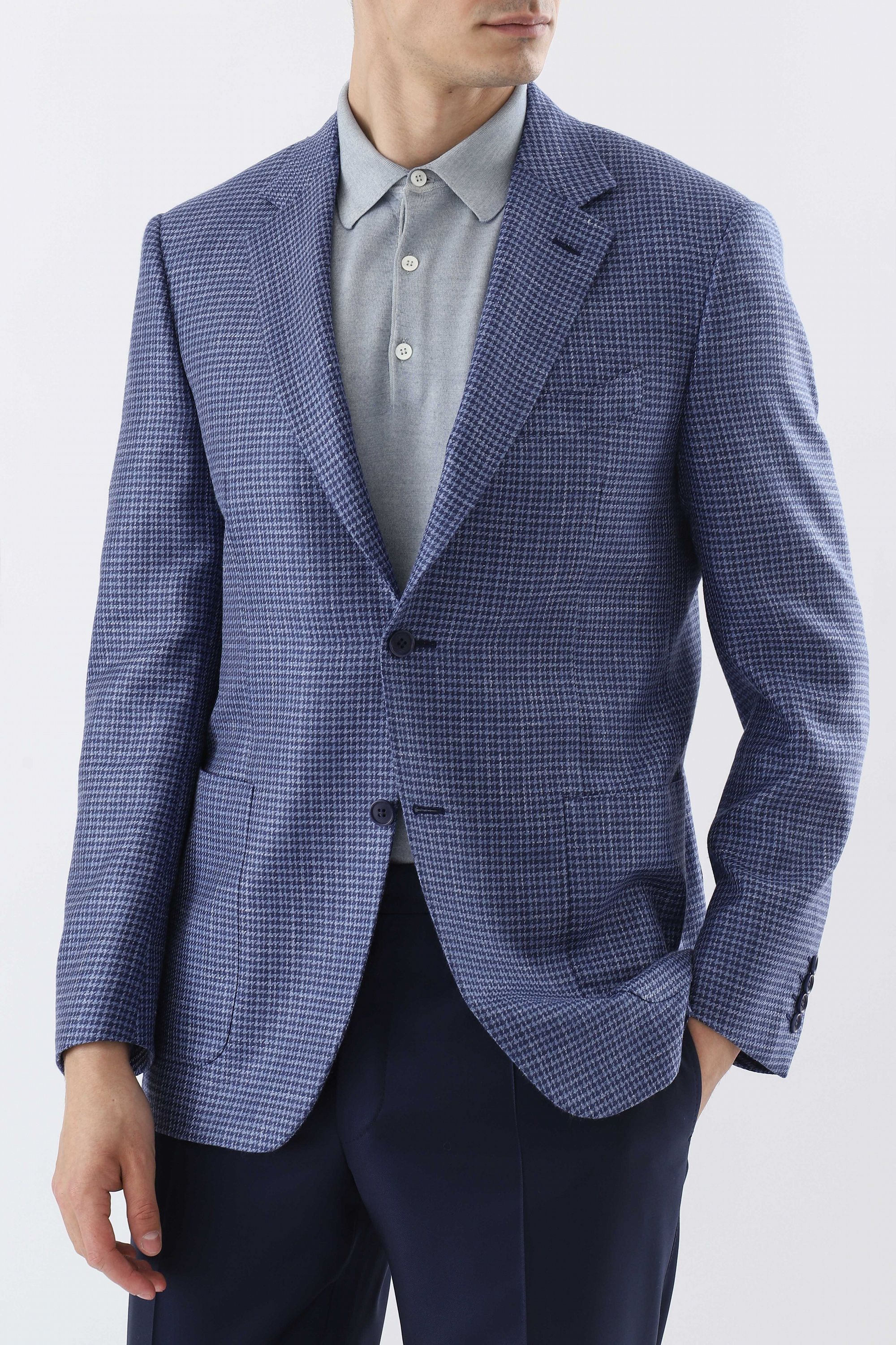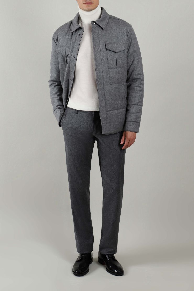 Куртка из меланжевой ткани синего цвета прекрасно соединила в себе повседневную практичность и элегантный стиль. Модель свободного кроя с отложным воротником, нагрудными и боковыми карманами и застежкой на кнопки.
