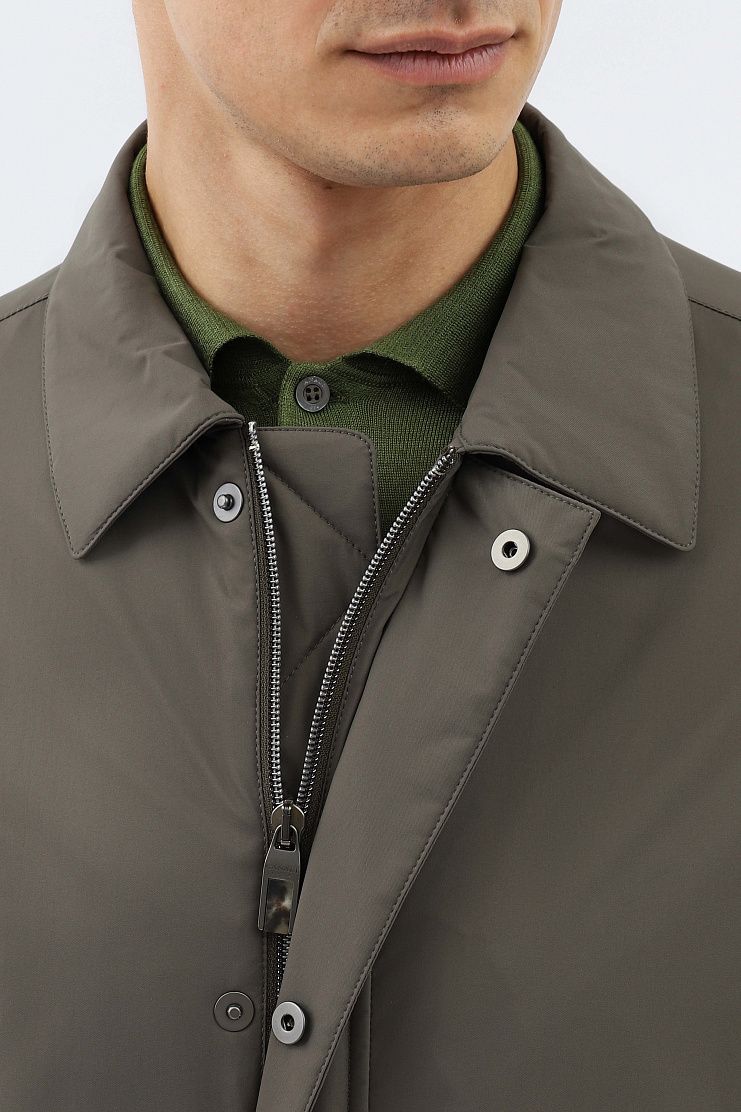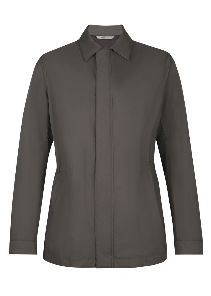 Легкая куртка с отложным воротником и поясом на кулиске. Модель имеет боковые карманы и скрытую застежку на молнию и кнопки.