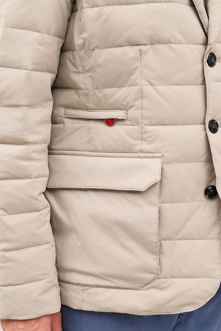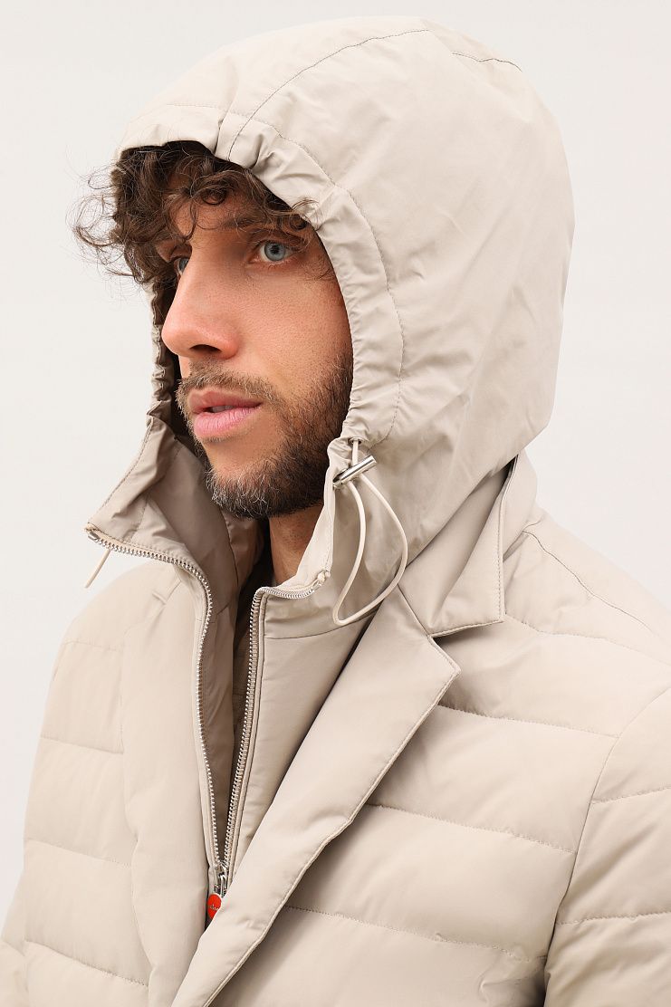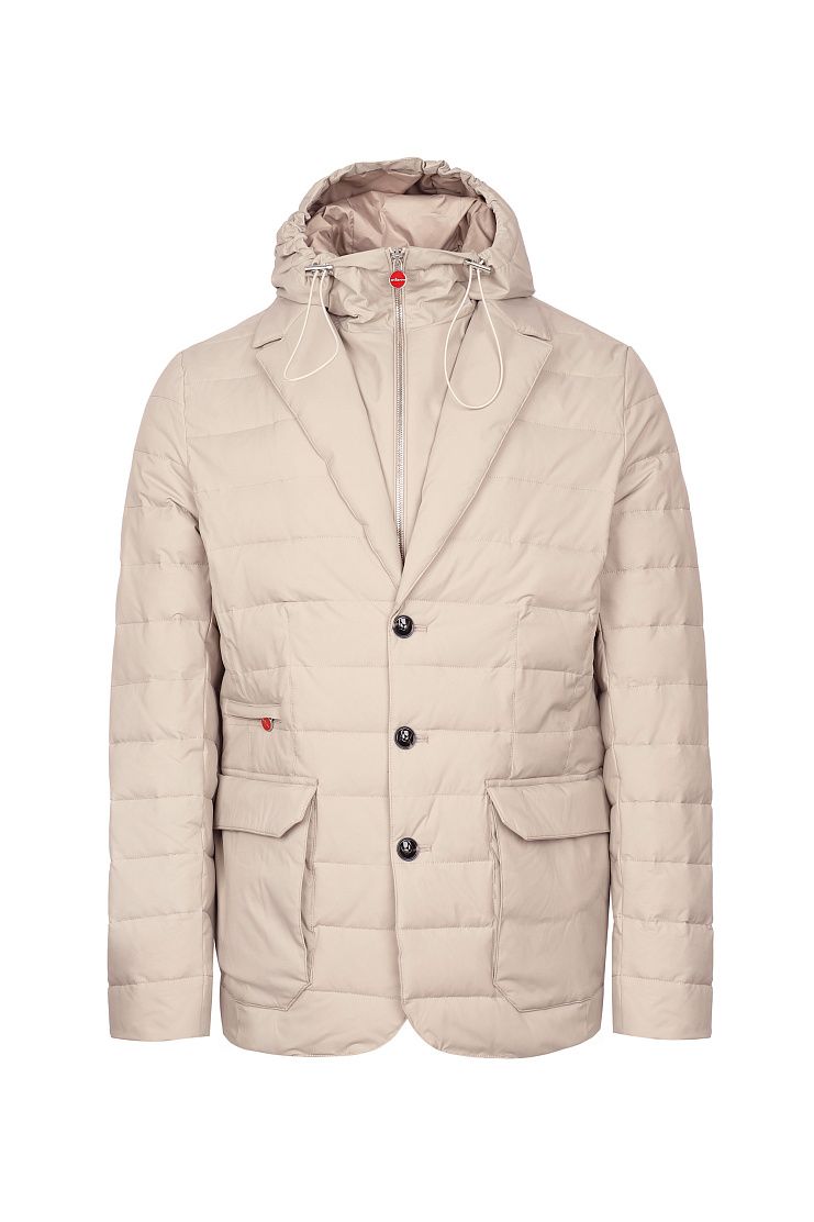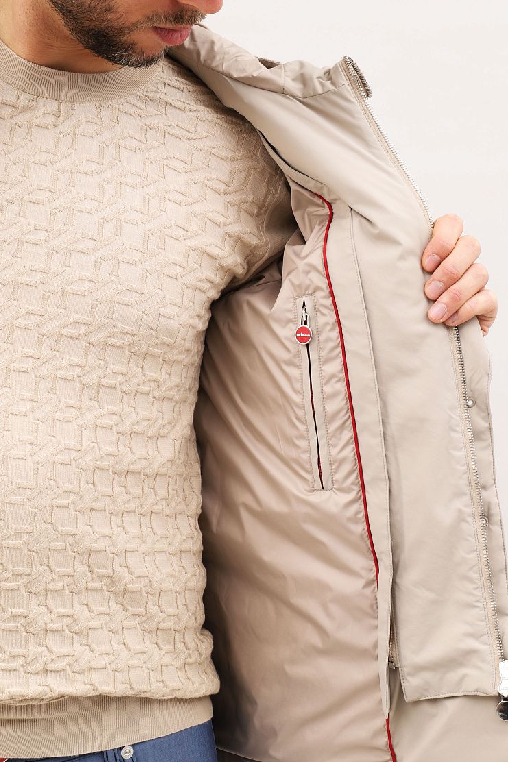 Куртка имеет уникальную способность трансформироваться из повседневного в более элегантный стиль путем отстегивания капюшона и передней части. Модель с боковыми накладными карманами, лацканами и застежкой на молнию с традиционной красной фурнитурой. Изделие на подкладке подойдет для прохладной ветренной погоды.
