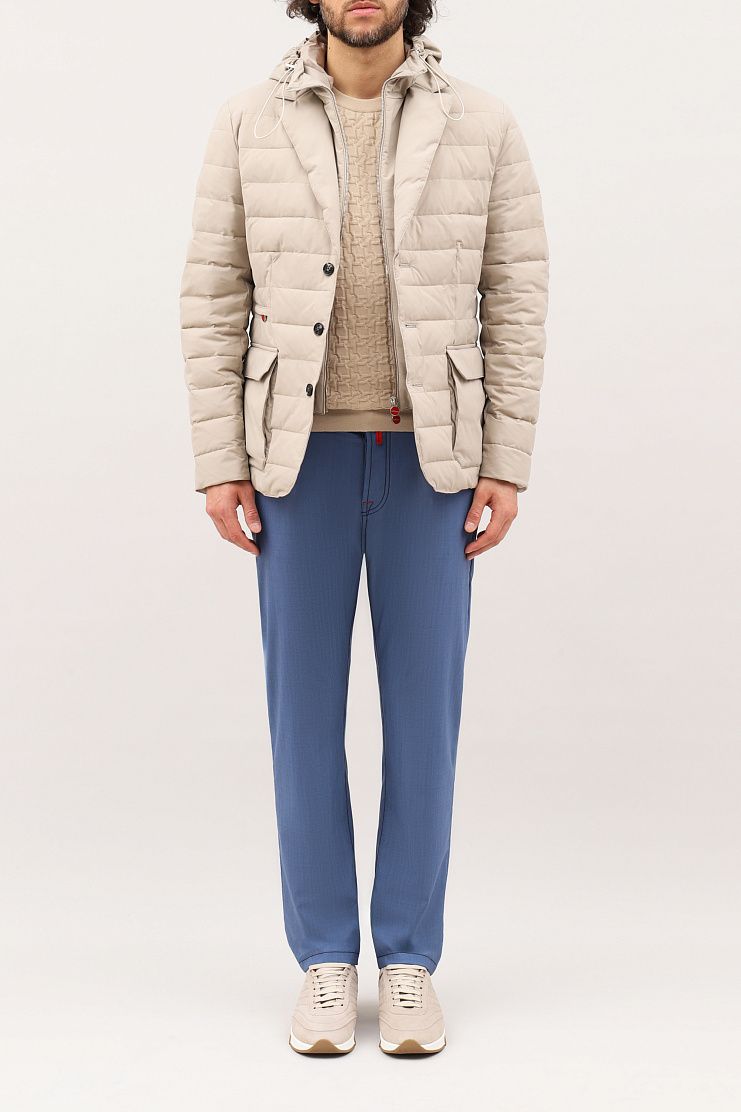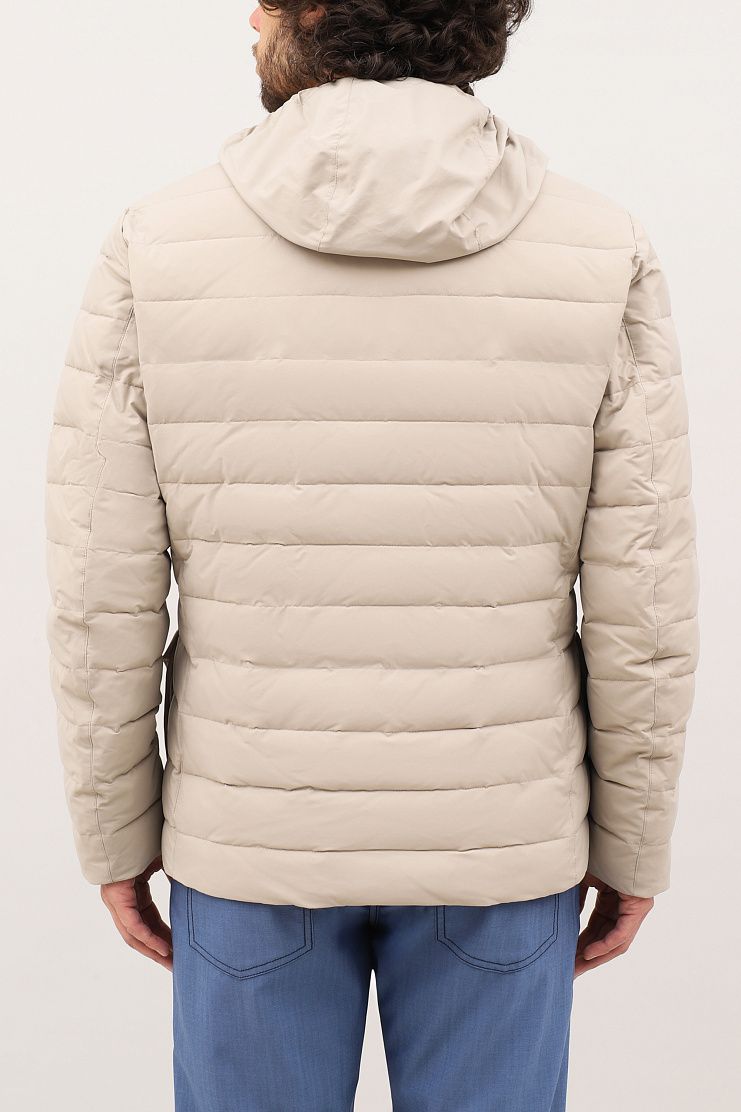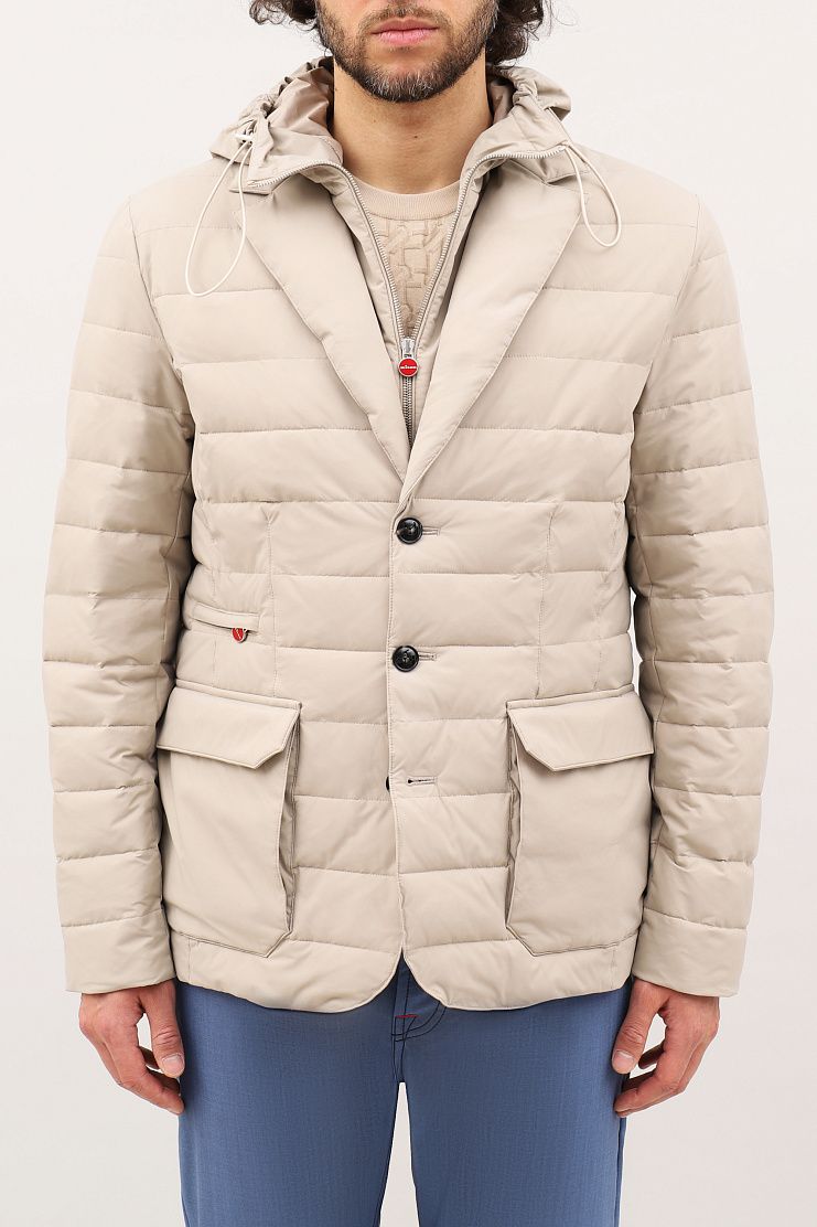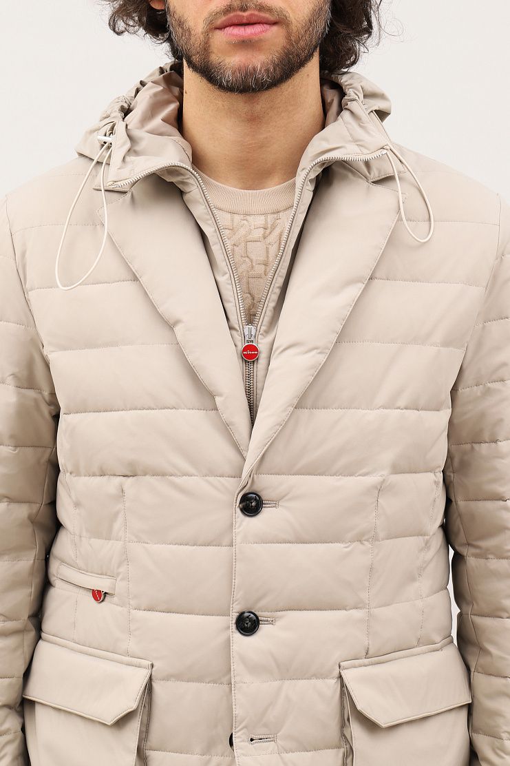 Куртка имеет уникальную способность трансформироваться из повседневного в более элегантный стиль путем отстегивания капюшона и передней части. Модель с боковыми накладными карманами, лацканами и застежкой на молнию с традиционной красной фурнитурой. Изделие на подкладке подойдет для прохладной ветренной погоды.