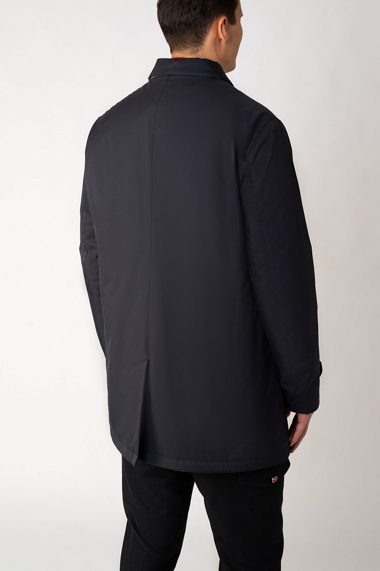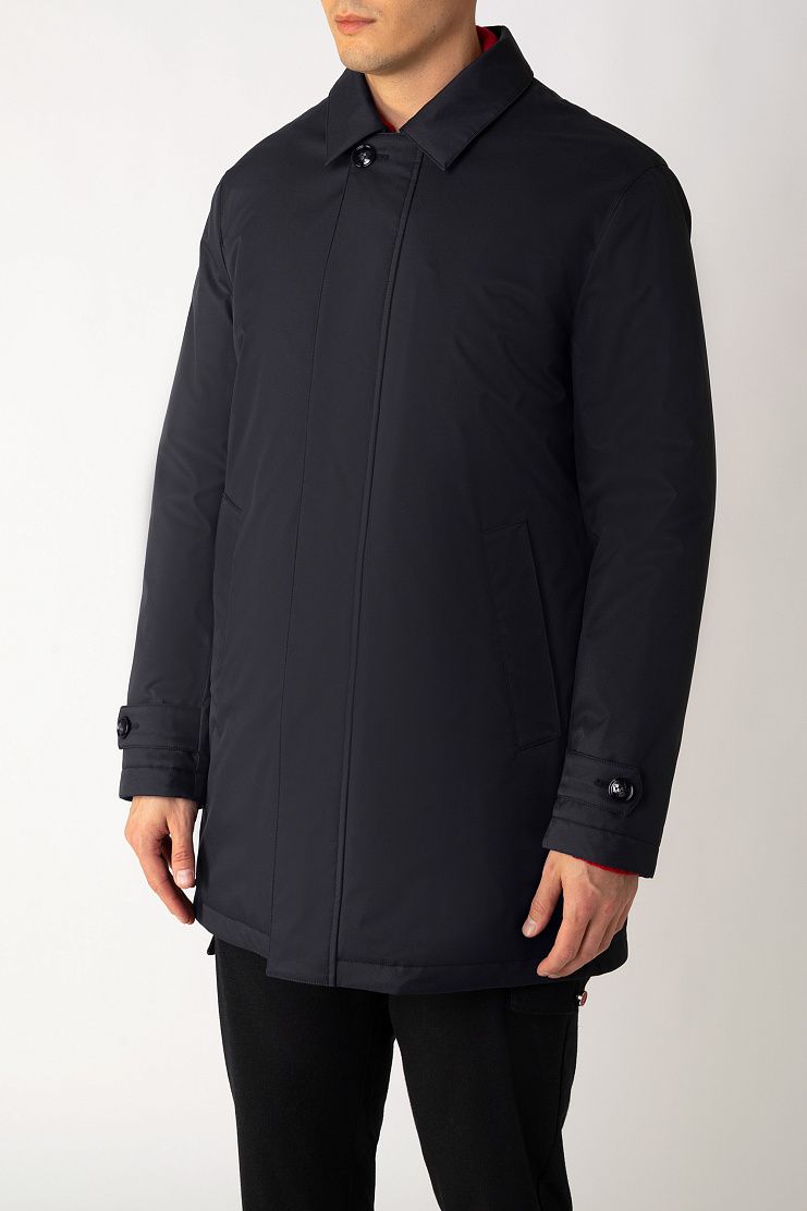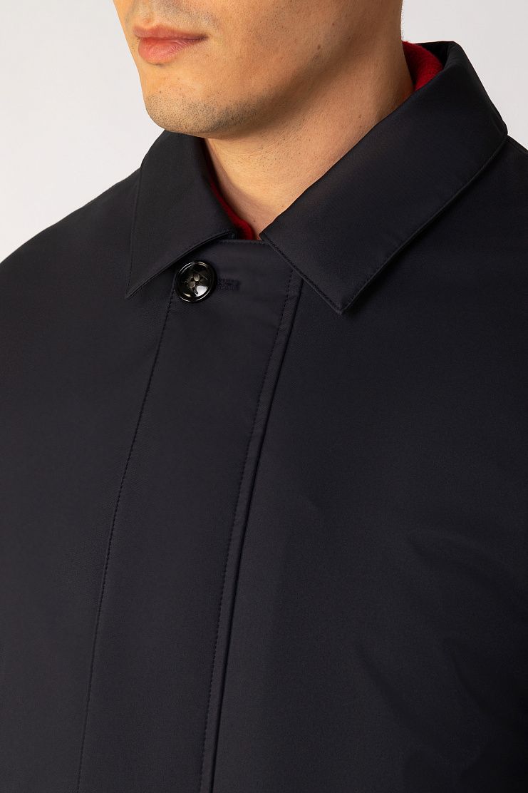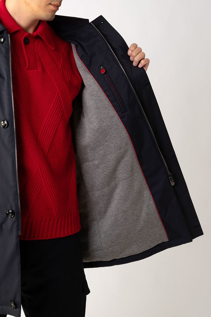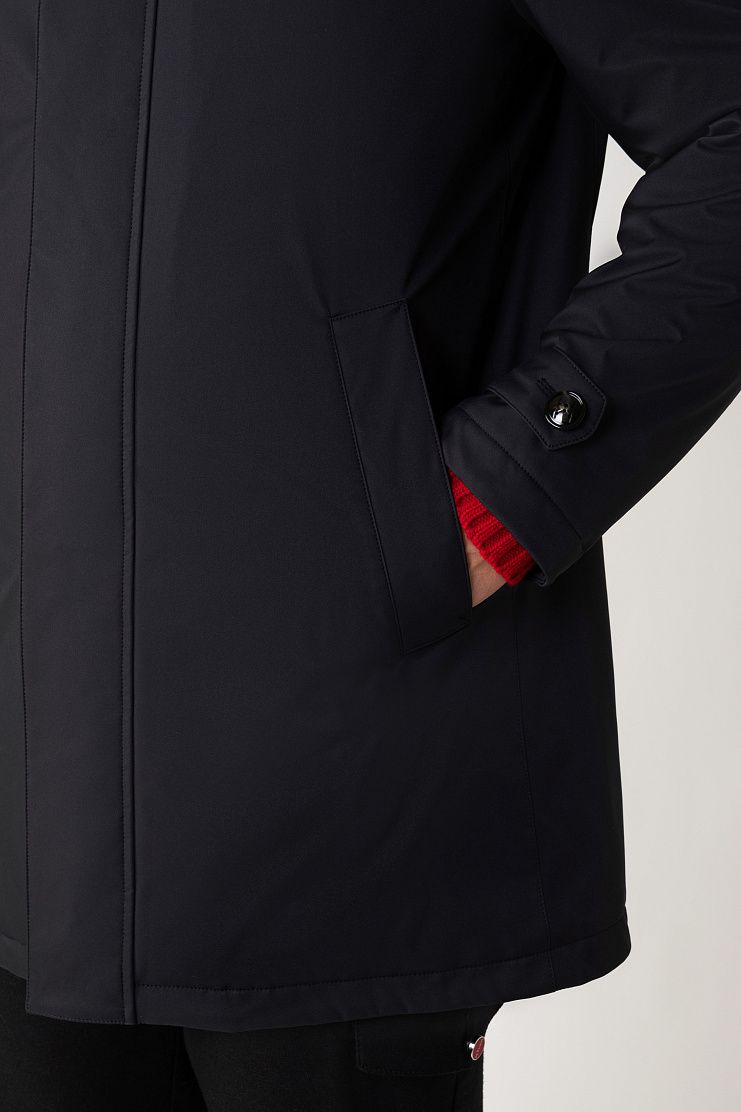 Куртку прямого кроя выполнили из прочного водоотталкивающего полиэстера, дополнив подкладом из мягкого хлопкового трикотажа. Однобортная модель с отложным воротником, внутренним и боковыми карманами застегивается на скрытую под планкой молнию.